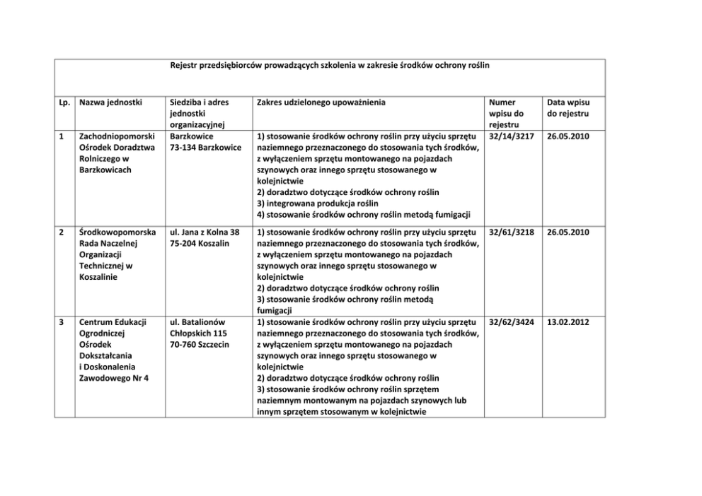 Rejestr przedsiębiorców prowadzących szkolenia w zakresie środków ochrony roślin Lp. Nazwa jednostki Siedziba i adres jednostki organizacyjnej Barzkowice 73-134 Barzkowice Zakres udzielonego upoważnienia 1) stosowanie środków ochrony roślin przy użyciu sprzętu naziemnego przeznaczonego do stosowania tych środków, z wyłączeniem sprzętu montowanego na pojazdach szynowych oraz innego sprzętu stosowanego w kolejnictwie 2) doradztwo dotyczące środków ochrony roślin 3) stosowanie środków ochrony roślin metodą fumigacji 1) stosowanie środków ochrony roślin przy użyciu sprzętu naziemnego przeznaczonego do stosowania tych środków, z wyłączeniem sprzętu montowanego na pojazdach szynowych oraz innego sprzętu stosowanego w kolejnictwie 2) doradztwo dotyczące środków ochrony roślin 3) stosowanie środków ochrony roślin sprzętem naziemnym montowanym na pojazdach szynowych lub innym sprzętem stosowanym w kolejnictwie 1 Zachodniopomorski Ośrodek Doradztwa Rolniczego w Barzkowicach 2 Środkowopomorska Rada Naczelnej Organizacji Technicznej w Koszalinie ul. Jana z Kolna 38 75-204 Koszalin 3 Centrum Edukacji Ogrodniczej Ośrodek Dokształcania i Doskonalenia Zawodowego Nr 4 ul. Batalionów Chłopskich 115 70-760 Szczecin 1) stosowanie środków ochrony roślin przy użyciu sprzętu naziemnego przeznaczonego do stosowania tych środków, z wyłączeniem sprzętu montowanego na pojazdach szynowych oraz innego sprzętu stosowanego w kolejnictwie 2) doradztwo dotyczące środków ochrony roślin 3) integrowana produkcja roślin 4) stosowanie środków ochrony roślin metodą fumigacji Numer wpisu do rejestru 32/14/3217 Data wpisu do rejestru 32/61/3218 26.05.2010 32/62/3424 13.02.2012 26.05.2010 4. Europejskie Centrum Edukacji i Turystyki Ośrodek Kursów i Szkoleń Agencja Zatrudnienia Leszek Czubiński ul. Gdyńska 16, 78-500 Drawsko Pomorskie 5. Europejskie Centrum Edukacyjne Spółka z o.o. ul. T. Chałubińskiego 15, 75-581 Koszalin 1) stosowanie środków ochrony roślin przy użyciu sprzętu naziemnego przeznaczonego do stosowania tych środków, z wyłączeniem sprzętu montowanego na pojazdach szynowych oraz innego sprzętu stosowanego w kolejnictwie 2) doradztwo dotyczące środków ochrony roślin 3) integrowana produkcja roślin 4) stosowanie środków ochrony roślin metodą fumigacji 5) stosowanie środków ochrony roślin sprzętem agrolotniczym 6) stosowanie środków ochrony roślin sprzętem naziemnym montowanym na pojazdach szynowych lub innym sprzętem stosowanym w kolejnictwie 1) stosowanie środków ochrony roślin przy użyciu sprzętu naziemnego przeznaczonego do stosowania tych środków, z wyłączeniem sprzętu montowanego na pojazdach szynowych oraz innego sprzętu stosowanego w kolejnictwie 2) doradztwo dotyczące środków ochrony roślin 3) integrowana produkcja roślin 4) stosowanie środków ochrony roślin metodą fumigacji 5) stosowanie środków ochrony roślin sprzętem agrolotniczym 6) stosowanie środków ochrony roślin sprzętem naziemnym montowanym na pojazdach szynowych lub innym sprzętem stosowanym w kolejnictwie 7) badania sprawności technicznej sprzętu naziemnego przeznaczonego do stosowania środków ochrony roślin 8) badania sprawności technicznej sprzętu agrolotniczego przeznaczonego do stosowania środków ochrony roślin 32/03/3920 17.11.2016 32/61/3921 25.11.2016 6. EKSPERT-SITR Sp. z o.o. ul. Jana z Kolna 38, 75-204 Koszalin 1) stosowanie środków ochrony roślin przy użyciu sprzętu naziemnego przeznaczonego do stosowania tych środków, z wyłączeniem sprzętu montowanego na pojazdach szynowych oraz innego sprzętu stosowanego w kolejnictwie 2) doradztwo dotyczące środków ochrony roślin 3) integrowana produkcja roślin 4) stosowanie środków ochrony roślin metodą fumigacji 5) stosowanie środków ochrony roślin sprzętem agrolotniczym 6) stosowanie środków ochrony roślin sprzętem naziemnym montowanym na pojazdach szynowych lub innym sprzętem stosowanym w kolejnictwie 7) badania sprawności technicznej sprzętu naziemnego przeznaczonego do stosowania środków ochrony roślin 8) badania sprawności technicznej sprzętu agrolotniczego przeznaczonego do stosowania środków ochrony roślin 32/61/3942 20.02.2017