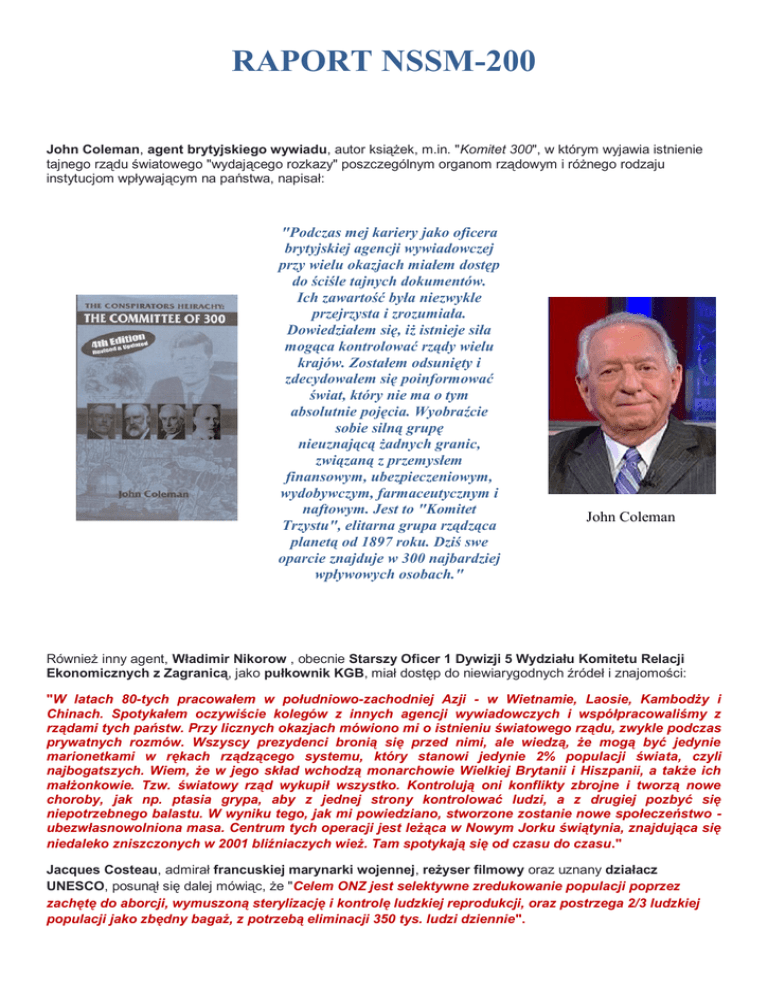 RAPORT NSSM-200 John Coleman, agent brytyjskiego wywiadu, autor książek, m.in. "Komitet 300", w którym wyjawia istnienie tajnego rządu światowego "wydającego rozkazy" poszczególnym organom rządowym i różnego rodzaju instytucjom wpływającym na państwa, napisał: "Podczas mej kariery jako oficera brytyjskiej agencji wywiadowczej przy wielu okazjach miałem dostęp do ściśle tajnych dokumentów. Ich zawartość była niezwykle przejrzysta i zrozumiała. Dowiedziałem się, iż istnieje siła mogąca kontrolować rządy wielu krajów. Zostałem odsunięty i zdecydowałem się poinformować świat, który nie ma o tym absolutnie pojęcia. Wyobraźcie sobie silną grupę nieuznającą żadnych granic, związaną z przemysłem finansowym, ubezpieczeniowym, wydobywczym, farmaceutycznym i naftowym. Jest to "Komitet Trzystu", elitarna grupa rządząca planetą od 1897 roku. Dziś swe oparcie znajduje w 300 najbardziej wpływowych osobach." John Coleman Również inny agent, Władimir Nikorow , obecnie Starszy Oficer 1 Dywizji 5 Wydziału Komitetu Relacji Ekonomicznych z Zagranicą, jako pułkownik KGB, miał dostęp do niewiarygodnych źródeł i znajomości: "W latach 80-tych pracowałem w południowo-zachodniej Azji - w Wietnamie, Laosie, Kambodży i Chinach. Spotykałem oczywiście kolegów z innych agencji wywiadowczych i współpracowaliśmy z rządami tych państw. Przy licznych okazjach mówiono mi o istnieniu światowego rządu, zwykle podczas prywatnych rozmów. Wszyscy prezydenci bronią się przed nimi, ale wiedzą, że mogą być jedynie marionetkami w rękach rządzącego systemu, który stanowi jedynie 2% populacji świata, czyli najbogatszych. Wiem, że w jego skład wchodzą monarchowie Wielkiej Brytanii i Hiszpanii, a także ich małżonkowie. Tzw. światowy rząd wykupił wszystko. Kontrolują oni konflikty zbrojne i tworzą nowe choroby, jak np. ptasia grypa, aby z jednej strony kontrolować ludzi, a z drugiej pozbyć się niepotrzebnego balastu. W wyniku tego, jak mi powiedziano, stworzone zostanie nowe społeczeństwo ubezwłasnowolniona masa. Centrum tych operacji jest leżąca w Nowym Jorku świątynia, znajdująca się niedaleko zniszczonych w 2001 bliźniaczych wież. Tam spotykają się od czasu do czasu." Jacques Costeau, admirał francuskiej marynarki wojennej, reżyser filmowy oraz uznany działacz UNESCO, posunął się dalej mówiąc, że "Celem ONZ jest selektywne zredukowanie populacji poprzez zachętę do aborcji, wymuszoną sterylizację i kontrolę ludzkiej reprodukcji, oraz postrzega 2/3 ludzkiej populacji jako zbędny bagaż, z potrzebą eliminacji 350 tys. ludzi dziennie". Jacques Costeau z prezydentem Kennedy'm. Czy globalna agenda rzeczywiście planuje coś podobnego? Henry Kissinger przekazał do wysokich zarządów Stanów Zjednoczonych protokół NSSM 200 (link). Raport ten ukazuje (nie bezpośrednio) jak ma wyglądać planowany od lat rząd światowy. Pokazuje on, jak bardzo marionetkowe jest stanowisko prezydenta w stosunku do różnych organizacji. Czytając go, włos jeży się na głowie... Treść raportu http://wlym.com/text/NSSM200.htm Program realizowania kontroli populacji przez ONZ http://www.un.org/en/development/devagenda/population.shtml http://www.un.org/popin/icpd/conference/bkg/wppa.html Raport ten mówi o celowym podtrzymywaniu głodu w regionach trzeciego świata. Szybki wzrost demograficzny i brak higieny sprzyja rozprzestrzenianiu się epidemii, rozbijaniu rodzin i konieczności wzrastania długu pod wpływem prymitywnych warunków pracy, braku mechanizacji i rolnictwa ekstensywnego. Odbywa się to za sprawą Międzynarodowego Funduszu Walutowego, Banku Światowego i Centralnego Banku Światowych Rozrachunków. Prognozy ONZ, któremu specjalnie na tę okazję miliard dolarów wpłaciło Monsanto, dotyczące przyrostu naturalnego pomagające globalistycznym agentom w regulowaniu ilości szkodliwej żywności na rynku zmniejszającej płodność, w krajach gdzie na domiar złego panuje społeczeństwo konsumpcyjne przy sprzyjającym dla globalistów i korporacji zniżaniu przez prezydenta USA edukacji na możliwie najniższy poziom, zwłaszcza dla kobiet, jest centralnym punktem zarządzania rozwoju globalnego planu. To skutkuje degradacją środowiska, odbijającej się bezpośrednio na obszarach bogatych w surowce, które Stany Zjednoczone przejmują siłą, przy okazji redukując populację w wyniku lokalnych wojen. Przyczyną jest rabunkowa gospodarka surowcami i przenoszenie szkodliwych gałęzi przemysłu z krajów wysoko rozwiniętych. O tym samym pisał też John Coleman w swojej książce: "Energetyka nuklearna jest tanim zródłem energii dla Krajów Trzeciego Swiata, które stopniowo uniezależniają sie od USA, od wielkich korporacji paliw płynnych, tym samym budując podstawy swojej suwerenności państwowej i gospodarczej. Energia nuklearna jest kluczem do paliwowej emancypacji, wychodzenia ze stanu zacofania narzuconego im przez Komitet 300. To wyjaśnia powody groźby Kissingera pod adresem A. Bhutto i przyczyne jego zabójstwa. Narody państw ubogich, zadłużonych u gangsterów finansowych, są oficjalnie rzekomo wspierane tak zwaną pomocą USA dla zagranicy. To kolejny oszukańczy mit. Dobrym przykladem jest Zimbabwe. Wysokiej jakości ruda chromu z tego kraju jest kontrolowana przez „pomoc” międzynarodową. Prawda jest następująca: międzynarodowa korporacja wydobywcza LONHRO, zarządzana przez Angusa OgiMe, ważnego członka Komitetu 300 z ramienia królowej Elżbiety II, posiada całkowitą kontrolę nad zasobami naturalnymi tego i innych sąsiednich krajów, podczas gdy ich prawowici właściciele, narody tych krajów, toną w długach i biedzie. (...) Specjalnym zainteresowaniem Komitetu 300 cieszy się polityka ekonomiczna oparta na naukach Malthusa, syna angielskiego pastora, wyniesionego do sławy przez British East India Company – agendy Komitetu. To na personalnej bazie tej własni
