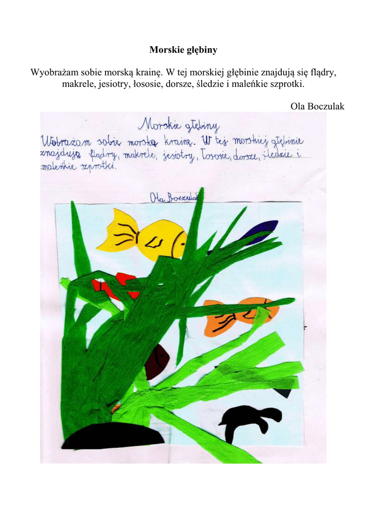 Morskie głębiny Wyobrażam sobie morską krainę. W tej morskiej głębinie znajdują się flądry, makrele, jesiotry, łososie, dorsze, śledzie i maleńkie szprotki. Ola Boczulak Morskie głębiny Tak wyobrażam sobie morskie głębiny, w których żyją rybki, delfiny i ośmiornice. Są tam różne rośliny, na przykład: wodorosty, moczarka karadyńska i rogatek pospolity. Warto przyjechać nad morze. Roksana Gago Podwodny świat Tak wyobrażam sobie „Podwodny świat”. Żyją w niej delfiny, ośmiornice i flądry, śledzie i makrele. Podwodny świat jest bardzo ciekawy. Weronika Kulesza Morska kraina Tak wyobrażam sobie morską krainę. W tym morzu żyją ryby różnych gatunków, na przykład: stynki, szczupaki, śledzie, flądry. Rosną rośliny podwodne: moczarka kanadyjska, rogatek pospolity i wywłócznik. Eryk Rykała Morskie głębiny Tak wyobrażam sobie „Morskie głębiny”. Żyją tam delfiny, foki, flądry, makrele i szczupaki. Wygląda tak: ma bramę, wodorosty, muszle, kamyki. Rosną rośliny podwodne: moczarka kanadyjska, rogatek pospolity, wywłócznik. Mateusz Michalczuk Tajemnice morza Tak wyobrażam sobie tajemnice morza. Wygląda ono tak: są tam duże i małe kamienie, są też różne ryby, na przykład: flądra, łosoś, szczupak i okoń. Są też różne kształty wodorostów. Rosną rośliny podwodne: moczarka kanadyjska, rogatek pospolity, wywłócznik. Nikola Serafin Morska kraina Tak wyobrażam sobie morską krainę. Mogę zobaczyć tysiące ryb. W morskiej krainie żyją flądry, makrele, szczupaki i śledzie. Są wodorosty różnych kształtów, są muszle ciekawe i kamienie. Wiktoria Smoczek Morska kraina Tak wyobrażam sobie morską krainę, gdzie w wodzie żyją małe rybki, śledzie i szczupaki. Są wodorosty, gwiazdy i muszelki. Kuba Szałek Morska kraina Tak ja sobie wyobrażam. Wszędzie pływają żółwie morskie, koniki morskie. Jest dużo różnych roślin, wodorostów. Kacper Szczerba Morska kraina Tak wyobrażam sobie morską krainę, w której żyją: makrela, łososie, dorsze, flądry, śledzie i różne inne gatunki ryb. W morskiej krainie są także różne gatunki glonów. Rosną rośliny podwodne: moczarka kanadyjska, rogatek pospolity, wywłócznik. Remigiusz Wilemski