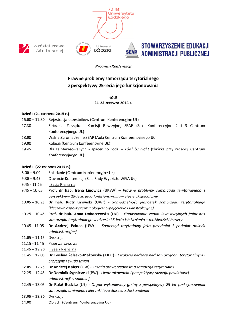 Program Konferencji Prawne problemy samorządu terytorialnego z perspektywy 25-lecia jego funkcjonowania Łódź 21-23 czerwca 2015 r. Dzień I (21 czerwca 2015 r.) 16.00 – 17.30 Rejestracja uczestników (Centrum Konferencyjne UŁ) 17.30 Zebrania Zarządu i Komisji Rewizyjnej SEAP (Sale Konferencyjne 2 i 3 Centrum Konferencyjnego UŁ) 18.00 Walne Zgromadzenie SEAP (Aula Centrum Konferencyjnego UŁ) 19.00 Kolacja (Centrum Konferencyjne UŁ) 19.45 Dla zainteresowanych - spacer po Łodzi – Łódź by night (zbiórka przy recepcji Centrum Konferencyjnego UŁ) Dzień II (22 czerwca 2015 r.) 8.00 – 9.00 Śniadanie (Centrum Konferencyjne UŁ) 9.30 – 9.45 Otwarcie Konferencji (Sala Rady Wydziału WPiA UŁ) 9.45 - 11.15 I Sesja Plenarna 9.45 – 10.05 Prof. dr hab. Irena Lipowicz (UKSW) – Prawne problemy samorządu terytorialnego z perspektywy 25-lecia jego funkcjonowania – ujęcie aksjologiczne 10.05 – 10.25 Dr hab. Piotr Lisowski (UWr) - Samodzielność jednostek samorządu terytorialnego (kluczowe aspekty terminologiczno-pojęciowe i konstrukcyjne) 10.25 – 10.45 Prof. dr hab. Anna Dobaczewska (UG) - Finansowanie zadań inwestycyjnych jednostek samorządu terytorialnego w okresie 25-lecia ich istnienia – możliwości i bariery 10.45 - 11.05 Dr Andrzej Pakuła (UWr) - Samorząd terytorialny jako przedmiot i podmiot polityki administracyjnej 11.05 – 11.15 Dyskusja 11.15 - 11.45 Przerwa kawowa 11.45 – 13.30 II Sesja Plenarna 11.45 – 12.05 Dr Ewelina Żelasko-Makowska (AJDC) - Ewolucja nadzoru nad samorządem terytorialnym przyczyny i skutki zmian 12.05 – 12.25 Dr Andrzej Nałęcz (UW) - Zasada praworządności a samorząd terytorialny 12.25 – 12.45 Dr Dominik Sypniewski (PW) - Uwarunkowania i perspektywy rozwoju powiatowej administracji zespolonej 12.45 – 13.05 Dr Rafał Budzisz (UŁ) - Organ wykonawczy gminy z perspektywy 25 lat funkcjonowania samorządu gminnego i kierunki jego dalszego doskonalenia 13.05 – 13.30 Dyskusja 14.00 Obiad (Centrum Konferencyjne UŁ) 15.00-19.00 20.00 Wycieczka autokarowa: Fenomen Łodzi wielokulturowej (zbiórka przy recepcji Centrum Konferencyjne UŁ) Uroczysta kolacja (Centrum Konferencyjne UŁ) Dzień III (23 czerwca 2015 r.) 8.00 – 9.00 Śniadanie (Centrum Konferencyjne UŁ) 9.00 – 11.00 III Sesja Plenarna (Centrum Konferencyjne UŁ) 9.00 – 9.20 mgr Anna Małkowska (PW) - Rola gminy w ochronie zabytków nieruchomych ze szczególnym uwzględnieniem funkcji gminy w kształtowaniu ustaleń ochrony w miejscowym planie zagospodarowania przestrzennego 9.20 – 9.40 Dr Maciej Kruś (UAMP), Dr Marcin Princ (UAMP) - Problematyka zakresu zadań gminy w odniesieniu do obowiązku przejęcia byłych dróg krajowych 9.40 – 10.00 Dr Przemysław Niemczuk (WSPARP), mgr Lech Żukowski (WSPARP) - Doświadczenia samorządów lokalnych ze współpracy międzynarodowej - na przykładzie woj. Podkarpackiego 10.00 – 10.20 Mgr Paulina Łazutka (UŁ) - 25 lat współdziałania jednostek samorządu terytorialnego w Polsce w formie związku celowego. Analiza obecnego stanu prawnego i postulaty de lege ferenda 10.20 – 10.40 Dr hab. Rafał Sura (KUL) - Samorządowe Kolegia Odwoławcze z perspektywy 25 lat przemian ustrojowych w Polsce 10.40 – 11.00 Dyskusja 11.00 - 11.30 Przerwa kawowa 11.30 – 13.00 IV Sesja Plenarna (Centrum Konferencyjne UŁ) 11.30 – 11.50 Prof. dr hab. Jerzy Stelmasiak (UMCS), Prof. dr hab. Leszek Bielecki (WSEPiNM) - Akty prawa miejscowego sejmiku województwa w zakresie ochrony przyrody 11.50 – 12.10 Dr Łukasz Kamiński (UŁ) - Administracja samorządowa wobec zgromadzeń. Węzłowe problemy administracyjnoprawnego nadzoru nad zgromadzeniami w dwudziestopięciolecie funkcjonowania samorządu terytorialnego 12.10 – 12.30 Dr Jarosław Czerw (WSEIL) - Organy powiatu w praktyce funkcjonowania rad i zarządów powiatów w wybranych powiatach 13.00 – 13.15 Ogłoszenie wyników Konkursu na nagrodę naukową za najlepszy referat i wręczenie nagród SEAP*. 13.15 – 13.30 Zamknięcie konferencji 13.30 Obiad (Centrum Konferencyjne UŁ) * Sponsorem nagród w Konkursie SEAP jest Adresy: Wydział Prawa i Administracji UŁ, ul. Kopińskiego 8/12 , Łódź Centrum Konferencyjne UŁ, ul. Kopińskiego 16/18, Łódź Parking: Ze względu na ograniczoną liczbę miejsc na parkingu przy Centrum Konferencyjnym UŁ proponujemy Państwu możliwość bezpłatnego parkowania na parkingu Wydziału Prawa i Administracji UŁ (wjazd zarówno od ul. Pomorskiej, jak i ul. Kopcińskiego) ok. 350 metrów od Centrum Konferencyjnego wzdłuż ul. Kopcińskiego.