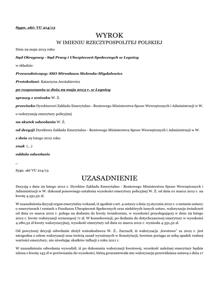 Sygn. akt: VU 214/13 WYROK W IMIENIU RZECZYPOSPOLITEJ POLSKIEJ Dnia 29 maja 2013 roku Sąd Okręgowy - Sąd Pracy i Ubezpieczeń Społecznych w Legnicy w składzie: Przewodniczący: SSO Mirosława Molenda-Migdalewicz Protokolant: Katarzyna Awsiukiewicz po rozpoznaniu w dniu 29 maja 2013 r. w Legnicy sprawy z wniosku W. Ż. przeciwko Dyrektorowi Zakładu Emerytalno - Rentowego Ministerstwa Spraw Wewnętrznych i Administracji w W. o waloryzację emerytury policyjnej na skutek odwołania W. Ż. od decyzji Dyrektora Zakładu Emerytalno - Rentowego Ministerstwa Spraw Wewnętrznych i Administracji w W. z dnia 29 lutego 2012 roku znak (...) oddala odwołanie _ Sygn. akt VU 214/13 UZASADNIENIE Decyzją z dnia 29 lutego 2012 r. Dyrektor Zakładu Emerytalno - Rentowego Ministerstwa Spraw Wewnętrznych i Administracji w W. dokonał ponownego ustalenia wysokości emerytury policyjnej W. Ż. od dnia 01 marca 2012 r. na kwotę 4.351,52 zł. W uzasadnienia decyzji organ emerytalny wskazał, iż zgodnie z art. 4 ustawy z dnia 13 stycznia 2012 r. o zmianie ustawy o emeryturach i rentach z Funduszu Ubezpieczeń Społecznych oraz niektórych innych ustaw, waloryzacja świadczeń od dnia 01 marca 2012 r. polega na dodaniu do kwoty świadczenia, w wysokości przysługującej w dniu 29 lutego 2012 r. kwoty waloryzacji wynoszącej 71 zł. W konsekwencji, po dodaniu do dotychczasowej emerytury w wysokości 4.280,52 zł kwoty waloryzacyjnej, wysokość emerytury od dnia 01 marca 2012 r. wyniosła 4.351,52 zł. Od powyższej decyzji odwołanie złożył wnioskodawca W. Ż.. Zarzucił, iż waloryzacja „kwotowa” za 2012 r. jest niezgodna z celem waloryzacji oraz treścią zasad wyrażonych w Konstytucji, bowiem pociąga ze sobą spadek realnej wartości emerytury, nie niwelując skutków inflacji z roku 2011 r. W uzasadnieniu odwołania wywodził, iż po dokonaniu waloryzacji kwotowej, wysokość należnej emerytury będzie niższa o kwotę 143 zł w porównaniu do wysokości, którą gwarantowała mu waloryzacja przewidziana ustawą z dnia 17 grudnia 1998 o emeryturach i rentach z Funduszu Ubezpieczeni Społecznych. Zarzucił, że konsekwencją stosowania waloryzacji kwotowej jest trwałe obniżanie się wysokości emerytury w kolejnych latach z uwagi na obniżenie podstawy wymiaru świadczenia. Powołując się na powyższe, wnioskodawca wniósł o uchylenie zaskarżonej decyzji. W oparciu o treść art. 77 konstytucji W. Ż.domagał się zasądzenia odszkodowania za niezgodne z prawem działanie organu władzy publicznej. We wniosku alternatywnym, w razie nierozstrzygnięcia przez Trybunał Konstytucyjny do czasu rozpoznania niniejszej sprawy, zawisłej przed nim sprawy sygn. akt K 9/12 o stwierdzenie niezgodności z Konstytucją RP ustawy z dnia 13 stycznia 2012 r. o zmianie ustawy o emeryturach i rentach z Funduszu Ubezpieczeń Społecznych oraz niektórych innych ustaw, wniósł o przedstawienie Trybunałowi Konstytucyjnemu przez Sąd w trybie art. 193 Konstytucji pytania prawnego, co do zgodności wymienionego aktu normatywnego z art. 2, art. 32 ust. 1 i art. 67 ust. 1 Konstytucji. W odpowiedzi na odwołanie, Dyrektor Zakładu Emerytalno – Rentowego Ministerstwa Spraw Wewnętrznych i Administracji w W., wniósł o jego oddalenie. Argumentował że stosownie do treści art. 6 ustawy z dnia 18 lutego 1994 r. o zaopatrzeniu emerytalnym funkcjonariuszy Policji, Agencji Bezpieczeństwa Wewnętrznego, Agencji Wywiadu, Służby Kontrwywiadu Wojskowego, Służby Wywiadu Wojskowego, Centralnego Biura Antykorupcyjnego, Straży Granicznej, Biura Ochrony Rządu, Państwowej Straży Pożarnej i Służby Więziennej oraz ich rodzin emerytury i renty oraz podstawy ich wymiaru podlegają waloryzacji na zasadach i w terminach przewidzianych w ustawie emerytalnej. Z uwagi na treść art. 4 ustawy z dnia 13 stycznia 2012 r. zmieniającej m.in. ustawę emerytalną, waloryzacja emerytur policyjnych od dnia 01 marca polega na dodaniu do kwoty świadczenia, w wysokości obowiązującej w dniu 29 lutego 2012 r., kwoty waloryzacji w wysokości 71 zł. Jednocześnie zauważył, iż opisana waloryzacja obejmuje emerytury osób, którym prawo do świadczenia ustalono przed dniem 01 marca, zaś postępowanie w tym przedmiocie przeprowadza się z urzędu. Sąd ustalił następujący stan faktyczny sprawy: W okresie od 01 maja 1990 r. do 25 lutego 2009 r. W. Ż.pełnił służbę w (...) Dowód: akta emerytalne – zaświadczenie z dnia 02.03.2009 r., k. 5.. W. Ż.nabyła prawo do emerytury policyjnej na podstawie decyzji Dyrektora Zakładu Emerytalno – Rentowego Ministerstwa Spraw Wewnętrznych i Administracji z dnia 05 marca 2009 r., nr ewid.: (...). Do wysługi emerytalnej zaliczono okresy składkowe przed służbą w wymiarze roku i 10 miesięcy, okres odbytej służby wojskowej (od 26 września 1983 r. do 29 grudnia 1989 r.), tj. 6 lat, 3 miesiące i 4 dni oraz okres służby w Policji w wymiarze 18 lat, 9 miesięcy i 25 dni. Decyzją z dnia 05 marca 2012 r. Dyrektor Zakładu Emerytalno - Rentowego Ministerstwa Spraw Wewnętrznych i Administracji w W. dokonał ponownego ustalenia wysokości emerytury policyjnej W. Ż.. Wysokość emerytury została obliczona przez dodanie do dotychczasowej emerytury w wysokości 4.280,52 zł kwoty waloryzacyjnej w wysokości 71 zł. W konsekwencji wysokość emerytury od dnia 01 marca 2012 r. wyniosła 4.351,52 zł. Dowód: akta emerytalne - decyzja z dnia 05.03.2009 r. o przyznaniu emerytury policyjnej, k. 6; decyzja z dnia 29.02.2012 r. o ponownym ustaleniu wysokości emerytury policyjnej k. 9. Sąd zważył, co następuje: W rozpoznawanej sprawie nie budziło wątpliwości, iż na podstawie decyzji Dyrektora Zakładu Emerytalno – Rentowego Ministerstwa Spraw Wewnętrznych i Administracji z dnia 05 marca 2009 r. wnioskodawca W. Ż. nabył prawo do emerytury policyjnej. Przedmiotem sporu była natomiast ocena, czy wysokość emerytury policyjnej, ustalona ponownie w zaskarżonej decyzji z 