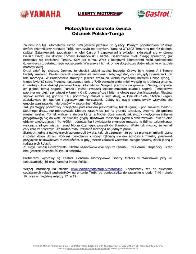 Motocyklami dookoła świata Odcinek Polska-Turcja Za nimi 2,5 tys. kilometrów. Przed nimi jeszcze przeszło 30 tysięcy. Późnym popołudniem 12 maja dwóch dziennikarzy radiowej Trójki wyruszyło motocyklami Yamaha XT660Z Tenere w podróż dookoła świata. Zatankowani, zaopatrzeni w olej Castrol i zapakowani z okładem skierowali się w stronę Bielska Białej. Po drodze Tomasz Gorazdowski i Michał Gąsiorowski mieli okazję sprawdzić, jak prowadzą się obciążone Tenery. Szły jak burza. Wraz z kolejnymi kilometrami rosło zadowolenie dziennikarzy z ostatecznego opuszczenia Warszawy i ich skromne dotychczas doświadczenie w jeździe motocyklowej. Drugi dzień był cięższy. Dobrze, że chociaż widoki wzdłuż brzegów Orawy były ładne. A i Tenery budziły zazdrość. Pewien Słowak specjalnie się zatrzymał, żeby wypytać, co i jak, gdyż zamierza kupić taki motocykl. W Budapeszcie starczyło jeszcze czasu na krótką wycieczkę metrem i zupę rybną, i trzeba było iść spać. Przecież następnego dnia o 7.40 panowie znów mieli wejście na trójkową antenę. Czwartego dnia stuknął pierwszy tysiąc kilometrów. Szeged, położony na granicy z Serbią, przywitał ich piękną, letnią pogodą. Tomek i Michał zwiedzili lokalne muzeum salami i papryki – miejscowa papryka ma pięć razy więcej witaminy C niż pomarańcze i bije na głowę paprykę hiszpańską. Niestety szybko zrobiła się godzina 14 i podróżnicy musieli ruszyć dalej, w kierunku Sofii. Stolica Bułgarii zaatakowała ich upałem i agresywnymi kierowcami. „Jakby się nagle skumulowały wszystkie złe emocje warszawskich kierowców” – wspominał Michał. Tak jak Węgry podróżnicy przejechali pod znakiem przysmaków, tak Bułgarię – pod znakiem folkloru. Siódmego dnia… nie odpoczywali. Kłopoty zaczęły się już na granicy tureckiej. Drobne, ale godzinę musieli wystać. Tomek walczył z zieloną kartą, a Michał obserwował, jak służby medyczno-sanitarne przygotowują się do walki ze świńską grypą. Rozdawali maseczki i pytali o stan zdrowia i ewentualne objawy wjeżdżających. Po krótkim odpoczynku i zwiedzeniu słynnego meczetu w Edirne dziennikarze, walcząc z silnym wiatrem znad Morza Czarnego, pognali do Stambułu. Wiało tak mocno, że jechali cały czas w przechyle. Aż trudno było utrzymać motocykl na jednym pasie. Stambuł, jedna z największych aglomeracji świata, tak ich zauroczył, że po raz pierwszy zmienili planu i zostali dzień dłużej. Podczas zwiedzania chłonęli tętniącą życiem atmosferę miasta, poznawali przyjaźnie nastawionych mieszkańców. A gdy jeszcze załatwili wszystkie zaległe sprawy, zjedli jedną z najlepszych kolacji. 21 maja Tomasz Gorazdowski i Michał Gąsiorowski wyruszyli ze Stambułu w kierunku Kapadocji. Przed nimi jeszcze przeszło 30 tys. kilometrów. Partnerami wyprawy są Castrol, Centrum Motocyklowe Liberty Motors w Warszawie przy ul. Łopuszańskiej 36 oraz Yamaha Motor Polska. Więcej informacji na stronie www.polskieradio/trojka/motocykle. Zapraszamy też do słuchania codziennych relacji podróżników na antenie Trójki od poniedziałku do czwartku o godz. 7.40 i około 16. oraz w niedziele między 17. a 19. Yamaha Motor Polska Sp. z o.o. ul. Połczyńska 120C, 01-304 Warszawa, tel. 022 331 97 55, faks 022 331 97 78, e-mail: [email protected], www.yamaha-motor.pl