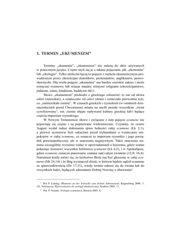 1. TERMIN „EKUMENIZM” Terminy „ekumenia”, „ekumenizm” nie należą do słów używanych w potocznym języku. Często myli się je z takimi pojęciami, jak „ekonomia” lub „ekologia”. Tylko nieliczni łączą to pojęcie z ruchem ekumenicznym prowadzonym przez chrześcijan (katolików, protestantów, anglikanów, prawosławnych). Dla wielu pojęcie „ekumenia” ma bardzo szerokie zakres i może oznaczać rozmowy lub relacje między różnymi religiami (chrześcijaństwo, judaizm, islam, hinduizm, buddyzm itd.)1. Słowo „ekumenizm” pochodzi z greckiego oikuménē, to zaś od słowa oikéō (mieszkać), a ostatecznie od oikos (dom) i oznaczało pierwotnie tyle, co „zamieszkała ziemia”. W czasach greckich i rzymskich (w ostatnich dziesięcioleciach przed Chrystusem) miano na myśli przede wszystkim „świat cywilizowany”, tzn. ziemie objęte wpływami kultury greckiej lub/i będące częścią imperium rzymskiego. W Nowym Testamencie słowo i związane z nim pojęcie ecumene nie pojawiają się często i są pojmowane wieloznacznie. Czytamy, że cesarz August wydał nakaz dokonania spisu ludności całej ecumene (Łk 2,1), a pierwsi uczniowie byli oskarżani przed trybunałami o wzniecanie niepokojów w całej ecumene, co oznacza tu imperium rzymskie i jego porządek prawnopolityczny, ale w znaczeniu negatywnym. Takie znaczenie terminu szczególnie wyraźnie widać w opowiadaniach o kuszeniu, gdzie szatan pokazuje Jezusowi wszystkie królestwa ecumenii (Łk 4,5), i w Apokalipsie, gdzie ecumene oznacza panowanie szatana nad całym światem (12,9; 16,4). Natomiast kiedy mówi się, że królestwo Boże ma być głoszone w całej ecumene (Mt 24,14) i że Bóg wyznaczył dzień, w którym będzie sądził ecumene ze sprawiedliwością (Dz 17,31), wtedy termin odnosi się do świata lub do wszystkich ludzi, będących adresatami Dobrej Nowiny o zbawieniu2. 1 Por P. Lüning, Ökumene an der Schwelle zum dritten Jahrtausend, Regensburg 2000, 7; J.E. Vercruysse, Wprowadzenie do teologii ekumenicznej, Kraków 2001, 11. 2 Por. P. Neuner, Teologia ecumenica, Brescia 2003, 8. „Aby wszyscy stanowili jedno” (J 17,21) 12 Z biegiem czasu Kościół zaczął coraz bardziej używać tego słowa na określenie siebie i swojej działalności. Wynikało to z faktu, że od czwartego stulecia stał się on w imperium rzymskim oficjalnie Kościołem państwowym, a jego granice, oprócz takich krajów, jak np. Indie, zasadniczo pokrywały się z granicami imperium. W ten sposób „zamieszkała ziemia” (= ekumenia) zaczęła oznaczać zarówno terytorium państwowe, jak kościelne. Koncepcja ekumenii wchodzi do oficjalnego języka Kościoła wraz z rozpoczęciem ery soborów. Cesarz Konstantyn zwołał sobór w Nicei w roku 325 dla zbawienia całej ecumene (Euzebiusz, Życie Konstantyna II,65). To sformułowanie zostało podjęte przez Sobór Konstantynopolitański w 381 roku, kiedy określono sobór w Nicei jako „ekumeniczny”. „Ekumeniczny” oznacza tu: oficjalny, wiążący dla wszystkich, prawowierny. Jak jednak doszło do tego, że termin ekumenia wzgl. ekumenizm został użyty na określenie ruchu chrześcijan w XX wieku, którzy starali się przywrócić utraconą jedność chrześcijańskich Kościołów? Nowe rozumienie ekumeniczności rozwinęło się w środowiskach protestanckich przede wszystkim dzięki ruchowi misyjnemu. W XIX wieku termin „ekumenizm” oznaczał działalność misyjną i powszechność przesłania chrześcijańskiego. W 1881 roku metodyści zorganizowali pierwszą ekumeniczną światową konferencję metodystyczną. W 1900 roku w Nowym Jorku odbyła się pierwsza ekumeniczna konferencja misyjna, której celem był podział terytoriów misyjnych pomiędzy poszczególne Kościoły i organizacje misyjne dla uniknięcia konfliktów pomiędzy nimi. Działanie to zostało określone jako „ekumeniczne”3. Następnie odbyła się konferencja misyjna w Edynburgu (1910), która jednak nie została określona jako „ekumeniczna”. Sprzeciwili się temu określeniu uczestnicy anglikańscy, którzy zauważyli, że bez obecności przedstawicieli Kościoła katolickiego i prawosławnego zgromadzenie to nie powinno być określane jako „ekumeniczne”. Podkreślano, że przymiotnik „ekumeniczny” dotyczy zgromadzeń, takich jak synody i sobory, a konferencja nie dotyczyła spraw związanych z wiarą lub ustrojem Kościoła. Właściwym twórcą obecnego rozumienia terminu „ekumeniczny” był szwedzki biskup Nathan Söderblom. W 1919 roku w imieniu biskupów Szwecji wezwał odpowiedzialnych z Kościołów Europy do zawiązania „ekumenicznej rady Kościołów”, która w imieniu wszystkich chrześcijan mogłaby 3 Por. tamże, 11–12. Termin „ekumenizm” 13 się wypowiadać w sprawach religii, moralności i której celem byłaby praca nad odbudowaniem pokoju oraz promocja sprawiedliwości społecznej. Celem rady nie byłoby zjednoczenie w kwestiach wiary czy widzialnej jedności, ale współpraca praktyczna w tym, co dotyczy szczególnie życia społecznego i politycznego. Termin „ekumeniczny” zaczął oznaczać przeciwieństwo tego, co teoretyczne, kanoniczne, dogmatyczne, zgodnie z tezą Söderbloma: „doktryna dzieli, służba łączy”. Dopiero od czasów konferencji protestanckiej organizacji tzw. praktycznego chrześcijaństwa „Życie i Działanie” (Life and Work) w Oksfordzie w 1937 roku została ustalona definicja ekumenizmu jako dążenia do widzialnej jedności chrześcijan. „Ekumeniczny” odnosi się do całego Kościoła, do relacji pomiędzy Kościołami, mających na celu ich zjednoczenie. W środowisku ewangelickim „ekumeniczny” oznacza często relacje Kościołów protestanckich półkuli północnej z ich odpowiednikami na półkuli południowej. Główne tematy poruszane pomiędzy chrześcijanami z Północy i Południa dotyczą spraw praktycznych, takich jak zwalczanie niesprawiedliwości społecznej, 