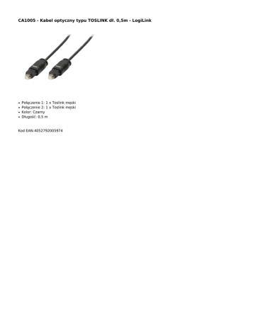 CA1005 - Kabel optyczny typu TOSLINK dł. 0,5m - LogiLink ● ● ● ● Połączenie 1: 1 x Toslink męski Połączenie 2: 1 x Toslink męski Kolor: Czarny Długość: 0,5 m Kod EAN:4052792005974