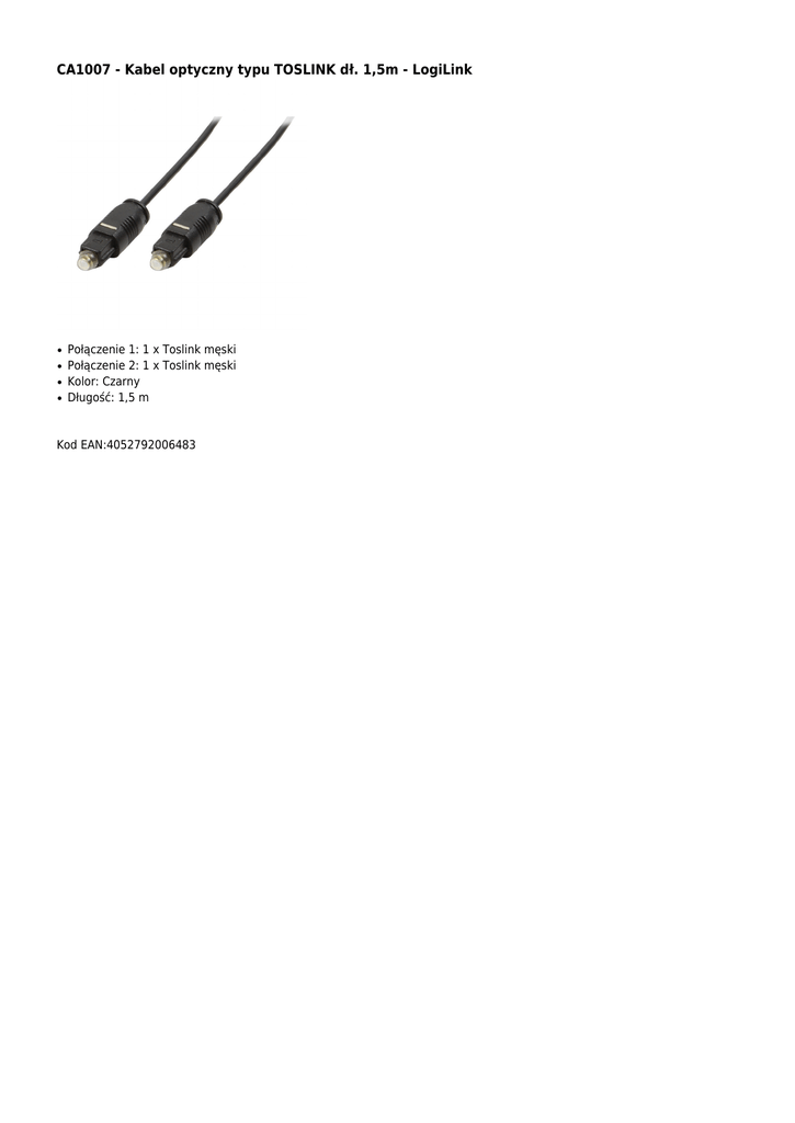 CA1007 - Kabel optyczny typu TOSLINK dł. 1,5m - LogiLink ● ● ● ● Połączenie 1: 1 x Toslink męski Połączenie 2: 1 x Toslink męski Kolor: Czarny Długość: 1,5 m Kod EAN:4052792006483
