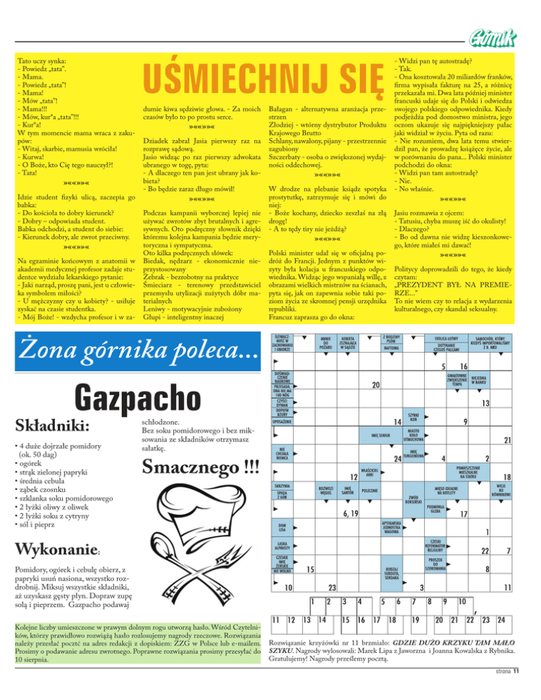 Tato uczy synka: - Powiedz „tata”. - Mama. - Powiedz „tata”! - Mama! - Mów „tata”! - Mama!!! - Mów, kur*a „tata”!!! - Kur*a! W tym momencie mama wraca z zakupów: - Witaj, skarbie, mamusia wróciła! - Kurwa! - O Boże, kto Cię tego nauczył?! - Tata! »««»»« Idzie student fizyki ulicą, zaczepia go babka: - Do kościoła to dobry kierunek? - Dobry – odpowiada student. Babka odchodzi, a student do siebie: - Kierunek dobry, ale zwrot przeciwny. »««»»« Na egzaminie końcowym z anatomii w akademii medycznej profesor zadaje studentce wydziału lekarskiego pytanie: - Jaki narząd, proszę pani, jest u człowieka symbolem miłości? - U mężczyzny czy u kobiety? - usiłuje zyskać na czasie studentka. - Mój Boże! - wzdycha profesor i w za- UŚMIECHNIJ SIĘ dumie kiwa sędziwie głowa. - Za moich czasów było to po prostu serce. »««»»« Dziadek zabrał Jasia pierwszy raz na rozprawę sądową. Jasio widząc po raz pierwszy adwokata ubranego w togę, pyta: - A dlaczego ten pan jest ubrany jak kobieta? - Bo będzie zaraz długo mówił! »««»»« Podczas kampanii wyborczej lepiej nie używać zwrotów zbyt brutalnych i agresywnych. Oto podręczny słownik dzięki któremu kolejna kampania będzie merytoryczna i sympatyczna. Oto kilka podręcznych słówek: Biedak, nędzarz - ekonomicznie nieprzystosowany Żebrak - bezrobotny na praktyce Śmieciarz - terenowy przedstawiciel przemysłu utylizacji zużytych dóbr materialnych Leniwy - motywacyjnie zubożony Głupi - inteligentny inaczej Bałagan - alternatywna aranżacja przestrzen Złodziej - wtórny dystrybutor Produktu Krajowego Brutto Schlany, nawalony, pijany - przestrzennie zagubiony Szczerbaty - osoba o zwiększonej wydajności oddechowej. »««»»« W drodze na plebanie ksiądz spotyka prostytutkę, zatrzymuje się i mówi do niej: - Boże kochany, dziecko zeszłaś na złą drogę! - A to tędy tiry nie jeżdżą? »««»»« Polski minister udał się w oficjalną podróż do Francji. Jednym z punktów wizyty była kolacja u francuskiego odpowiednika. Widząc jego wspaniałą willę, z obrazami wielkich mistrzów na ścianach, pyta się, jak on zapewnia sobie taki poziom życia ze skromnej pensji urzędnika republiki. Francuz zaprasza go do okna: - Widzi pan tę autostradę? - Tak. - Ona kosztowała 20 miliardów franków, firma wypisała fakturę na 25, a różnicę przekazała mi. Dwa lata później minister francuski udaje się do Polski i odwiedza swojego polskiego odpowiednika. Kiedy podjeżdża pod domostwo ministra, jego oczom ukazuje się najpiękniejszy pałac jaki widział w życiu. Pyta od razu: - Nie rozumiem, dwa lata temu stwierdził pan, że prowadzę książęce życie, ale w porównaniu do pana... Polski minister podchodzi do okna: - Widzi pan tam autostradę? - Nie. - No właśnie. »««»»« Jasiu rozmawia z ojcem: - Tatusiu, chyba muszę iść do okulisty! - Dlaczego? - Bo od dawna nie widzę kieszonkowego, które miałeś mi dawać! »««»»« Politycy doprowadzili do tego, że kiedy czytam: „PREZYDENT BYŁ NA PREMIERZE...” To nie wiem czy to relacja z wydarzenia kulturalnego, czy skandal seksualny. Żona górnika poleca... Gazpacho Składniki: • 4 duże dojrzałe pomidory (ok. 50 dag) • ogórek • strąk zielonej papryki • średnia cebula • ząbek czosnku • szklanka soku pomidorowego • 2 łyżki oliwy z oliwek • 2 łyżki soku z cytryny • sól i pieprz schłodzone. Bez soku pomidorowego i bez miksowania ze składników otrzymasz sałatkę. Smacznego !!! Wykonanie: Pomidory, ogórek i cebulę obierz, z papryki usuń nasiona, wszystko rozdrobnij. Miksuj wszystkie składniki, aż uzyskasz gęsty płyn. Dopraw zupę solą i pieprzem. Gazpacho podawaj Kolejne liczby umieszczone w prawym dolnym rogu utworzą hasło. Wśród Czytelników, którzy prawidłowo rozwiążą hasło rozlosujemy nagrody rzeczowe. Rozwiązania należy przesłać pocztć na adres redakcji z dopiskiem: ZZG w Polsce lub e-mailem. Prosimy o podawanie adresu zwrotnego. Poprawne rozwiązania prosimy przesyłać do 10 sierpnia. Rozwiązanie krzyżówki nr 11 brzmiało: GDZIE DUŻO KRZYKU TAM MAŁO SZYKU. Nagrody wylosowali: Marek Lipa z Jaworzna i Joanna Kowalska z Rybnika. Gratulujemy! Nagrody prześlemy pocztą. strona 11