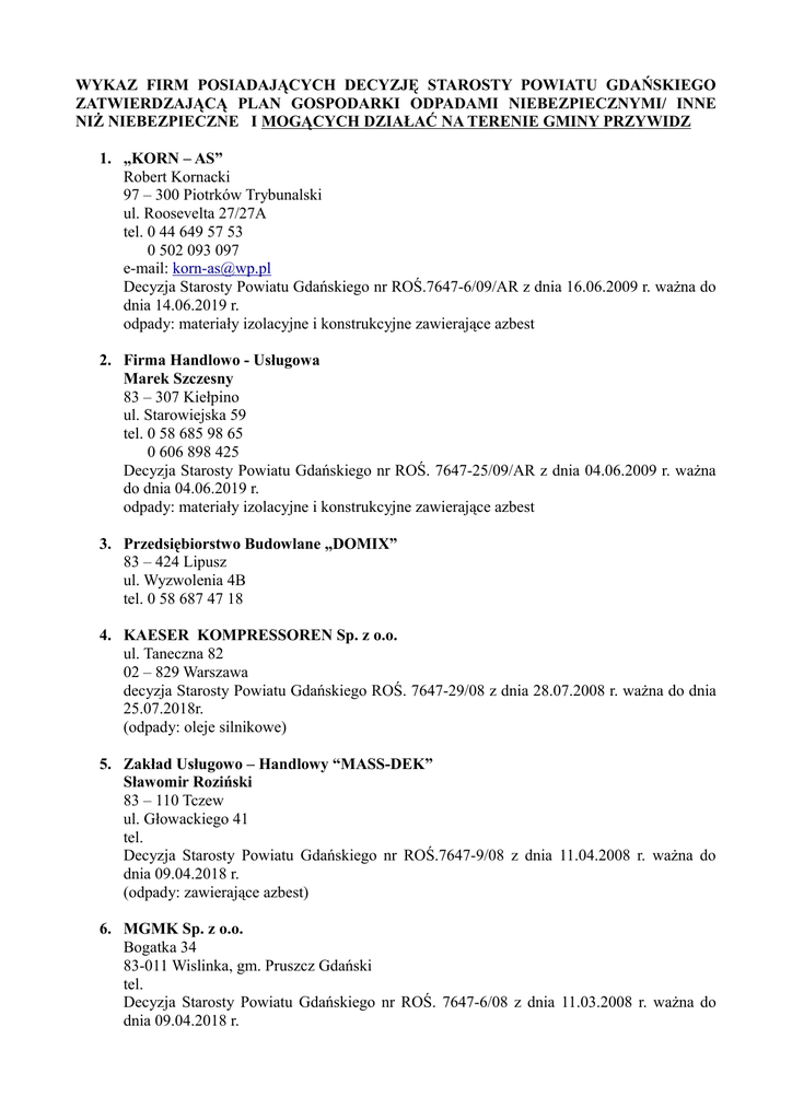 WYKAZ FIRM POSIADAJĄCYCH DECYZJĘ STAROSTY POWIATU GDAŃSKIEGO ZATWIERDZAJĄCĄ PLAN GOSPODARKI ODPADAMI NIEBEZPIECZNYMI/ INNE NIŻ NIEBEZPIECZNE I MOGĄCYCH DZIAŁAĆ NA TERENIE GMINY PRZYWIDZ 1. „KORN – AS” Robert Kornacki 97 – 300 Piotrków Trybunalski ul. Roosevelta 27/27A tel. 0 44 649 57 53 0 502 093 097 e-mail: [email protected] Decyzja Starosty Powiatu Gdańskiego nr ROŚ.7647-6/09/AR z dnia 16.06.2009 r. ważna do dnia 14.06.2019 r. odpady: materiały izolacyjne i konstrukcyjne zawierające azbest 2. Firma Handlowo - Usługowa Marek Szczesny 83 – 307 Kiełpino ul. Starowiejska 59 tel. 0 58 685 98 65 0 606 898 425 Decyzja Starosty Powiatu Gdańskiego nr ROŚ. 7647-25/09/AR z dnia 04.06.2009 r. ważna do dnia 04.06.2019 r. odpady: materiały izolacyjne i konstrukcyjne zawierające azbest 3. Przedsiębiorstwo Budowlane „DOMIX” 83 – 424 Lipusz ul. Wyzwolenia 4B tel. 0 58 687 47 18 4. KAESER KOMPRESSOREN Sp. z o.o. ul. Taneczna 82 02 – 829 Warszawa decyzja Starosty Powiatu Gdańskiego ROŚ. 7647-29/08 z dnia 28.07.2008 r. ważna do dnia 25.07.2018r. (odpady: oleje silnikowe) 5. Zakład Usługowo – Handlowy “MASS-DEK” Sławomir Roziński 83 – 110 Tczew ul. Głowackiego 41 tel. Decyzja Starosty Powiatu Gdańskiego nr ROŚ.7647-9/08 z dnia 11.04.2008 r. ważna do dnia 09.04.2018 r. (odpady: zawierające azbest) 6. MGMK Sp. z o.o. Bogatka 34 83-011 Wislinka, gm. Pruszcz Gdański tel. Decyzja Starosty Powiatu Gdańskiego nr ROŚ. 7647-6/08 z dnia 11.03.2008 r. ważna do dnia 09.04.2018 r. (odpady niebezp. : asfalt zawierający smołę odpady inne niz niebezp., do odzysku :beton, gruz betonowy z rozbiórek iremontów, gruz ceglany , odpady innych materiałów ceramicz., zmieszane odpady z w/w ) 7. Zakład Remontowo – Budowlany Waldemar Tymoszewski ul. Jaśminowa 9 83-031 Żukczyn tel. (0 58) 773-18-85, (0-58) 772-18-86 Decyzja Starosty Powiatu Gdańskiego nr ROŚ.7647-42/07 z dnia 13.12.2007 r. ważna do dnia 10.12.2017 r. (odpady: gleba i ziemia, w tym kamienie zawierające subst. Niebezp.) 8. Zakład Usługowy Blacharsko – Dekarski Kazimierz Klejna Puzdrowo 69 83 – 340 Sierakowice tel. (0 58) 681 64 12 decyzja Starosty Powiatu Gdańskiego nr ROŚ.7647-43/07 z dnia 21.11.2007 r. ważna do dnia 19.11.2017 r. (odpady: zawierające azbest) 9. “EUROGAZ-GDYNIA” Sp. z o.o. ul. Czechosłowacka 3 81 – 963 Gdynia Decyzja Starosty Powiatu Gdańskiego na odzysk odpadów nr ROŚ.7647-36/07 z dnia 26.11.2007 ważna do dnia 24.11.2017 r. (odpady: wapno pokarbidowe niezawierające subs. Niebezp.) 10. P.H.U. “PAMIR” Maciej Strzeszyński ul. Łąkowa 10 83 – 110 Tczew tel. (0 58) 532 17 03 decyzja Starosty Powiatu Gdańskiego nr ROŚ. 7647-31/07 z dnia 16.08.2007 r. ważna do 14.08.2017 r. (odpady: zawierające azbest) 11. “MTM – BRUKBET” Sp. z o.o. 83 – 032 Pszczółki ul. Fabryczna 8 tel. (0-58) 683 – 93 – 53 (0-58) 683 – 91 – 27 e-mail: [email protected] decyzja Starosty Powiatu Gdańskiego nr ROŚ. 7647-19/07 z dnia 27.07.2007 r. ważna do dnia 25.07.2017 r. odzysk – odpady betonu, gruzu betonowego z rozbiórek i remontów, gruz ceglany zbieranie- jw. Transport – jw., odpadowe piaski i iły, asfalt inny niż w 17 03 01, gleba i ziemia w tym kamienie inne niz w 17 05 03 12. “WENCO” Zakład Robót Budowlanych Marian Wenta ul. M. Konopnickiej 17 83 – 000 Pruszcz Gdański decyzja Starosty Powiatu Gdańskiego nr ROŚ. 7647-14/07 z dnia 18.05.2007 r. ważna do dnia 16.05.2017 r. tel. (0-58) 682 29 10 tel. kom. 0 502 522 466 odpady: zmieszane lub wysegregowane odpady z betonu, gruzu ceglanego, odpadowych materiałów ceramicznych i elem. wyposażenia zawierających subst. niebezp., odpady zawierające azbest. 13. “GEOPROTECT” Usługi Geologiczne i Wodne Marzena Sadowska ul. Okrężna 3 80 – 174 Otomin tel. 0 500 111 741 decyzja Starosty Powiatu Gdańskiego nr ROŚ.7647-84/06 z dnia 01.03.2007 r. ważna do dnia 27.02.2017 r. odpady: szlamy z odwadniania olejów, szlamy z kolektorów, olej z odwadniaia olejów w separatorach, zaolejona woda z odwadniania olejów, gleba i ziemia w tym kamienie zawierające subst. niebezp., tłuszcze i mieszaniny olejów z separacji inne niz w 19 08 09, szlamy z oczyszczania gleby i ziemi zawierajace subst. Niebezp. 14. Przedsiębiorstwo Produkcyjno – Handlowo – Usługowe “GAJAWI “ Gabriel Rogut ul. Kopernika 56/60 90 – 553 Łódź tel. 501 028 153 decyzja Starosty Powiatu Gdańskiego nr BRO.ROŚ.7647-92/06 z dnia 08.02.2007 r. ważna do dnia 06.02.2017 r. odpady: zawierające azbest 15. EkoNaft Sp. z o.o. 32 – 540 Trzebinia ul. Fabryczna 22 tel. (0 32) 618 05 02 tel. (0 32) 618 05 05 decyzja Starosty Powiatu Gdańskiego nr BRO.ROŚ.7647-1/07 z dnia 058.03.2007 r. ważna do dnia 03.03.2017 r. odpady: stałe z piaskowników i z odwadniania olejów, szlamy z odwadniania olejów, szlamy z kolektorów, olej z odwadniania olejów, zaolejona woda z odwadniania olejów, mieszanina odpadów z piaskowników i z odwadniania olejów, olej opałowy i napędowy, benzyna, inne paliwa, odpady zawierające ropę naftową i jej produkty, odpady zawierające inne subst. niebezp. 16. “NORD-METAL” Sp. z o.o. ul. Wejhera 5D/22 80 – 346 Gdańsk Decyzja Starosty Powiatu Gdańskiego nr ROŚ. 7647-61/09/AR z dnia 31.08.2009 r. ważna do dnia 01.08.2019 r. działalność w zakresie zbierania odpadów innych niż niebezpieczne na terenie dz. 502/5 w Przywidzu (odpady metalowe, z tłoczenia i piłowania żelaza i jego stopów, cząstki i pyły żelaza i jego stopów, spawalnicze, opakowania z metali, metale żelazne i nieżelazne, zużyte urządzenia inne niz wymienione w 16 02 09 do 16 02 13, elem. usunięte ze zużytych urządzeń inne niż w 16 02 15, miedź, brąz, mosiądz, aluminium, ołów, cynk, żelazo i stal, mieszaniny metali, kable inne niż w 17 04 10, odpady żelaza i stali, metale żelazne). 17. P.P.H.U. “DACHMUR” Daniel Drywa ul. Kopernika 7a, 83 – 340 Sierakowice decyzja Starosty Powiatu Gd