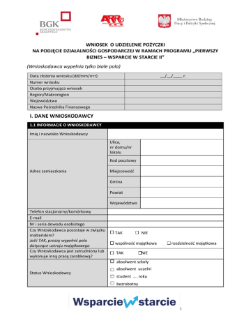 WNIOSEK O UDZIELENIE POŻYCZKI NA PODJĘCIE DZIAŁALNOŚCI GOSPODARCZEJ W RAMACH PROGRAMU „PIERWSZY BIZNES – WSPARCIE W STARCIE II” (Wnioskodawca wypełnia tylko białe pola) Data złożenia wniosku (dd/mm/rrrr) Numer wniosku Osoba przyjmująca wniosek Region/Makroregion Województwo Nazwa Pośrednika Finansowego __/__/____ r. I. DANE WNIOSKODAWCY 1.1 INFORMACJE O WNIOSKODAWCY Imię i nazwisko Wnioskodawcy Ulica, nr domu/nr lokalu Kod pocztowy Adres zamieszkania Miejscowość Gmina Powiat Województwo Telefon stacjonarny/komórkowy E-mail Nr i seria dowodu osobistego Czy Wnioskodawca pozostaje w związku małżeńskim? Jeśli TAK, proszę wypełnić pola dotyczące ustroju majątkowego Czy Wnioskodawca jest zatrudniony lub wykonuje inną pracę zarobkową? TAK NIE wspólność majątkowa TAK rozdzielność majątkowa NIE absolwent szkoły Status Wnioskodawcy absolwent uczelni student …. roku bezrobotny 1 typ studiów: …………………………………………………………. (I, II stopnia, jednolite magisterskie) a) Jeśli zaznaczono pole: student lub absolwent szkoły/uczelni, proszę wypełnić pola po prawej: kierunek studiów: ……………………………………………...... nazwa i adres szkoły/uczelni: .……….………………………… …………………………………………………………………………………. Data ukończenia szkoły / uzyskania tytułu zawodowego/ uzyskania dyplomu: __/__/____ r. Czy Wnioskodawca obecnie prowadzi działalność gospodarczą? Czy Wnioskodawca prowadził kiedyś działalność gospodarczą? Jeśli tak, proszę podać datę zamknięcia działalności Czy Wnioskodawca posiada zadłużenie z tytułu niespłaconych składek ZUS oraz zaległości względem US? Czy Wnioskodawca otrzymał pomoc de minimis lub inną pomoc publiczną w okresie obejmującym bieżący rok kalendarzowy i poprzedzające go dwa lata kalendarzowe? Jeśli TAK, proszę podać wartość uzyskanej pomocy (EUR) TAK NIE TAK NIE Data zamknięcia działalności: …………………………………….. TAK NIE TAK NIE ……………………………………….. euro (wartość uzyskanej pomocy) II. CHARAKTERYSTYKA POŻYCZKI I PLANOWANEJ DZIAŁALNOŚCI GOSPODARCZEJ 2.1 FORMA PLANOWANEJ DZIAŁALNOŚCI GOSPODARCZEJ Prowadzenie działalności gospodarczej indywidualnie spółka cywilna W przypadku zaznaczenia pola „spółka cywilna”, proszę wypełnić poniższe pola: Wykaz osób, z którymi Wnioskodawca zamierza prowadzić wspólnie działalność 2 W przypadku zaznaczenia pola „spółka cywilna”, informacje w punktach 2.2 – 2.5 są takie same dla każdego wniosku indywidualnego w ramach planowanej spółki. 2.2 OPIS PRZEDSIĘWZIĘCIA (jaka działalność, co będzie wytwarzane/ sprzedawane/ oferowane/rodzaj usług, docelowa grupa odbiorców/klientów/dostawców, forma sprzedaży, zasięg, konkurencja, główne założenia, sezonowość, doświadczenie/marketing) ORAZ CEL POŻYCZKI 3 2.3 OPIS PRZEWIDYWANYCH EFEKTÓW EKONOMICZNYCH PROWADZENIA DZIAŁALNOŚCI GOSPODARCZEJ - PLANOWANE PRZYCHODY I KOSZTY PLANOWANE PRZYCHODY (MIESIĘCZNE) Lp. Źródła przychodów Kwota brutto (PLN) 1. 2. 3. … Razem przychody OPIS ZAŁOŻEŃ LEŻĄCYCH U PODSTAW PLANOWANYCH PRZYCHODÓW PLANOWANE KOSZTY (MIESIĘCZNE) Lp. Rodzaj kosztu (np. paliwo, lokal, opłaty, podatki) Kwota brutto (PLN) 1. 2. 3. … Razem koszty OPIS ZAŁOŻEŃ LEŻĄCYCH U PODSTAW PLANOWANYCH KOSZTÓW 2.4 MIEJSCE PROWADZENIA PLANOWANEJ DZIAŁALNOŚCI GOSPODARCZEJ Adres (ulica, nr, lokal, kod pocztowy, miasto) Województwo 2.5 RODZAJ PLANOWANEJ DZIAŁALNOŚCI GOSPODARCZEJ Branża Przeważająca działalność gospodarcza (kod PKD) 4 2.6 SZCZEGÓŁOWA SPECYFIKACJA I HARMONOGRAM WYDATKÓW W RAMACH WNIOSKOWANEJ POŻYCZKI WYDATKI planowany termin Lp. Rodzaj wydatku Kwota brutto (PLN) wydatkowania 1. 2. 3. … Razem wydatki UWAGI ŹRÓDŁA FINANSOWANIA Rodzaj źródła Wnioskowana pożyczka Środki własne Inne źródła (jakie?) ……………………………………….. Razem źródła finansowania Kwota brutto (PLN) 2.7 INFORMACJA O WNIOSKOWANYCH PARAMETRACH FINANSOWANIA Okres spłaty (w miesiącach) do 84 miesięcy Kwota pożyczki (w tysiącach) Planowana data/y wypłat/y (w transzach lub jednorazowo) Okres karencji w spłacie kapitału (w miesiącach) do 12 miesięcy 2.8 FORMY ZABEZPIECZENIA SPŁAT NALEŻNOŚCI Z TYTUŁU POŻYCZKI Propozycje zabezpieczenia Weksel in blanco (obowiązkowo) Poręczenie osób/osoby fizycznych/ej Proszę podać imię/ona i nazwisko/a proponowanego/ych poręczyciela/i 1. ………………………………………………………………………………………………. 2. ………………………………………………………………………………………………. Lp. 1. 2. Propozycje innych prawnych zabezpieczeń spłat należności z tytułu pożyczki Rodzaj zabezpieczenia wartość (PLN) 5 III. USŁUGI DORADZTWA I SZKOLENIA 3.1 Usługi doradztwa i szkolenia dla Wnioskodawcy Czy Wnioskodawca planuje skorzystać doradztwo szkolenie nie planuje z bezpłatnych usług doradztwa i/lub szkolenia? W przypadku zaznaczenia pola „doradztwo” i/lub „szkolenie”, proszę wypełnić poniższe pola: Sporządzanie opisu przedsięwzięcia Z jakiego zakresu usług doradztwa i/lub szkolenia Sporządzanie kosztorysu przedsięwzięcia planuje skorzystać Wnioskodawca? (Wnioskodawca może zaznaczyć więcej niż jeden Inne oferowane przez pośrednika zakres usług) ………………………………………………………………. (proszę krótko opisać zakres usług) 3.2 Usługi doradztwa i szkolenia po uzyskaniu pożyczki Czy Wnioskodawca po uzyskaniu pożyczki planuje skorzystać z bezpłatnych usług doradztwa doradztwo szkolenie nie planuje i/lub szkolenia? W przypadku zaznaczenia pola „doradztwo” i/lub „szkolenie”, proszę wypełnić poniższe pola: Zakładanie działalności gospodarczej Z jakiego za