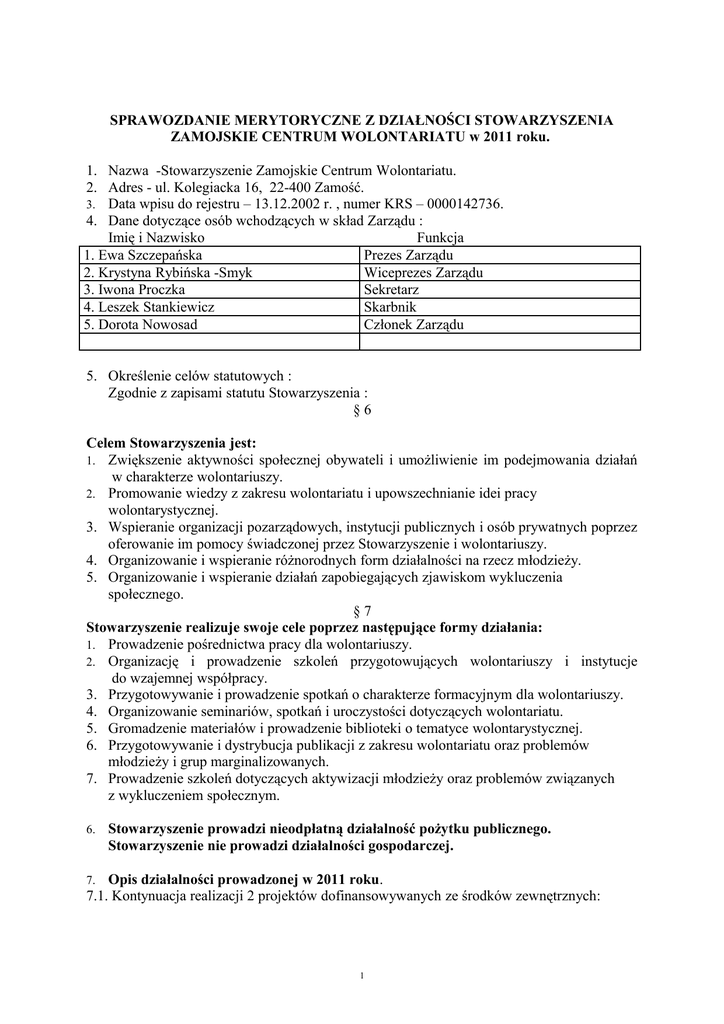 SPRAWOZDANIE MERYTORYCZNE Z DZIAŁNOŚCI STOWARZYSZENIA ZAMOJSKIE CENTRUM WOLONTARIATU w 2011 roku. 1. Nazwa -Stowarzyszenie Zamojskie Centrum Wolontariatu. 2. Adres - ul. Kolegiacka 16, 22-400 Zamość. 3. Data wpisu do rejestru – 13.12.2002 r. , numer KRS – 0000142736. 4. Dane dotyczące osób wchodzących w skład Zarządu : Imię i Nazwisko Funkcja 1. Ewa Szczepańska Prezes Zarządu 2. Krystyna Rybińska -Smyk Wiceprezes Zarządu 3. Iwona Proczka Sekretarz 4. Leszek Stankiewicz Skarbnik 5. Dorota Nowosad Członek Zarządu 5. Określenie celów statutowych : Zgodnie z zapisami statutu Stowarzyszenia : §6 Celem Stowarzyszenia jest: 1. Zwiększenie aktywności społecznej obywateli i umożliwienie im podejmowania działań w charakterze wolontariuszy. 2. Promowanie wiedzy z zakresu wolontariatu i upowszechnianie idei pracy wolontarystycznej. 3. Wspieranie organizacji pozarządowych, instytucji publicznych i osób prywatnych poprzez oferowanie im pomocy świadczonej przez Stowarzyszenie i wolontariuszy. 4. Organizowanie i wspieranie różnorodnych form działalności na rzecz młodzieży. 5. Organizowanie i wspieranie działań zapobiegających zjawiskom wykluczenia społecznego. §7 Stowarzyszenie realizuje swoje cele poprzez następujące formy działania: 1. Prowadzenie pośrednictwa pracy dla wolontariuszy. 2. Organizację i prowadzenie szkoleń przygotowujących wolontariuszy i instytucje do wzajemnej współpracy. 3. Przygotowywanie i prowadzenie spotkań o charakterze formacyjnym dla wolontariuszy. 4. Organizowanie seminariów, spotkań i uroczystości dotyczących wolontariatu. 5. Gromadzenie materiałów i prowadzenie biblioteki o tematyce wolontarystycznej. 6. Przygotowywanie i dystrybucja publikacji z zakresu wolontariatu oraz problemów młodzieży i grup marginalizowanych. 7. Prowadzenie szkoleń dotyczących aktywizacji młodzieży oraz problemów związanych z wykluczeniem społecznym. 6. Stowarzyszenie prowadzi nieodpłatną działalność pożytku publicznego. Stowarzyszenie nie prowadzi działalności gospodarczej. Opis działalności prowadzonej w 2011 roku. 7.1. Kontynuacja realizacji 2 projektów dofinansowywanych ze środków zewnętrznych: 7. 1 Projekt „ WOLONTARIAT DOROSŁYCH – szansą na wzmocnienie potencjału organizacji pozarządowych na Zamojszczyźnie” dofinansowywany przez MPiPS w ramach PO FIO w kwocie 50 297,96 zł w 2011 r. Osiągnięte REZULTATY TWARDE : 1. Ilość szkoleń - 6 szkoleń 2. Ilość godzin szkoleń – 72 godzin 3. Ilość przeszkolonych osób -60 osób/91 4. Ilość warsztatów komputerowych – 8 warsztatów 5. Ilość godzin warsztatów – 16 godzin 6. Ilość seminariów – 4 seminaria 7. Ilość osób biorących udział w seminariach – 120 osób 8. Ilość imprez masowych – 3, w tym: 2 ekspozycje wystawy „Wolontariat w obiektywie”, Zamojska Gala Europejskiego Roku Wolontariatu – Konferencja „Wolontariat dla Zamojszczyzny – Zamojszczyzna dla wolontariatu" 9. Ilość osób biorących udział w imprezach – 259 osób (Gala), około 1600 osób (wystawa) 10. Ilość egzemplarzy broszury – 300 szt. 11 . Materiały do kampanii Europejski Rok Wolontariatu: - prezentacje multimedialne – 9 szt. - inserty – 3000 szt. - plakaty – 150 szt. Osiągnięte REZULTATY MIĘKKIE : 1. Zdobycie wiedzy i nabycie nowych umiejętności przez dorosłych wolontariuszy poprzez szkolenia specjalistyczne. 2. Kształtowanie postaw prospołecznych, wrażliwości i solidarności społecznej wśród osób szeroko zakrojoną akcję informacyjno – promocyjną obejmującą rożne środowiska społeczne. Spowodowała ona duże zainteresowanie wolontariatem o czym świadczy fakt zwiększenia liczby osób zgłaszających się do ZCW, deklarujących chęć zostania wolontariuszami. Zainteresowanie władz samorządowych, przedstawicieli szkół wszystkich szczebli, służby zdrowia, instytucji pomocy społecznej, organizacji pozarządowych zdecydowanie przyczynia się do kształtowania postaw prospołecznych wśród społeczności lokalnej. Prezentowanie różnych barw wolontariatu, zapoznanie mieszkańców z różnymi obszarami działania wolontariuszy , uzmysłowienie jak dużo robią wolontariusze w celu pełniejszego zabezpieczenia potrzeb społeczności lokalnej przyczynia się do zwiększenia wrażliwości i solidarności społecznej. 3. Wzrost zaangażowania wolontariuszy w działania organizacji pozarządowych. Uczestnicy projektu zapoznali się ze specyfiką funkcjonowania organizacji pozarządowych, która była im nieznana. Prowadzone zajęcia cieszyły się powodzeniem wśród studentów zamojskich uczelni. Część z nich podjęła świadczenie wolontarystyczne w organizacjach. Poza tym zainteresowali się III sektorem jako potencjalnym miejscem pracy, ponieważ praca w organizacji daje możliwość łączenia misji życiowej z karierą zawodową. 4. Wzrost świadomości społecznej nt. potencjału i rangi wolontariatu w rozwiązywaniu problemów społecznych i budowanie społeczeństwa obywatelskiego. Projekt został zrealizowany zgodnie z budżetem i harmonogramem. Sprawozdanie zostało złożone w wyznaczonym terminie. 7.1.2. Projekt „ Otaczając opieką odzyskać dla lokalnej społeczności”. Polsko – niemieckie partnerstwo dla polepszenia jakości życia mieszkańców Zamościa poszkodowanych przez III 2 Rzeszę, dofinansowywany przez Fundację „ Pamięć, Odpowiedzialność i Przyszłość’ z Berlina oraz Fundację „ Polsko – Niemieckie Pojednanie” w kwocie 18 421 Euro w 2011. Realizacja obejmowała : - poradnictwo prawne i socjalne dla kombatantów, - zabiegi rehabilitacyjne, - szkolenia podstawowe ( 4 szkolenia) i specjalistyczne( 4 szkolenia) dla wolontariuszy, - spotkania w Kawiarni Opowieści (1 spotkanie) oraz 5 spotkań w Kawiarni Poetyckiej, - 2 imprezy okolicznościowe, 1 wycieczkę, 1 wyjście do kina, - 15% beneficjentów objętych jest stałą opieką przez wolontariuszy, pozostali mogą kor