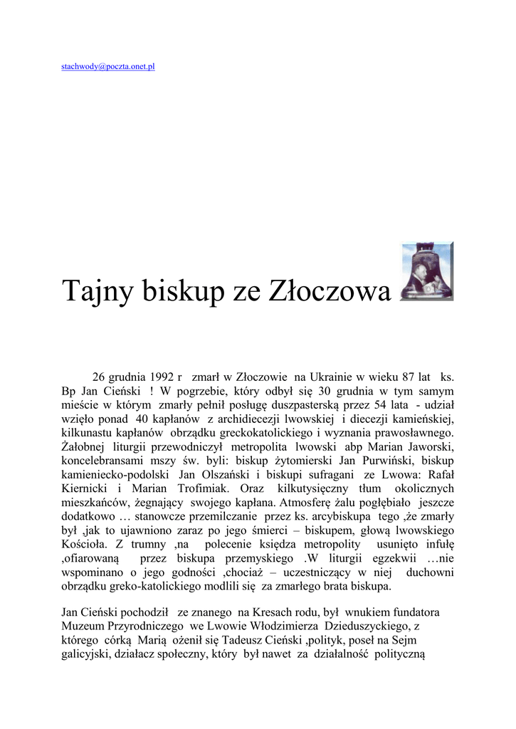 [email protected] Tajny biskup ze Złoczowa 26 grudnia 1992 r zmarł w Złoczowie na Ukrainie w wieku 87 lat ks. Bp Jan Cieński ! W pogrzebie, który odbył się 30 grudnia w tym samym mieście w którym zmarły pełnił posługę duszpasterską przez 54 lata - udział wzięło ponad 40 kapłanów z archidiecezji lwowskiej i diecezji kamieńskiej, kilkunastu kapłanów obrządku greckokatolickiego i wyznania prawosławnego. Żałobnej liturgii przewodniczył metropolita lwowski abp Marian Jaworski, koncelebransami mszy św. byli: biskup żytomierski Jan Purwiński, biskup kamieniecko-podolski Jan Olszański i biskupi sufragani ze Lwowa: Rafał Kiernicki i Marian Trofimiak. Oraz kilkutysięczny tłum okolicznych mieszkańców, żegnający swojego kapłana. Atmosferę żalu pogłębiało jeszcze dodatkowo … stanowcze przemilczanie przez ks. arcybiskupa tego ,że zmarły był ,jak to ujawniono zaraz po jego śmierci – biskupem, głową lwowskiego Kościoła. Z trumny ,na polecenie księdza metropolity usunięto infułę ,ofiarowaną przez biskupa przemyskiego .W liturgii egzekwii …nie wspominano o jego godności ,chociaż – uczestniczący w niej duchowni obrządku greko-katolickiego modlili się za zmarłego brata biskupa. Jan Cieński pochodził ze znanego na Kresach rodu, był wnukiem fundatora Muzeum Przyrodniczego we Lwowie Włodzimierza Dzieduszyckiego, z którego córką Marią ożenił się Tadeusz Cieński ,polityk, poseł na Sejm galicyjski, działacz społeczny, który był nawet za działalność polityczną internowany przez Austriaków w Gminden, a następnie w obozie w Bozen. Późniejszy senator II RP., ojciec ks. Jana był przewodniczącym Komitetu Obywatelskiego we Lwowie, podczas pamiętnych walk o to miasto w 1918 roku. Zmarł w 1925 roku. Został, w drodze wyjątku pochowany na Cmentarzu Orląt Lwowskich w kwaterze dowódców wojskowych, poległych podczas walk z Ukraińcami. Brat Ks. Jana - również ksiądz Włodzimierz Cieński był kapelanem II Korpusu Gen. Andersa. Duchownymi byli również i inni jego bracia cioteczni. Jerzy Czartoryski, Paweł Dzieduszycki, a także wyniesieni na ołtarze przez Ojca Św. Jana Pawła II w 1999 r. Błogosławieni księża męczennicy: rozstrzelany podczas Powstania Warszawskiego wraz z rannymi, którymi się opiekował dominikanin O. Michał Czartoryski i zamordowany w Oświęcimiu ks. Włodzimierz Szembek. Czas pokaże czy do grona sług bożych nie zostanie również zaliczony ks. biskup Jan Cieński. Co raz bowiem liczniej , przybywa świadków i pojawia się więcej świadectw Jego heroicznych cnót. Powołanie do stanu kapłańskiego spłynęło na niego stosunkowo późno. Wcześniej, jak przystało na potomka rodziny ziemiańskiej Jan Cieński ukończył Akademię Rolniczą w Dublanach, po niej szkołę oficerską potem zapisał się na prawo na Uniwersytecie Jana Kazimierza we Lwowie. Jednak głos Boga był silniejszy: 26 czerwca 1938 r. po odbyciu pięcioletnich studiów w seminarium, 33 letni Jan Cieński otrzymał we Lwowie z rąk ArcybiskupaMetropolity lwowskiego ks. Bolesława Twardowskiego święcenia kapłańskie. Moi rodzice dobrze Go znali, często bowiem przyjeżdżał do Pieniak majątku położonego nad Seretem, w którym się urodził, a który był wtedy w posiadaniu brata księdza - Stanisława. W administracji gospodarstwa pracował mój ojciec, mama natomiast, kierowała tamtejszą szkołą powszechną. W wyniku nasilenia się aktów ukraińskiego terroru moi rodzice schronili się w Złoczowie. Tam zbliżyli się jeszcze bardziej do ks.Jana Cieńskiego, który był z początku wikarym, a później został proboszczem tamtejszej parafii pod wezwaniem Wniebowzięcia N. Marii Panny i któremu przyszło realizować zadania wyznaczone przez Boga w czasach szczególnie trudnych. Czas Apokalipsy, który wtedy nastąpił wypełniony był niewyobrażalnym okrucieństwem!, eksterminacją ludności polskiej, żydowskiej której dopuszczały się dwa totalitaryzmy bolszewicki, hitlerowski, oraz zbrodniami ludobójstwa popełnianego przez nacjonalistów ukraińskich. Obecność tego, okazującego niespotykany hart i bezgraniczne poświęcenie Kapłana w miejscach i czasie kiedy był najbardziej potrzebny, poświadczają liczni świadkowie i autorzy wspomnień z tamtego okresu. „Sowieci po wybuchu wojny z Niemcami, a przed ucieczką ze Złoczowa, wymordowali wszystkich więźniów, znajdujących się w tym czasie w zamku złoczowskim. Skoro Niemcy zajęli Złoczów, spędzili miejscowych Żydów i kazali im rozkopać świeże jeszcze masowe groby, znajdujące się na dziedzińcu zamkowym, w których leżeli pomordowani. Ks. Cieński został tam wówczas wezwany, by odprawić modły nad wydobytymi z mogiły zwłokami. Działo się to w obecności ludności okolicznej, która poznawała swoich bliskich wśród pomordowanych. I ks. Janowi udało się rozpoznać “po butach” jego kolegę, księdza z Białego Kamienia. Skoro zostały odprawione egzekwie, a ludzie opuścili miejsce kaźni, Niemcy kazali ustawić się Żydom – grabarzom nad rozkopanymi dołami - i wszystkich wystrzelali." To była przestrzeń historyczna i geograficzna działalności księdza Jana. Był tam, gdzie najbardziej go potrzebowano. Przychodził z pomocą materialna i duchową. 28 lutego 1944 r. w Hucie Pieniackiej popełniono zbrodnię ludobójstwa! Ks. Cieński zaopiekował się żyjącymi ofiarami ukraińskich czystek etnicznych popełnionych przy udziale SS Galizjen. Tych ,którzy zostali ranni rozmieszczał w szpitalach, tych, którzy utracili bliskich pocieszał. Pomordowanych, chowanych w zbiorowych mogiłach żegnał żałobną liturgią. Po zakończeniu działań wojennych posługę kapłańską pełnił w nawet, bardzo od Złoczowa odległej okolicy. Był jednym z nielicznych w ZSRR księdzem katolickim, którego władze sowieckie jakoś tolerowały. A to za sprawą - niezwykłego zbiegu okoliczności, który zaciążył nad 