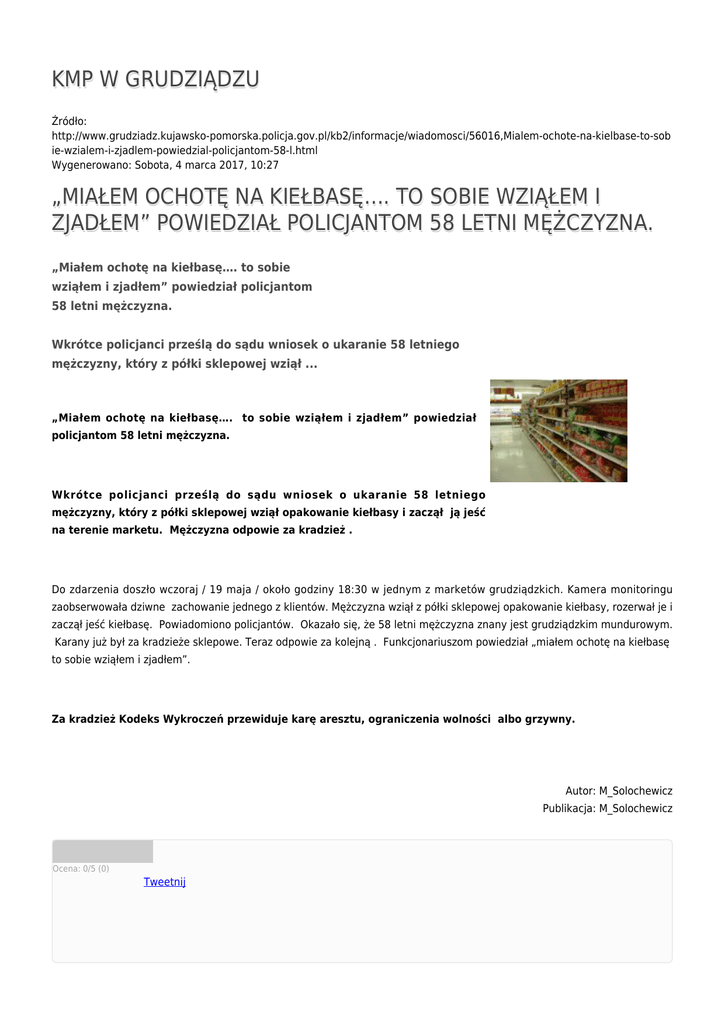 KMP W GRUDZIĄDZU Źródło: http://www.grudziadz.kujawsko-pomorska.policja.gov.pl/kb2/informacje/wiadomosci/56016,Mialem-ochote-na-kielbase-to-sob ie-wzialem-i-zjadlem-powiedzial-policjantom-58-l.html Wygenerowano: Sobota, 4 marca 2017, 10:27 „MIAŁEM OCHOTĘ NA KIEŁBASĘ…. TO SOBIE WZIĄŁEM I ZJADŁEM” POWIEDZIAŁ POLICJANTOM 58 LETNI MĘŻCZYZNA. „Miałem ochotę na kiełbasę…. to sobie wziąłem i zjadłem” powiedział policjantom 58 letni mężczyzna. Wkrótce policjanci prześlą do sądu wniosek o ukaranie 58 letniego mężczyzny, który z półki sklepowej wziął ... „Miałem ochotę na kiełbasę…. to sobie wziąłem i zjadłem” powiedział policjantom 58 letni mężczyzna. Wkrótce policjanci prześlą do sądu wniosek o ukaranie 58 letniego mężczyzny, który z półki sklepowej wziął opakowanie kiełbasy i zaczął ją jeść na terenie marketu. Mężczyzna odpowie za kradzież . Do zdarzenia doszło wczoraj / 19 maja / około godziny 18:30 w jednym z marketów grudziądzkich. Kamera monitoringu zaobserwowała dziwne zachowanie jednego z klientów. Mężczyzna wziął z półki sklepowej opakowanie kiełbasy, rozerwał je i zaczął jeść kiełbasę. Powiadomiono policjantów. Okazało się, że 58 letni mężczyzna znany jest grudziądzkim mundurowym. Karany już był za kradzieże sklepowe. Teraz odpowie za kolejną . Funkcjonariuszom powiedział „miałem ochotę na kiełbasę to sobie wziąłem i zjadłem”. Za kradzież Kodeks Wykroczeń przewiduje karę aresztu, ograniczenia wolności albo grzywny. Autor: M_Solochewicz Publikacja: M_Solochewicz Ocena: 0/5 (0) Tweetnij