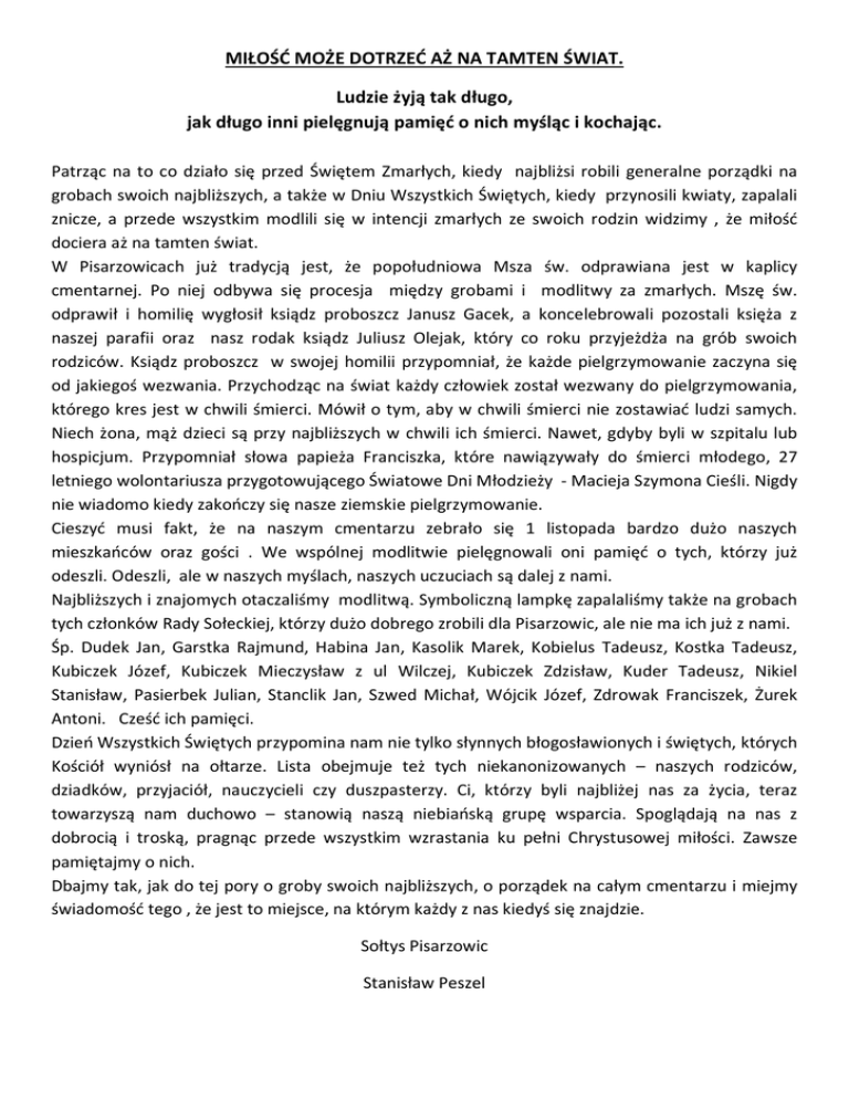 MIŁOŚĆ MOŻE DOTRZEĆ AŻ NA TAMTEN ŚWIAT. Ludzie żyją tak długo, jak długo inni pielęgnują pamięć o nich myśląc i kochając. Patrząc na to co działo się przed Świętem Zmarłych, kiedy najbliżsi robili generalne porządki na grobach swoich najbliższych, a także w Dniu Wszystkich Świętych, kiedy przynosili kwiaty, zapalali znicze, a przede wszystkim modlili się w intencji zmarłych ze swoich rodzin widzimy , że miłość dociera aż na tamten świat. W Pisarzowicach już tradycją jest, że popołudniowa Msza św. odprawiana jest w kaplicy cmentarnej. Po niej odbywa się procesja między grobami i modlitwy za zmarłych. Mszę św. odprawił i homilię wygłosił ksiądz proboszcz Janusz Gacek, a koncelebrowali pozostali księża z naszej parafii oraz nasz rodak ksiądz Juliusz Olejak, który co roku przyjeżdża na grób swoich rodziców. Ksiądz proboszcz w swojej homilii przypomniał, że każde pielgrzymowanie zaczyna się od jakiegoś wezwania. Przychodząc na świat każdy człowiek został wezwany do pielgrzymowania, którego kres jest w chwili śmierci. Mówił o tym, aby w chwili śmierci nie zostawiać ludzi samych. Niech żona, mąż dzieci są przy najbliższych w chwili ich śmierci. Nawet, gdyby byli w szpitalu lub hospicjum. Przypomniał słowa papieża Franciszka, które nawiązywały do śmierci młodego, 27 letniego wolontariusza przygotowującego Światowe Dni Młodzieży - Macieja Szymona Cieśli. Nigdy nie wiadomo kiedy zakończy się nasze ziemskie pielgrzymowanie. Cieszyć musi fakt, że na naszym cmentarzu zebrało się 1 listopada bardzo dużo naszych mieszkańców oraz gości . We wspólnej modlitwie pielęgnowali oni pamięć o tych, którzy już odeszli. Odeszli, ale w naszych myślach, naszych uczuciach są dalej z nami. Najbliższych i znajomych otaczaliśmy modlitwą. Symboliczną lampkę zapalaliśmy także na grobach tych członków Rady Sołeckiej, którzy dużo dobrego zrobili dla Pisarzowic, ale nie ma ich już z nami. Śp. Dudek Jan, Garstka Rajmund, Habina Jan, Kasolik Marek, Kobielus Tadeusz, Kostka Tadeusz, Kubiczek Józef, Kubiczek Mieczysław z ul Wilczej, Kubiczek Zdzisław, Kuder Tadeusz, Nikiel Stanisław, Pasierbek Julian, Stanclik Jan, Szwed Michał, Wójcik Józef, Zdrowak Franciszek, Żurek Antoni. Cześć ich pamięci. Dzień Wszystkich Świętych przypomina nam nie tylko słynnych błogosławionych i świętych, których Kościół wyniósł na ołtarze. Lista obejmuje też tych niekanonizowanych – naszych rodziców, dziadków, przyjaciół, nauczycieli czy duszpasterzy. Ci, którzy byli najbliżej nas za życia, teraz towarzyszą nam duchowo – stanowią naszą niebiańską grupę wsparcia. Spoglądają na nas z dobrocią i troską, pragnąc przede wszystkim wzrastania ku pełni Chrystusowej miłości. Zawsze pamiętajmy o nich. Dbajmy tak, jak do tej pory o groby swoich najbliższych, o porządek na całym cmentarzu i miejmy świadomość tego , że jest to miejsce, na którym każdy z nas kiedyś się znajdzie. Sołtys Pisarzowic Stanisław Peszel