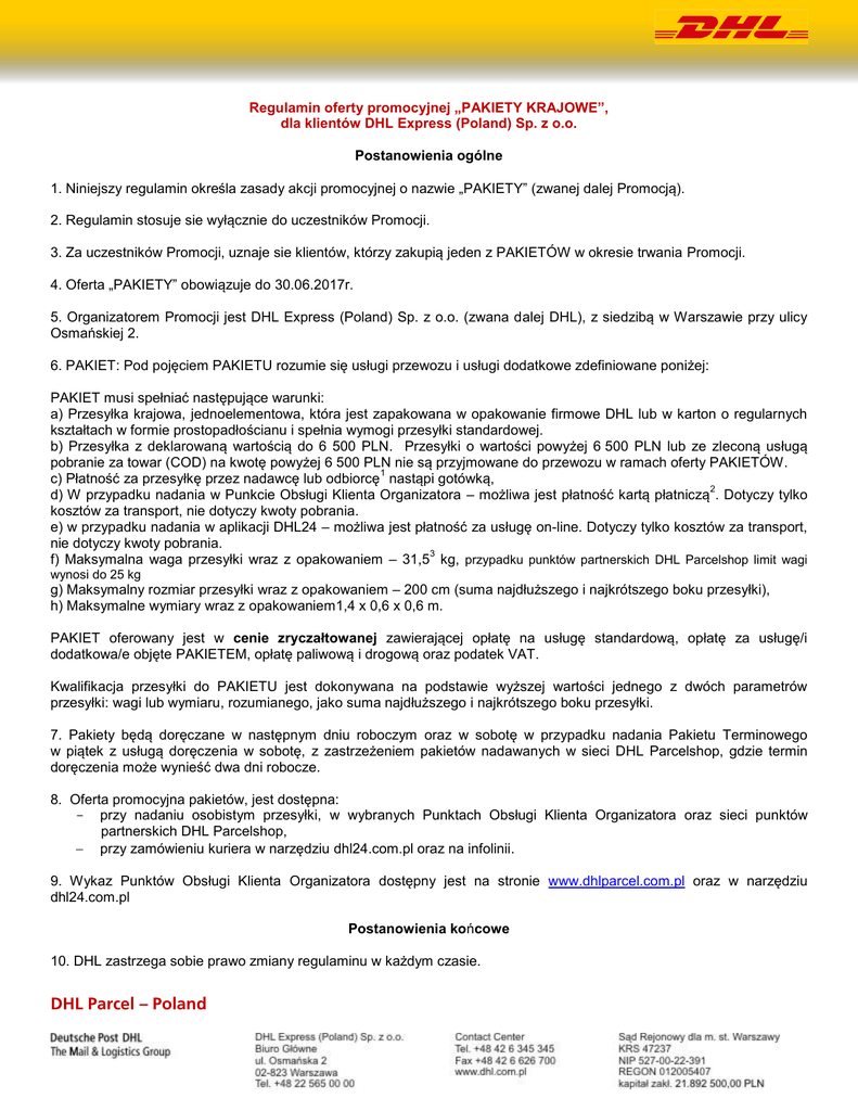 Regulamin oferty promocyjnej „PAKIETY KRAJOWE”, dla klientów DHL Express (Poland) Sp. z o.o. Postanowienia ogólne 1. Niniejszy regulamin określa zasady akcji promocyjnej o nazwie „PAKIETY” (zwanej dalej Promocją). 2. Regulamin stosuje sie wyłącznie do uczestników Promocji. 3. Za uczestników Promocji, uznaje sie klientów, którzy zakupią jeden z PAKIETÓW w okresie trwania Promocji. 4. Oferta „PAKIETY” obowiązuje do 30.06.2017r. 5. Organizatorem Promocji jest DHL Express (Poland) Sp. z o.o. (zwana dalej DHL), z siedzibą w Warszawie przy ulicy Osmańskiej 2. 6. PAKIET: Pod pojęciem PAKIETU rozumie się usługi przewozu i usługi dodatkowe zdefiniowane poniżej: PAKIET musi spełniać następujące warunki: a) Przesyłka krajowa, jednoelementowa, która jest zapakowana w opakowanie firmowe DHL lub w karton o regularnych kształtach w formie prostopadłościanu i spełnia wymogi przesyłki standardowej. b) Przesyłka z deklarowaną wartością do 6 500 PLN. Przesyłki o wartości powyżej 6 500 PLN lub ze zleconą usługą pobranie za towar (COD) na kwotę powyżej 6 500 PLN nie są przyjmowane do przewozu w ramach oferty PAKIETÓW. 1 c) Płatność za przesyłkę przez nadawcę lub odbiorcę nastąpi gotówką, 2 d) W przypadku nadania w Punkcie Obsługi Klienta Organizatora – możliwa jest płatność kartą płatniczą . Dotyczy tylko kosztów za transport, nie dotyczy kwoty pobrania. e) w przypadku nadania w aplikacji DHL24 – możliwa jest płatność za usługę on-line. Dotyczy tylko kosztów za transport, nie dotyczy kwoty pobrania. 3 f) Maksymalna waga przesyłki wraz z opakowaniem – 31,5 kg, przypadku punktów partnerskich DHL Parcelshop limit wagi wynosi do 25 kg g) Maksymalny rozmiar przesyłki wraz z opakowaniem – 200 cm (suma najdłuższego i najkrótszego boku przesyłki), h) Maksymalne wymiary wraz z opakowaniem1,4 x 0,6 x 0,6 m. PAKIET oferowany jest w cenie zryczałtowanej zawierającej opłatę na usługę standardową, opłatę za usługę/i dodatkowa/e objęte PAKIETEM, opłatę paliwową i drogową oraz podatek VAT. Kwalifikacja przesyłki do PAKIETU jest dokonywana na podstawie wyższej wartości jednego z dwóch parametrów przesyłki: wagi lub wymiaru, rozumianego, jako suma najdłuższego i najkrótszego boku przesyłki. 7. Pakiety będą doręczane w następnym dniu roboczym oraz w sobotę w przypadku nadania Pakietu Terminowego w piątek z usługą doręczenia w sobotę, z zastrzeżeniem pakietów nadawanych w sieci DHL Parcelshop, gdzie termin doręczenia może wynieść dwa dni robocze. 8. Oferta promocyjna pakietów, jest dostępna: - przy nadaniu osobistym przesyłki, w wybranych Punktach Obsługi Klienta Organizatora oraz sieci punktów partnerskich DHL Parcelshop, przy zamówieniu kuriera w narzędziu dhl24.com.pl oraz na infolinii. 9. Wykaz Punktów Obsługi Klienta Organizatora dostępny jest na stronie www.dhlparcel.com.pl oraz w narzędziu dhl24.com.pl Postanowienia końcowe 10. DHL zastrzega sobie prawo zmiany regulaminu w każdym czasie. DHL Parcel – Poland OPIS PAKIETÓW zawiera poniższa tabela: Nazwa pakietu Super Lekki Pakiet Lekki Pakiet Ciężki Pakiet Terminowy Cena Pakietu (brutto) 16,90 PLN 19,90 PLN 29,90 PLN 39,90 PLN Opis Przesyłki objętej PAKIETEM Pojedyncza przesyłka mieszcząca się w kopercie firmowej organizatora lub paczka, której suma boków najdłuższego i najkrótszego nie przekracza 35 cm i o wadze nie większej niż 1kg Pojedyncza przesyłka, której suma boków najdłuższego i najkrótszego nie przekracza 75 cm i o wadze nie większej niż 10 kg Pojedyncza przesyłka, której suma boków najdłuższego i najkrótszego nie przekracza 200 cm i o wadze nie większej niż 3 25 kg / 31,5 kg Pojedyncza przesyłka, której suma boków najdłuższego i najkrótszego nie przekracza 200 cm i o wadze nie większej niż 3 25 kg / 31,5 kg Max Waga (KG) 1 kg 10 kg 25kg / 31,5 kg Max Rozmiar: bok najdłuższy + bok najkrótszy (CM) 35 cm 75 cm 200 cm Opis pakietu Możliwość rozszerzenia pakietu o wybrane usługi dodatkowe (dodatkowo płatne) 3 25 kg / 31,5 kg 3 200 cm Usługa przewozu + do wyboru jedna z trzech usług terminowych w cenie: Usługa przewozu + ubezpieczenie w cenie Usługa przewozu + ubezpieczenie w cenie Usługa przewozu + ubezpieczenie w cenie - odbiór kurierem: 10 PLN - pobranie należności przez kuriera (COD): 10 PLN - kontakt z odbiorcą w dniu dostawy (PDI): - odbiór kurierem: 10 PLN - pobranie należności przez kuriera (COD): 10 PLN - kontakt z odbiorcą w dniu dostawy (PDI): - odbiór kurierem: 10 PLN - pobranie należności przez kuriera (COD): 10 PLN - kontakt z odbiorcą w dniu dostawy (PDI): - dostawa do 12:00, - dostawa 18:00-22:00, 4 4,5 - dostawa /nadanie w SOBOTĘ. - odbiór kurierem: 10 PLN - pobranie należności przez kuriera (COD): 10 PLN - kontakt z odbiorcą w dniu dostawy (PDI): 4 PLN 4 PLN 4 PLN 4 PLN Nadanie przesyłki na koszt odbiorcy jest możliwe tylko przy odbiorze przesyłki przez Kuriera DHL bądź nadaniu przesyłki w Punktach Obsługi Klienta Organizatora (nie jest możliwe w sieci partnerskiej DHL Parcelshop). W przypadku odmowy zapłaty / odmowy przyjęcia ze strony odbiorcy za przesyłkę, przesyłka jest zwracana do nadawcy na jego koszt. Nadawca zobowiązany jest wówczas pokryć koszt nadania i zwrotu przesyłki (100% opłaty podstawowej) zgodnie z cennikiem Pakietów organizatora (dotyczy przesyłek na koszt odbiorcy nadanych w Punktach Obsługi Klienta Organizatora lub u Kuriera DHL) 1 2 Dotyczy wybranych Punktów Obsługi Klienta Organizatora 3 W przypadku punktów partnerskich DHL Parcelshop limit wagi wynosi do 25 kg. 4 Dostawa/Nadanie w Sobotę rozumiana jest jako: Dostawa w sobotę przesyłki nadanej w piątek / Nadanie w Sobotę z dostawą na poniedziałek. W przypadku nadania przesyłki w punkcie DHL Parcelshop dostępność usługi zależy od godzin nadania przesyłki. Usługa ta, dostępna jest jedynie pod wybranymi kodami pocztowymi 