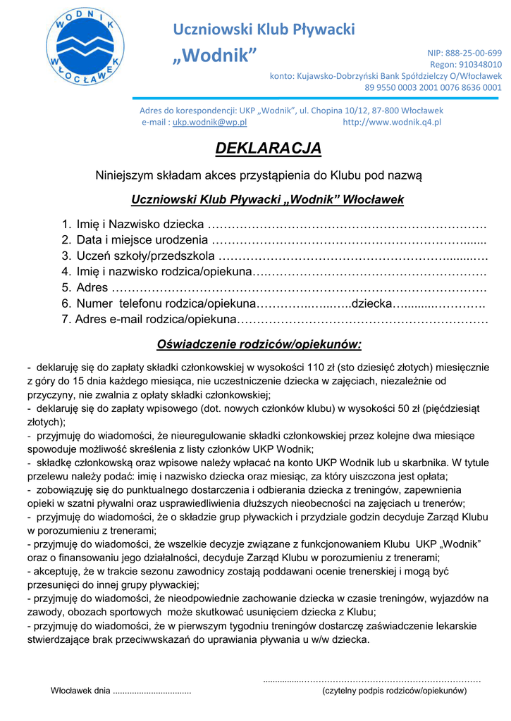 Uczniowski Klub Pływacki „Wodnik” www.wodnik.q4.pl NIP: 888-25-00-699 Regon: 910348010 konto: Kujawsko-Dobrzyński Bank Spółdzielczy O/Włocławek 89 9550 0003 2001 0076 8636 0001 Adres do korespondencji: UKP „Wodnik”, ul. Chopina 10/12, 87-800 Włocławek e-mail : [email protected] http://www.wodnik.q4.pl DEKLARACJA wwwWłocławek Niniejszym składam akces przystąpienia do Klubu pod nazwą Uczniowski Klub Pływacki „Wodnik” Włocławek 1. Imię i Nazwisko dziecka ……………………………………………………………. 2. Data i miejsce urodzenia ………………………………………………………....... 3. Uczeń szkoły/przedszkola …………………………………………………........…. 4. Imię i nazwisko rodzica/opiekuna….………………………………………………. 5. Adres …………………………………………………………………………………. 6. Numer telefonu rodzica/opiekuna…………..…...…..dziecka….........…………. 7. Adres e-mail rodzica/opiekuna……………………………………………………… Oświadczenie rodziców/opiekunów: - deklaruję się do zapłaty składki członkowskiej w wysokości 110 zł (sto dziesięć złotych) miesięcznie z góry do 15 dnia każdego miesiąca, nie uczestniczenie dziecka w zajęciach, niezależnie od przyczyny, nie zwalnia z opłaty składki członkowskiej; - deklaruję się do zapłaty wpisowego (dot. nowych członków klubu) w wysokości 50 zł (pięćdziesiąt złotych); - przyjmuję do wiadomości, że nieuregulowanie składki członkowskiej przez kolejne dwa miesiące spowoduje możliwość skreślenia z listy członków UKP Wodnik; - składkę członkowską oraz wpisowe należy wpłacać na konto UKP Wodnik lub u skarbnika. W tytule przelewu należy podać: imię i nazwisko dziecka oraz miesiąc, za który uiszczona jest opłata; - zobowiązuję się do punktualnego dostarczenia i odbierania dziecka z treningów, zapewnienia opieki w szatni pływalni oraz usprawiedliwienia dłuższych nieobecności na zajęciach u trenerów; - przyjmuję do wiadomości, że o składzie grup pływackich i przydziale godzin decyduje Zarząd Klubu w porozumieniu z trenerami; - przyjmuję do wiadomości, że wszelkie decyzje związane z funkcjonowaniem Klubu UKP „Wodnik” oraz o finansowaniu jego działalności, decyduje Zarząd Klubu w porozumieniu z trenerami; - akceptuję, że w trakcie sezonu zawodnicy zostają poddawani ocenie trenerskiej i mogą być przesunięci do innej grupy pływackiej; - przyjmuję do wiadomości, że nieodpowiednie zachowanie dziecka w czasie treningów, wyjazdów na zawody, obozach sportowych może skutkować usunięciem dziecka z Klubu; - przyjmuję do wiadomości, że w pierwszym tygodniu treningów dostarczę zaświadczenie lekarskie stwierdzające brak przeciwwskazań do uprawiania pływania u w/w dziecka. Włocławek dnia ................................. ................……………………………………………………… (czytelny podpis rodziców/opiekunów) ....................................................................................................................... imię i nazwisko dziecka Jest członkiem UKP WODNIK Włocławek od dnia ………………………… DEKLARACJA WAŻNA DO DNIA Data ważności Podpis rodzica Podpis Członka Zarządu