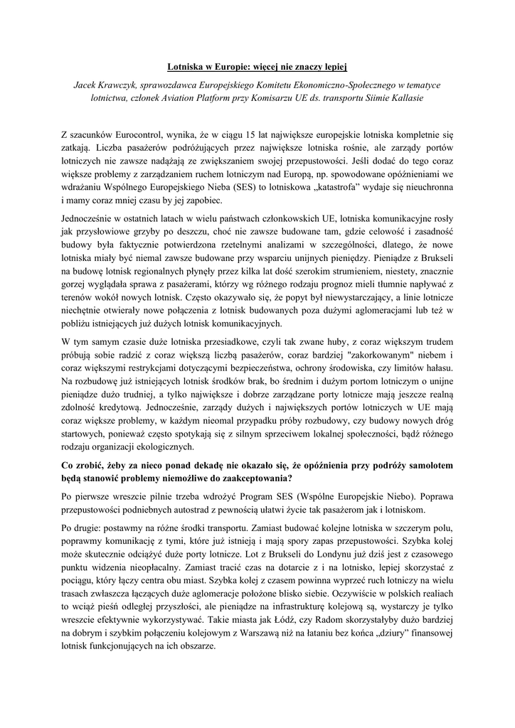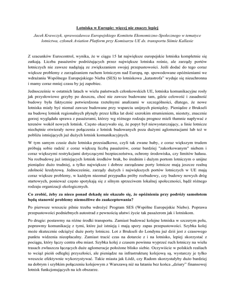Lotniska w Europie: więcej nie znaczy lepiej Jacek Krawczyk, sprawozdawca Europejskiego Komitetu Ekonomiczno-Społecznego w tematyce lotnictwa, członek Aviation Platform przy Komisarzu UE ds. transportu Siimie Kallasie Z szacunków Eurocontrol, wynika, że w ciągu 15 lat największe europejskie lotniska kompletnie się zatkają. Liczba pasażerów podróżujących przez największe lotniska rośnie, ale zarządy portów lotniczych nie zawsze nadążają ze zwiększaniem swojej przepustowości. Jeśli dodać do tego coraz większe problemy z zarządzaniem ruchem lotniczym nad Europą, np. spowodowane opóźnieniami we wdrażaniu Wspólnego Europejskiego Nieba (SES) to lotniskowa „katastrofa” wydaje się nieuchronna i mamy coraz mniej czasu by jej zapobiec. Jednocześnie w ostatnich latach w wielu państwach członkowskich UE, lotniska komunikacyjne rosły jak przysłowiowe grzyby po deszczu, choć nie zawsze budowane tam, gdzie celowość i zasadność budowy była faktycznie potwierdzona rzetelnymi analizami w szczególności, dlatego, że nowe lotniska miały być niemal zawsze budowane przy wsparciu unijnych pieniędzy. Pieniądze z Brukseli na budowę lotnisk regionalnych płynęły przez kilka lat dość szerokim strumieniem, niestety, znacznie gorzej wyglądała sprawa z pasażerami, którzy wg różnego rodzaju prognoz mieli tłumnie napływać z terenów wokół nowych lotnisk. Często okazywało się, że popyt był niewystarczający, a linie lotnicze niechętnie otwierały nowe połączenia z lotnisk budowanych poza dużymi aglomeracjami lub też w pobliżu istniejących już dużych lotnisk komunikacyjnych. W tym samym czasie duże lotniska przesiadkowe, czyli tak zwane huby, z coraz większym trudem próbują sobie radzić z coraz większą liczbą pasażerów, coraz bardziej "zakorkowanym" niebem i coraz większymi restrykcjami dotyczącymi bezpieczeństwa, ochrony środowiska, czy limitów hałasu. Na rozbudowę już istniejących lotnisk środków brak, bo średnim i dużym portom lotniczym o unijne pieniądze dużo trudniej, a tylko największe i dobrze zarządzane porty lotnicze mają jeszcze realną zdolność kredytową. Jednocześnie, zarządy dużych i największych portów lotniczych w UE mają coraz większe problemy, w każdym nieomal przypadku próby rozbudowy, czy budowy nowych dróg startowych, ponieważ często spotykają się z silnym sprzeciwem lokalnej społeczności, bądź różnego rodzaju organizacji ekologicznych. Co zrobić, żeby za nieco ponad dekadę nie okazało się, że opóźnienia przy podróży samolotem będą stanowić problemy niemożliwe do zaakceptowania? Po pierwsze wreszcie pilnie trzeba wdrożyć Program SES (Wspólne Europejskie Niebo). Poprawa przepustowości podniebnych autostrad z pewnością ułatwi życie tak pasażerom jak i lotniskom. Po drugie: postawmy na różne środki transportu. Zamiast budować kolejne lotniska w szczerym polu, poprawmy komunikację z tymi, które już istnieją i mają spory zapas przepustowości. Szybka kolej może skutecznie odciążyć duże porty lotnicze. Lot z Brukseli do Londynu już dziś jest z czasowego punktu widzenia nieopłacalny. Zamiast tracić czas na dotarcie z i na lotnisko, lepiej skorzystać z pociągu, który łączy centra obu miast. Szybka kolej z czasem powinna wyprzeć ruch lotniczy na wielu trasach zwłaszcza łączących duże aglomeracje położone blisko siebie. Oczywiście w polskich realiach to wciąż pieśń odległej przyszłości, ale pieniądze na infrastrukturę kolejową są, wystarczy je tylko wreszcie efektywnie wykorzystywać. Takie miasta jak Łódź, czy Radom skorzystałyby dużo bardziej na dobrym i szybkim połączeniu kolejowym z Warszawą niż na łataniu bez końca „dziury” finansowej lotnisk funkcjonujących na ich obszarze. Po trzecie, potrzeba całościowego, europejskiego spojrzenia na lotnictwo. Tylko na europejskim poziomie można ostatecznie ustalić, które porty są kluczowe dla konkurencyjności europejskiego lotnictwa, wesprzeć ich rozbudowę i modernizację i zacieśnić współpracę pomiędzy liniami lotniczymi, lotniskami i managerami przestrzeni powietrznej. Czas skończyć ze sztywnym podziałem na huby i lotniska regionalne przeznaczone tylko dla tanich linii lotniczych, ponieważ obie kategorie przewoźników lotniczych mogą nie tylko doskonale się uzupełniać, ale i blisko współpracować. Częścią takiej strategii musi być również rozwiązanie problemu „capacity crunch” poprzez dalszą poprawę efektywności istniejącej infrastruktury oraz selektywne ekonomicznie uzasadnione inwestycje w nową infrastrukturę lotniskową. Jeśli spojrzeć na zagadnienie z polskiej perspektywy to na pierwszy rzut oka problemu nie ma. Nasze porty lotnicze mają ogromny zapas przepustowości, często dużo większy niż ruch, który będą w stanie kiedykolwiek wygenerować, biorąc pod uwagę uwarunkowania ekonomiczne. Ale struktura polskiej sieci lotnisk pozostawia wiele do życzenia. W inwestycyjnym owczym pędzie lotnisko chciał mieć każdy region, bez względu na koszty i bez spojrzenia w przyszłość. Kilka miesięcy temu Unia Europejska postanowiła te zapędy ograniczyć. Nowe wytyczne dotyczące pomocy publicznej dla lotnisk i linii lotniczych zdecydowanie ograniczają dostęp do funduszy i wymuszają na lotniskach opracowanie realnych biznes planów, zakładających generowanie zysków w określonej perspektywie czasowej. Niestety pod naciskiem samorządów i eurodeputowanych część regulacji złagodzono i wciąż istnieją furtki, które mogą umożliwić niektórym liniom lotniczym i lotniskom funkcjonować za publiczne pieniądze. Wszystkim, którzy z tego powodu już się cieszą pozostawiam jednak pod rozwagę ostatnie decyzje Komisji Europejskiej. Po 12 latach prawniczych przepychanek Komisja ogłosiła, że lotnisko Charleroi (port lotniczy pod Brukselą, jedna z największych baz Ryanaira) musi zwrócić w