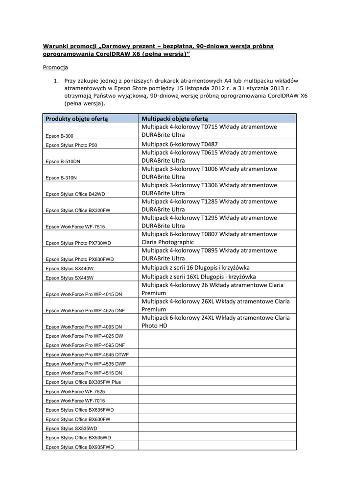 Warunki promocji „Darmowy prezent – bezpłatna, 90-dniowa wersja próbna oprogramowania CorelDRAW X6 (pełna wersja)” Promocja 1. Przy zakupie jednej z poniższych drukarek atramentowych A4 lub multipacku wkładów atramentowych w Epson Store pomiędzy 15 listopada 2012 r. a 31 stycznia 2013 r. otrzymają Państwo wyjątkową, 90-dniową wersję próbną oprogramowania CorelDRAW X6 (pełna wersja). Produkty objęte ofertą Epson B-300 Epson Stylus Photo P50 Epson B-510DN Epson B-310N Epson Stylus Office B42WD Epson Stylus Office BX320FW Epson WorkForce WF-7515 Epson Stylus Photo PX730WD Epson Stylus Photo PX830FWD Epson Stylus SX440W Epson Stylus SX445W Epson WorkForce Pro WP-4015 DN Epson WorkForce Pro WP-4525 DNF Epson WorkForce Pro WP-4095 DN Epson WorkForce Pro WP-4025 DW Epson WorkForce Pro WP-4595 DNF Epson WorkForce Pro WP-4545 DTWF Epson WorkForce Pro WP-4535 DWF Epson WorkForce Pro WP-4515 DN Epson Stylus Office BX305FW Plus Epson WorkForce WF-7525 Epson WorkForce WF-7015 Epson Stylus Office BX635FWD Epson Stylus Office BX630FW Epson Stylus SX535WD Epson Stylus Office BX535WD Epson Stylus Office BX935FWD Multipacki objęte ofertą Multipack 4-kolorowy T0715 Wkłady atramentowe DURABrite Ultra Multipack 6-kolorowy T0487 Multipack 4-kolorowy T0615 Wkłady atramentowe DURABrite Ultra Multipack 3-kolorowy T1006 Wkłady atramentowe DURABrite Ultra Multipack 3-kolorowy T1306 Wkłady atramentowe DURABrite Ultra Multipack 4-kolorowy T1285 Wkłady atramentowe DURABrite Ultra Multipack 4-kolorowy T1295 Wkłady atramentowe DURABrite Ultra Multipack 6-kolorowy T0807 Wkłady atramentowe Claria Photographic Multipack 4-kolorowy T0895 Wkłady atramentowe DURABrite Ultra Multipack z serii 16 Długopis i krzyżówka Multipack z serii 16XL Długopis i krzyżówka Multipack 4-kolorowy 26 Wkłady atramentowe Claria Premium Multipack 4-kolorowy 26XL Wkłady atramentowe Claria Premium Multipack 6-kolorowy 24XL Wkłady atramentowe Claria Photo HD Epson Expression Home XP-402 Epson Expression Home XP-405 Epson Expression Home XP-405WH Epson WorkForce WF-3540DTWF Epson WorkForce WF-3530DTWF Epson WorkForce WF-3520DWF Epson WorkForce WF-3010DW Epson WorkForce WF-2540WF Epson WorkForce WF-2530WF Epson WorkForce WF-2520NF Expression Premium XP-800 Expression Premium XP-700 Expression Premium XP-600 Procedura 2. Aby otrzymać bezpłatną, 90-dniową wersję próbną oprogramowania CorelDRAW X6, należy wejść na www.epson.pl i zakupić objętą promocją drukarkę atramentową lub multipack wkładów atramentowych. Po złożeniu zamówienia otrzymają Państwo automatyczną wiadomość e-mail – „Potwierdzenie zamówienia”, a następnie wiadomość zawierającą odnośnik, za pomocą którego będzie można pobrać bezpłatną, 90-dniową wersję próbną oprogramowania CorelDRAW. 3. Odnośnik będzie ważny przez tydzień; nie ma możliwości ponownego wygenerowania go w przypadku utraty lub skasowania. 4. Do każdego zakupionego produktu objętego promocją wysyłany jest tylko jeden odnośnik. Prezentu nie można zamienić na gotówkę czy inny przedmiot. Oprogramowanie nie może zostać przekazane innej osobie. 5. Darmowe wersje próbne produktów zależą od warunków umowy licencyjnej użytkownika oprogramowania i umowy o świadczeniu usług dołączonej do oprogramowania. Należy pamiętać, że instalacja darmowej wersji próbnej może okazać się niemożliwa w przypadku gdy konfiguracja sprzętu lub oprogramowania jest niezgodna z wymaganiami technicznymi. Aby używać oprogramowania po upływie 90 dni, należy nabyć klucz licencji. 6. W przypadku zwrotu produktu firmy Epson do sprzedawcy klient nie będzie uprawniony do ubiegania się o otrzymanie lub do zatrzymania darmowego prezentu, niezależnie od powodu zwrotu produktu. 7. Niniejsza promocja jest dostępna wyłącznie dla osób pełnoletnich (powyżej 18 roku życia), zamieszkałych w Polsce. Wykorzystanie danych osobowych 8. Dane osobowe zebrane podczas promocji zostaną przetworzone zgodnie z odpowiednim lokalnym prawem i przepisami dotyczącymi ochrony danych oraz zgodnie z polityką prywatności Organizatora promocji. W każdej chwili można zwrócić się do Organizatora promocji z prośbą o zmianę, aktualizację lub usunięcie danych osobowych, wysyłając pismo na adres korespondencyjny Organizatora. 9. Dane osobowe mogą być wykorzystywane do informowania o produktach, usługach i wydarzeniach lub o innych elementach oferty Organizatora, które mogą Państwa interesować, o ile udzielili Państwo zgody na takie wykorzystanie Państwa danych osobowych w momencie rejestracji na stronie internetowej Organizatora promocji. Każdy otrzymany przez Państwa elektroniczny komunikat promocyjny będzie zawierał możliwość rezygnacji z otrzymywania ofert promocyjnych przez zaznaczenie odpowiedniego pola. Pozostałe warunki 10. Niniejsze warunki podlegają prawodawstwu kraju, w którym zakupiono produkt firmy Epson, a także jurysdykcji właściwych sądów w tym kraju. 11. Wzięcie udziału w promocji oznacza, że uczestnik przeczytał, zrozumiał i zaakceptował niniejsze warunki. Organizator promocji zastrzega sobie prawo do unieważnienia lub zmiany niniejszych warunków bez uprzedniego powiadomienia w przypadku zaistnienia okoliczności od niego niezależnych. 12. Organizator zastrzega sobie prawo do zastąpienia dowolnego darmowego prezentu (częściowo lub w całości) innym darmowym prezentem o zbliżonej wartości w przypadku wystąpienia pozostających poza jego kontrolą trudności w uzyskaniu oferowanych darmowych prezentów. Organizator: Organizatorem promocji jest firma Epson Europe B.V. z siedzibą w Amsterdamie w Holandii. Wszelką korespondencję prosimy kierować na następujący adres: Epson Europe Marketing Department, Westside, London Road, Apsley, Hemel Hempstead, Herts HP3 9TD, Wielka Brytania.