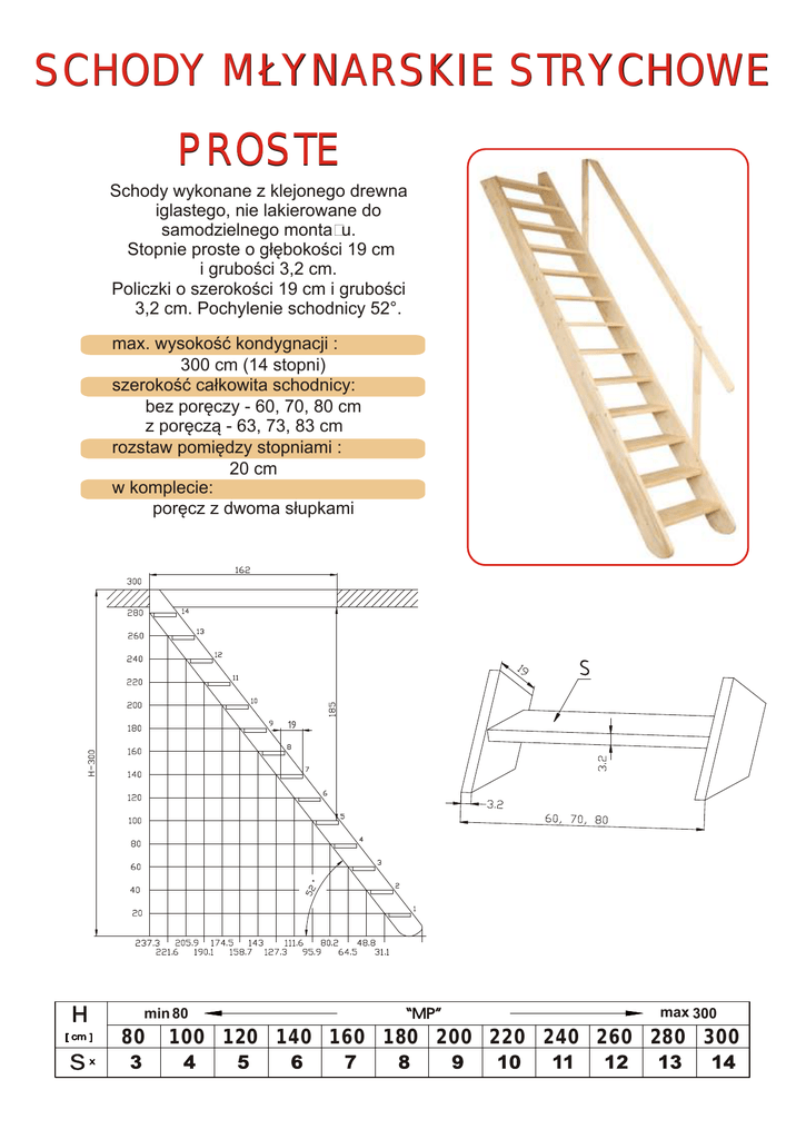 SCHODY MŁYNARSKIE STRYCHOWE PROSTE Schody wykonane z klejonego drewna iglastego, nie lakierowane do samodzielnego montażu. Stopnie proste o głębokości 19 cm i grubości 3,2 cm. Policzki o szerokości 19 cm i grubości 3,2 cm. Pochylenie schodnicy 52°. max. wysokość kondygnacji : 300 cm (14 stopni) szerokość całkowita schodnicy: bez poręczy - 60, 70, 80 cm z poręczą - 63, 73, 83 cm rozstaw pomiędzy stopniami : 20 cm w komplecie: poręcz z dwoma słupkami min 80 80 max 300 100 120 140 160 180 200 220 240 260 280 300