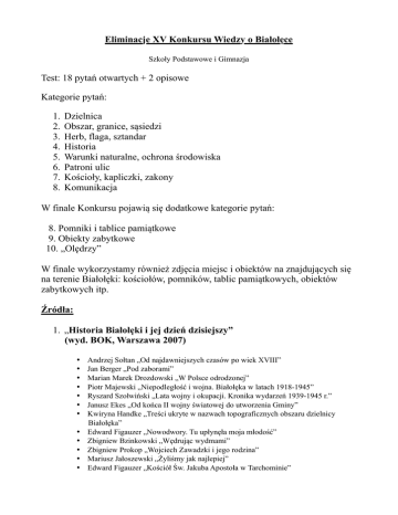 Eliminacje XV Konkursu Wiedzy o Białołęce Szkoły Podstawowe i Gimnazja Test: 18 pytań otwartych + 2 opisowe Kategorie pytań: 1. 2. 3. 4. 5. 6. 7. 8. Dzielnica Obszar, granice, sąsiedzi Herb, flaga, sztandar Historia Warunki naturalne, ochrona środowiska Patroni ulic Kościoły, kapliczki, zakony Komunikacja W finale Konkursu pojawią się dodatkowe kategorie pytań: 8. Pomniki i tablice pamiątkowe 9. Obiekty zabytkowe 10. „Olędrzy” W finale wykorzystamy również zdjęcia miejsc i obiektów na znajdujących się na terenie Białołęki: kościołów, pomników, tablic pamiątkowych, obiektów zabytkowych itp. Źródła: 1. „Historia Białołęki i jej dzień dzisiejszy” (wyd. BOK, Warszawa 2007) • • • • • • • • • • • • Andrzej Sołtan „Od najdawniejszych czasów po wiek XVIII” Jan Berger „Pod zaborami” Marian Marek Drozdowski „W Polsce odrodzonej” Piotr Majewski „Niepodległość i wojna. Białołęka w latach 1918-1945” Ryszard Szołwiński „Lata wojny i okupacji. Kronika wydarzeń 1939-1945 r.” Janusz Ekes „Od końca II wojny światowej do utworzenia Gminy” Kwiryna Handke „Treści ukryte w nazwach topograficznych obszaru dzielnicy Białołęka” Edward Figauzer „Nowodwory. Tu upłynęła moja młodość” Zbigniew Bzinkowski „Wędrując wydmami” Zbigniew Prokop „Wojciech Zawadzki i jego rodzina” Mariusz Jałoszewski „Żyliśmy jak najlepiej” Edward Figauzer „Kościół Św. Jakuba Apostoła w Tarchominie” • Bartłomiej Włodkowski „O krzyżach w Dąbrówce, podchmielonym Maćku i prawdziwym diable” • Krzysztof Madej „Miejsca pochówku na Białołęce” • Krzysztof Madej „Wąskotorówka Jabłonna – Karczew • Edward Figauzer „ Kanał i port żerański” 2. Inne • • • • • • • www. bialoleka.waw.pl www.ztm.waw.pl www.agenda21.waw.pl (wędrówki nadwiślańskie, trasa III) www.trasbus.com www.ebialoleka.pl www.czasbialoleki.pl www.gazetaecho.pl (Białołęka) 3. Polecamy • www.youtube.com („białołęka magiczna” – film). Również na www.fundacjaave.pl (projekty historyczne)