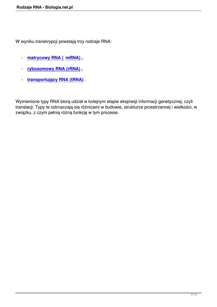 Rodzaje RNA - Biologia.net.pl W wyniku transkrypcji powstają trzy rodzaje RNA: - matrycowy RNA ( mRNA) , - rybosomowy RNA (rRNA) , - transportujący RNA (tRNA) . Wymienione typy RNA biorą udział w kolejnym etapie ekspresji informacji genetycznej, czyli translacji. Typy te odznaczają się różnicami w budowie, strukturze przestrzennej i wielkości, w związku, z czym pełnią różną funkcję w tym procesie. 1/1