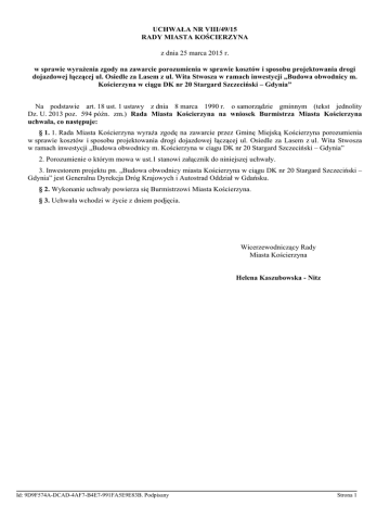 UCHWAŁA NR VIII/49/15 RADY MIASTA KOŚCIERZYNA z dnia 25 marca 2015 r. w sprawie wyrażenia zgody na zawarcie porozumienia w sprawie kosztów i sposobu projektowania drogi dojazdowej łączącej ul. Osiedle za Lasem z ul. Wita Stwosza w ramach inwestycji „Budowa obwodnicy m. Kościerzyna w ciągu DK nr 20 Stargard Szczeciński – Gdynia” Na podstawie art. 18 ust. 1 ustawy z dnia 8 marca 1990 r. o samorządzie gminnym (tekst jednolity Dz. U. 2013 poz. 594 późn. zm.) Rada Miasta Kościerzyna na wniosek Burmistrza Miasta Kościerzyna uchwala, co następuje: § 1. 1. Rada Miasta Kościerzyna wyraża zgodę na zawarcie przez Gminę Miejską Kościerzyna porozumienia w sprawie kosztów i sposobu projektowania drogi dojazdowej łączącej ul. Osiedle za Lasem z ul. Wita Stwosza w ramach inwestycji „Budowa obwodnicy m. Kościerzyna w ciągu DK nr 20 Stargard Szczeciński – Gdynia” 2. Porozumienie o którym mowa w ust.1 stanowi załącznik do niniejszej uchwały. 3. Inwestorem projektu pn. „Budowa obwodnicy miasta Kościerzyna w ciągu DK nr 20 Stargard Szczeciński – Gdynia” jest Generalna Dyrekcja Dróg Krajowych i Autostrad Oddział w Gdańsku. § 2. Wykonanie uchwały powierza się Burmistrzowi Miasta Kościerzyna. § 3. Uchwała wchodzi w życie z dniem podjęcia. Wicerzewodniczący Rady Miasta Kościerzyna Helena Kaszubowska - Nitz Id: 9D9F574A-DCAD-4AF7-B4E7-991FA5E9E83B. Podpisany Strona 1 POROZUMIENIE zawarte w dniu ……………… 2015 r. w Gdańsku w sprawie kosztów i sposobu projektowania drogi dojazdowej łączącej ul. Osiedle za Lasem z ul. Wita Stwosza w ramach inwestycji „Budowa obwodnicy m. Kościerzyna w ciągu DK nr 20 Stargard Szczeciński – Gdynia” przez Gminę Miejską Kościerzyna . Porozumienie zawarto pomiędzy: 1. Generalna Dyrekcją Dróg Krajowych i Autostrad Oddział w Gdańsku, reprezentowaną przez : - …………………………..- Dyrektora Oddziału GDDKiA w Gdańsku, - ………………………….. - Zastępcy Dyrektora Oddziału GDDKiA w Gdańsku zwaną w treści porozumienia GDDKiA a Gmina Miejska Kościerzyna, reprezentowana przez: …………………………………………………………………….. zwaną w treści porozumienia Gminą oraz konsorcjum: firma STRABAG Sp. z o.o. z siedzibą w Pruszkowie, ul. Parzniewska 10, 05-800 Pruszków wpisaną do rejestru przedsiębiorców Krajowego Rejestru Sądowego Sądu Rejonowego dla m. ST. Warszawy ………….Wydział Gospodarczy pod numerem ……………………, kapitał zakładowy…… firma Strabag Infrastruktura Południe Sp. z o.o. z siedzibą w Wysokiej ul. Lipowa 5a 52-200 Wrocław wpisaną do rejestru przedsiębiorców Krajowego Rejestru Sądowego Sądu Rejonowego dla ……………….Wydział Gospodarczy pod numerem ……………………, kapitał zakładowy…… reprezentowanym przez: …………………………………………. – …………………………………………. zwaną w treści Porozumienia WYKONAWCĄ. §1 Niniejsze porozumienie zostaje zawarte pomiędzy stronami w celu uregulowania warunków włączenia planowanej drogi dojazdowej łączącej ul. Osiedle za Lasem z ul. Wita Stwosza do projektu w ramach inwestycji Budowa obwodnicy m. Kościerzyna w ciągu DK nr 20 Stargard Szczeciński – Gdynia. §2 1. Strony zgodnie postanawiają, że projektowana droga zostanie włączona w celu usprawnienia obsługi strefy ekonomicznej w miejscowości Kościerzyna, natomiast Gmina pokryje w całości koszty związane z zaprojektowaniem i budową drogi łączącej docelowo ul. Wita Stwosza z ul. Osiedlem za Lasem. 2. Gmina we własnym zakresie wykona projekt włączenia drogi oraz dokona wyboru Wykonawcy robót. §3 Warunkiem wiążącym dla niniejszego Porozumienia jest zakończenie wszystkich niezbędnych czynności i dostarczenie wymaganych dokumentów takich jak projekt i uchwała Rady Miasta o wyrażeniu zgody na realizację przedmiotowej inwestycji i zapewnienie jej finansowania oraz sposobu rozliczenia za przejęte 1 Id: 9D9F574A-DCAD-4AF7-B4E7-991FA5E9E83B. Podpisany Strona 1 przez GDDKiA grunty od dnia planowanego przez Wykonawcę złożenia wniosku o wydanie decyzji zezwalającej na realizację inwestycji drogowej, to jest do dnia 30.04.2015r. W przypadku niedotrzymania powyższego terminu niniejsze Porozumienie przestaje obwiązywać. §4 1. Gmina Miasta Kościerzyna z tytułu włączenia drogi określonej w § 1, nie będzie w stosunku do GDDKiA zgłaszać żadnych roszczeń finansowych, w tym roszczeń o zapłatę odszkodowań za przejęte przez GDDKiA grunty gminy. 2. Gmina Miasta Kościerzyna zobowiązuje się do zawarcia, w trakcie postępowania o ustaleniu wysokości odszkodowania prowadzonego przez Wojewodę Pomorskiego, ugody administracyjnej w treści której wyrazi zgodę obniżenia wysokości odszkodowania za nieruchomości przejęte na rzecz Skarbu Państwa do kwoty 1 zł. 3. GDDKiA zobowiązuje się do włączenia projektu drogi wymienionej w § 1 w całość projektu inwestycji „Budowa obwodnicy m. Kościerzyna w ciągu DK nr 20 Stargard Szczeciński – Gdynia” oraz przekazania jej w zarząd Gminy po zrealizowaniu inwestycji. §5 Strony Porozumienia postanawiają, że wszelkie spory powstałe w trakcie realizacji zadania „Budowa obwodnicy m. Kościerzyna w ciągu DK nr 20 Stargard Szczeciński – Gdynia” będą w pierwszej kolejności rozstrzygane w drodze polubownej. §6 Porozumienie zostało sporządzone w czterech jednobrzmiących egzemplarzach, dwa egzemplarze dla GDDKiA i po jednym egzemplarzu dla pozostałych stron. Wszelkie zmiany, uzupełnienia do niniejszego porozumienia zostaną sporządzone na piśmie pod rygorem ich nieważności. GDDKiA Gmina Wykonawca 2 Id: 9D9F574A-DCAD-4AF7-B4E7-991FA5E9E83B. Podpisany Strona 2 UZASADNIENIE W związku z podejmowaną przez Generalną Dyrekcją Dróg Krajowych i Autostrad Oddział w Gdańsku realizację projektu pn. „Budowa obwodnicy miasta Kościer