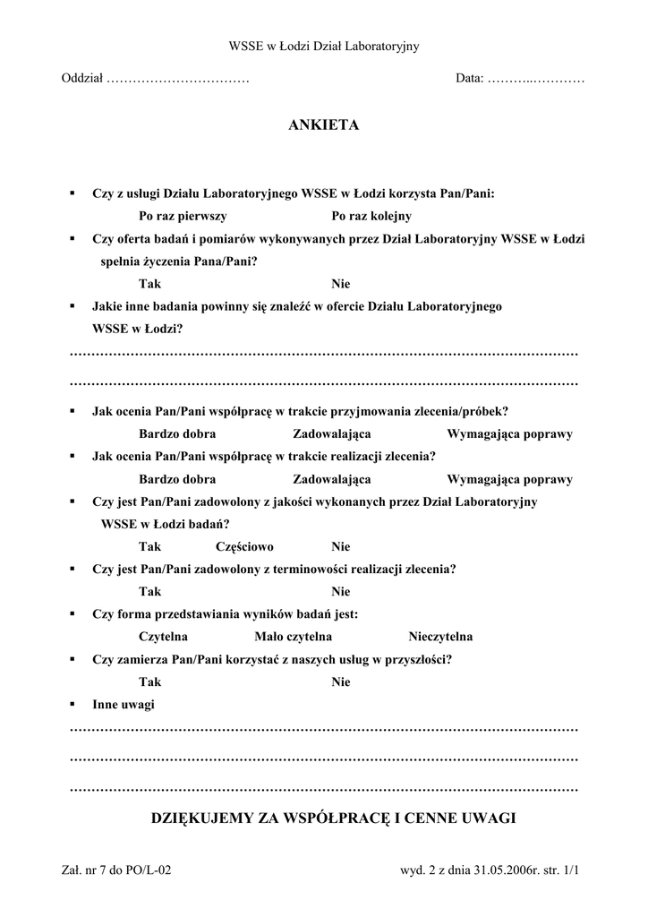 WSSE w Łodzi Dział Laboratoryjny Oddział …………………………… Data: ………..………… ANKIETA Czy z usługi Działu Laboratoryjnego WSSE w Łodzi korzysta Pan/Pani: Po raz pierwszy Po raz kolejny Czy oferta badań i pomiarów wykonywanych przez Dział Laboratoryjny WSSE w Łodzi spełnia Ŝyczenia Pana/Pani? Tak Nie Jakie inne badania powinny się znaleźć w ofercie Działu Laboratoryjnego WSSE w Łodzi? ……………………………………………………………………………………………………… ……………………………………………………………………………………………………… Jak ocenia Pan/Pani współpracę w trakcie przyjmowania zlecenia/próbek? Bardzo dobra Zadowalająca Jak ocenia Pan/Pani współpracę w trakcie realizacji zlecenia? Bardzo dobra Wymagająca poprawy Zadowalająca Wymagająca poprawy Czy jest Pan/Pani zadowolony z jakości wykonanych przez Dział Laboratoryjny WSSE w Łodzi badań? Tak Mało czytelna Nieczytelna Czy zamierza Pan/Pani korzystać z naszych usług w przyszłości? Tak Nie Czy forma przedstawiania wyników badań jest: Czytelna Nie Czy jest Pan/Pani zadowolony z terminowości realizacji zlecenia? Tak Częściowo Nie Inne uwagi ……………………………………………………………………………………………………… ……………………………………………………………………………………………………… ……………………………………………………………………………………………………… DZIĘKUJEMY ZA WSPÓŁPRACĘ I CENNE UWAGI Zał. nr 7 do PO/L-02 wyd. 2 z dnia 31.05.2006r. str. 1/1
