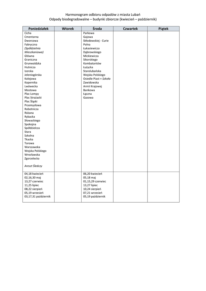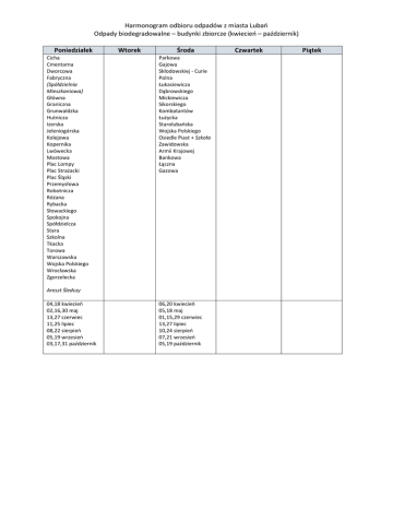 Harmonogram odbioru odpadów z miasta Lubań Odpady biodegradowalne – budynki zbiorcze (kwiecień – październik) Poniedziałek Cicha Cmentarna Dworcowa Fabryczna (Spółdzielnia Mieszkaniowa) Główna Graniczna Grunwaldzka Hutnicza Izerska Jeleniogórska Kolejowa Kopernika Lwówecka Mostowa Plac Lompy Plac Strażacki Plac Śląski Przemysłowa Robotnicza Różana Rybacka Słowackiego Spokojna Spółdzielcza Stara Szkolna Tkacka Torowa Warszawska Wojska Polskiego Wrocławska Zgorzelecka Wtorek Środa Parkowa Gajowa Skłodowskiej - Curie Polna Łukasiewicza Dąbrowskiego Mickiewicza Sikorskiego Kombatantów Łużycka Starolubańska Wojska Polskiego Osiedle Piast + Szkoła Zawidowska Armii Krajowej Bankowa Łączna Gazowa Areszt Śledczy 04,18 kwiecień 02,16,30 maj 13,27 czerwiec 11,25 lipiec 08,22 sierpień 05,19 wrzesień 03,17,31 październik 06,20 kwiecień 05,18 maj 01,15,29 czerwiec 13,27 lipiec 10,24 sierpień 07,21 wrzesień 05,19 październik Czwartek Piątek
