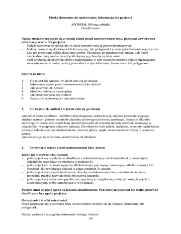 Ulotka dołączona do opakowania: informacja dla pacjenta ANTICOL 500 mg, tabletki Disulfiramum Należy uważnie zapoznać się z treścią ulotki przed zastosowaniem leku, ponieważ zawiera ona informacje ważne dla pacjenta. - Należy zachować tę ulotkę, aby w razie potrzeby móc ją ponownie przeczytać. - Należy zwrócić się do lekarza lub farmaceuty, lub pielęgniarki w razie jakichkolwiek wątpliwości. - Lek ten przepisano ściśle określonej osobie. Nie należy go przekazywać innym. Lek może zaszkodzić innej osobie, nawet jeśli objawy jej choroby są takie same. - Jeśli wystąpią jakiekolwiek objawy niepożądane, w tym wszelkie możliwe objawy niepożądane niewymienione w ulotce, należy powiedzieć o tym lekarzowi, farmaceucie lub pielęgniarce. Spis treści ulotki 1. 2. 3. 4. 5. 6. Co to jest lek Anticol i w jakim celu się go stosuje Informacje ważne przed zastosowaniem leku Anticol Jak stosować lek Anticol Możliwe działania niepożądane Jak przechowywać lek Anticol Zawartość opakowania i inne informacje 1. Co to jest lek Anticol i w jakim celu się go stosuje Anticol zawiera disulfiram - inhibitor dehydrogenazy aldehydowej, enzymu przekształcającego aldehyd octowy (główny metabolit alkoholu etylowego) do kwasu octowego. Spożycie alkoholu etylowego w czasie stosowania leku Anticol prowadzi do wzrostu stężenia aldehydu octowego w organizmie i wystąpienia objawów zatrucia. Do objawów tych należą: nudności, wymioty, tachykardia (uczucie kołatania serca), niedociśnienie, zawroty głowy, nagłe zaczerwienienie twarzy z uczuciem gorąca. Anticol stosuje się w leczeniu uzależnienia od alkoholu. 2. Informacje ważne przed zastosowaniem leku Anticol Kiedy nie stosować leku Anticol: - jeśli pacjent ma uczulenie na disulfiram i tiokarbaminiany lub którykolwiek z pozostałych składników tego leku (wymienione w punkcie 6); - jeśli pacjent jest w stanie upojenia alkoholowego, pije napoje zawierające alkohol etylowy lub stosował leki zawierające alkohol w ciągu ostatnich 24 godzin; - jeśli pacjent ma niewydolność serca, chorobę niedokrwienną serca, nadciśnienie tętnicze, uprzednio przebył niewydolność obwodową krążenia; - jeśli pacjent ma zaburzenia psychiczne, psychozy (z wyjątkiem przebytych ostrych psychoz alkoholowych), próby samobójcze w wywiadach. Pacjent musi wyrazić zgodę na leczenie disulfiramem. Pod żadnym pozorem nie wolno podawać disulfiramu bez zgody pacjenta. Ostrzeżenia i środki ostrożności Przed rozpoczęciem stosowania leku Anticol należy zwrócić się do lekarza, farmaceuty lub pielęgniarki. Należy zachować szczególną ostrożność stosując Anticol: 1/4 - u pacjentów z chorobami układu oddechowego lub serca, cukrzycą, padaczką. Wystąpienie reakcji disulfiram - alkohol może pogłębić stopień zaawansowania tych chorób. u pacjentów z niewydolnością nerek i (lub) wątroby. Podczas leczenia odwykowego oraz w ciągu tygodnia od zakończenia terapii obowiązuje zakaz picia napojów alkoholowych. Picie alkoholu w trakcie terapii disulfiramem może powodować wystąpienie objawów zagrażających życiu. Objawy nietolerancji alkoholu mogą wystąpić także po zastosowaniu płynów zawierających alkohol (np. płyny do płukania jamy ustnej, sosy, ocet, syropy przeciwkaszlowe, środki rozgrzewające, płyny po goleniu i inne kosmetyki). Inne leki i Anticol Należy powiedzieć lekarzowi lub farmaceucie o wszystkich lekach stosowanych obecnie lub ostatnio a także o lekach, które pacjent planuje stosować. Disulfiram nasila działanie: leków przeciwzakrzepowych, antypiryny, fenytoiny, chlordiazepoksydu i diazepamu. Badania przeprowadzone na zwierzętach wskazują na podobny wpływ na metabolizm petydyny, morfiny i amfetaminy. Amitryptylina i chlorpromazyna mogą nasilać, a diazepam osłabiać objawy tzw. reakcji disulfiramowej. Disulfiram hamuje reakcje utleniania i wydalanie ryfampicyny przez nerki. Jednoczesne stosowanie izoniazydu i disulfiramu może wpływać na czynność ośrodkowego układu nerwowego i wywoływać zawroty głowy, zaburzenia koordynacji ruchów, drażliwość, bezsenność. Metronidazol i disulfiram stosowane jednocześnie mogą wywołać stany dezorientacji i stany psychotyczne. Nie zaleca się równoczesnego stosowania tych leków. Kontakt z rozpuszczalnikami organicznymi zawierającymi alkohol, aldehyd octowy, paraldehyd (np. stosowane do rozcieńczania farb, benzyna) podczas terapii disulfiramem może wywołać reakcję disulfiramową. Disulfiram może przedłużać czas działania alfentanylu. Ciąża i karmienie piersią W ciąży i w okresie karmienia piersią lub gdy istnieje podejrzenie, że kobieta jest w ciąży, lub gdy planuje ciążę, przed zastosowaniem tego leku należy poradzić się lekarza lub farmaceuty. Nie zaleca się stosowania leku u kobiet w ciąży. Nie zaleca się stosowania leku w okresie karmienia piersią. Prowadzenie pojazdów i obsługiwanie maszyn Jest mało prawdopodobne, aby Anticol wpływał na zdolność prowadzenia pojazdów i obsługiwanie maszyn. 3. Jak stosować lek Anticol Ten lek należy zawsze stosować zgodnie z zaleceniami lekarza lub farmaceuty. W razie wątpliwości należy zwrócić się do lekarza lub farmaceuty. Podawanie leku można rozpocząć po co najmniej 24 - godzinnym okresie abstynencji. Dawka początkowa zwykle wynosi 500 mg na dobę (1 tabl.). Tabletkę stosuje się raz na dobę rano lub w przypadku znacznego nasilenia efektu uspokajającego, wieczorem. Dawkę tę należy stosować zwykle przez 1 do 2 tygodni. Następnie podaje się dawkę podtrzymującą, która wynosi 250 mg na dobę (125 do 500 mg na dobę). Maksymalna dawka doustna wynosi 500 mg na dobę. Czas trwania leczenia disulfiramem określa lekarz. Zastosowanie większej niż zalecana dawki leku Anticol 2/4 Odnotowano objawy ze strony ośrodkowego i obwodowego układu nerwowego, które ustępowały całkowicie - były to wymioty, senność, z