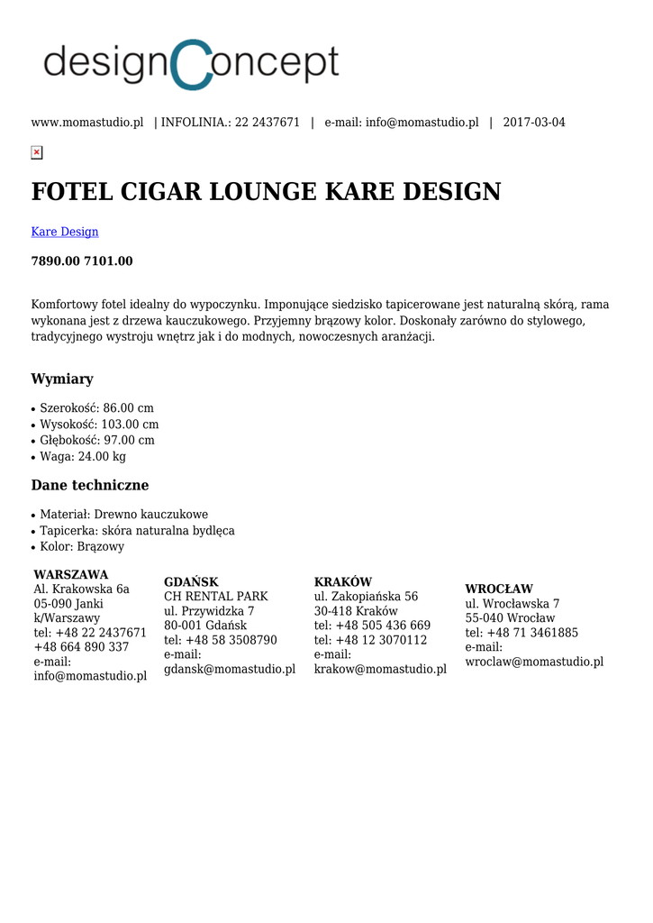 www.momastudio.pl | INFOLINIA.: 22 2437671 | e-mail: [email protected] | 2017-03-04 FOTEL CIGAR LOUNGE KARE DESIGN Kare Design 7890.00 7101.00 Komfortowy fotel idealny do wypoczynku. Imponujące siedzisko tapicerowane jest naturalną skórą, rama wykonana jest z drzewa kauczukowego. Przyjemny brązowy kolor. Doskonały zarówno do stylowego, tradycyjnego wystroju wnętrz jak i do modnych, nowoczesnych aranżacji. Wymiary ● ● ● ● Szerokość: 86.00 cm Wysokość: 103.00 cm Głębokość: 97.00 cm Waga: 24.00 kg Dane techniczne ● ● ● Materiał: Drewno kauczukowe Tapicerka: skóra naturalna bydlęca Kolor: Brązowy WARSZAWA Al. Krakowska 6a 05-090 Janki k/Warszawy tel: +48 22 2437671 +48 664 890 337 e-mail: [email protected] GDAŃSK CH RENTAL PARK ul. Przywidzka 7 80-001 Gdańsk tel: +48 58 3508790 e-mail: [email protected] KRAKÓW ul. Zakopiańska 56 30-418 Kraków tel: +48 505 436 669 tel: +48 12 3070112 e-mail: [email protected] WROCŁAW ul. Wrocławska 7 55-040 Wrocław tel: +48 71 3461885 e-mail: [email protected]