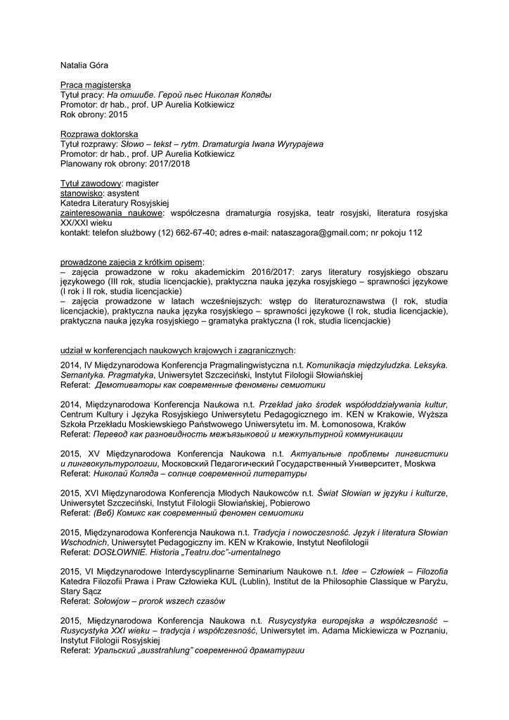 Natalia Góra Praca magisterska Tytuł pracy: На отшибе. Герой пьес Николая Коляды Promotor: dr hab., prof. UP Aurelia Kotkiewicz Rok obrony: 2015 Rozprawa doktorska Tytuł rozprawy: Słowo – tekst – rytm. Dramaturgia Iwana Wyrypajewa Promotor: dr hab., prof. UP Aurelia Kotkiewicz Planowany rok obrony: 2017/2018 Tytuł zawodowy: magister stanowisko: asystent Katedra Literatury Rosyjskiej zainteresowania naukowe: współczesna dramaturgia rosyjska, teatr rosyjski, literatura rosyjska XX/XXI wieku kontakt: telefon służbowy (12) 662-67-40; adres e-mail: [email protected]; nr pokoju 112 prowadzone zajęcia z krótkim opisem: – zajęcia prowadzone w roku akademickim 2016/2017: zarys literatury rosyjskiego obszaru językowego (III rok, studia licencjackie), praktyczna nauka języka rosyjskiego – sprawności językowe (I rok i II rok, studia licencjackie) – zajęcia prowadzone w latach wcześniejszych: wstęp do literaturoznawstwa (I rok, studia licencjackie), praktyczna nauka języka rosyjskiego – sprawności językowe (I rok, studia licencjackie), praktyczna nauka języka rosyjskiego – gramatyka praktyczna (I rok, studia licencjackie) udział w konferencjach naukowych krajowych i zagranicznych: 2014, IV Międzynarodowa Konferencja Pragmalingwistyczna n.t. Komunikacja międzyludzka. Leksyka. Semantyka. Pragmatyka, Uniwersytet Szczeciński, Instytut Filologii Słowiańskiej Referat: Демотиваторы как современные феномены семиотики 2014, Międzynarodowa Konferencja Naukowa n.t. Przekład jako środek współoddziaływania kultur, Centrum Kultury i Języka Rosyjskiego Uniwersytetu Pedagogicznego im. KEN w Krakowie, Wyższa Szkoła Przekładu Moskiewskiego Państwowego Uniwersytetu im. M. Łomonosowa, Kraków Referat: Перевод как разновидность межъязыковой и межкультурной коммуникации 2015, XV Międzynarodowa Konferencja Naukowa n.t. Актуальные проблемы лингвистики и лингвокультурологии, Московский Педагогический Государственный Университет, Moskwa Referat: Николай Коляда – солнце современной литературы 2015, XVI Międzynarodowa Konferencja Młodych Naukowców n.t. Świat Słowian w języku i kulturze, Uniwersytet Szczeciński, Instytut Filologii Słowiańskiej, Pobierowo Referat: (Веб) Комикс как современный феномен семиотики 2015, Międzynarodowa Konferencja Naukowa n.t. Tradycja i nowoczesność. Język i literatura Słowian Wschodnich, Uniwersytet Pedagogiczny im. KEN w Krakowie, Instytut Neofilologii Referat: DOSŁOWNIE. Historia „Teatru.doc”-umentalnego 2015, VI Międzynarodowe Interdyscyplinarne Seminarium Naukowe n.t. Idee – Człowiek – Filozofia Katedra Filozofii Prawa i Praw Człowieka KUL (Lublin), Institut de la Philosophie Classique w Paryżu, Stary Sącz Referat: Sołowjow – prorok wszech czasów 2015, Międzynarodowa Konferencja Naukowa n.t. Rusycystyka europejska a współczesność – Rusycystyka XXI wieku – tradycja i współczesność, Uniwersytet im. Adama Mickiewicza w Poznaniu, Instytut Filologii Rosyjskiej Referat: Уральский „ausstrahlung” современной драматургии 2016, V Międzynarodowa Konferencja Pragmalingwistyczna n.t. Komunikacja Międzyludzka. Leksyka. Semantyka. Pragmatyka, Uniwersytet Szczeciński, Zakład Języków i Kultur Słowiańskich Instytutu Filologii Słowiańskiej, Pobierowo Referat: Слово, язык, игра в художественном мире Николая Коляды 2016, Ogólnopolska Konferencja Naukowa n.t. Obraz religii we współczesnej literaturze i sztuce, Uniwersytet Pedagogiczny im. KEN w Krakowie, Uniwersytet Papieski im. Jana Pawła II, Kraków Referat: Reinterpretacja biblijnej aksjologii w „Tlenie” Iwana Wyrypajewa 2016, XVI Międzynarodowa Konferencja Naukowa n.t. Взаимодействие литератур в мировом литературном процессе. Проблемы теоретической и исторической поэтики, Uniwersytet im. Janki Kupały w Grodnie Referat: Герой „на отшибе” в драматургии Николая Коляды 2016, II Międzynarodowa Konferencja Naukowa n.t. W kręgu problemów antropologii literatury. Antropologia przyszłości. Literackie obrazy futurologiczne na przestrzeni dziejów, Uniwersytet w Białymstoku, Instytut Filologii Wschodniosłowiańskiej Referat: Очерк о пространстве в ранних драмах Ивана Вырыпаева 2016, I Międzynarodowa Konferencja Naukowa n.t. Русский язык в мировом контексте и международных организациях, Высшая школа перевода Московского государственного университета имени М.В. Ломоносова, Высшая школа устных и письменных переводчиков Университета Новая Сорбонна Париж, Международный университет Рима (UNINT), Rzym Referat: Русское веб-пространство как современный феномен семиотики 2016, Ogólnopolska Konferencja Naukowa n.t. Nawiedzone miejsca, Instytut Filologii Polskiej Wydziału Filologicznego Uniwersytetu Śląskiego, Ośrodek Badawczy Facta Ficta, Katowice Referat: Obojętnienie, czyli miasto gdzie dłużej nie można na podstawie dramatu Iwana Wyrypajewa „Miasto gdzie ja” 2016, Międzynarodowa Konferencja Naukowa n.t. Мировая литература в современном научном дискурсе, Katedra Historii Literatury Uniwersytetu Narodowego im. Wasyla Karazina w Charkowie Referat: „Театр дл