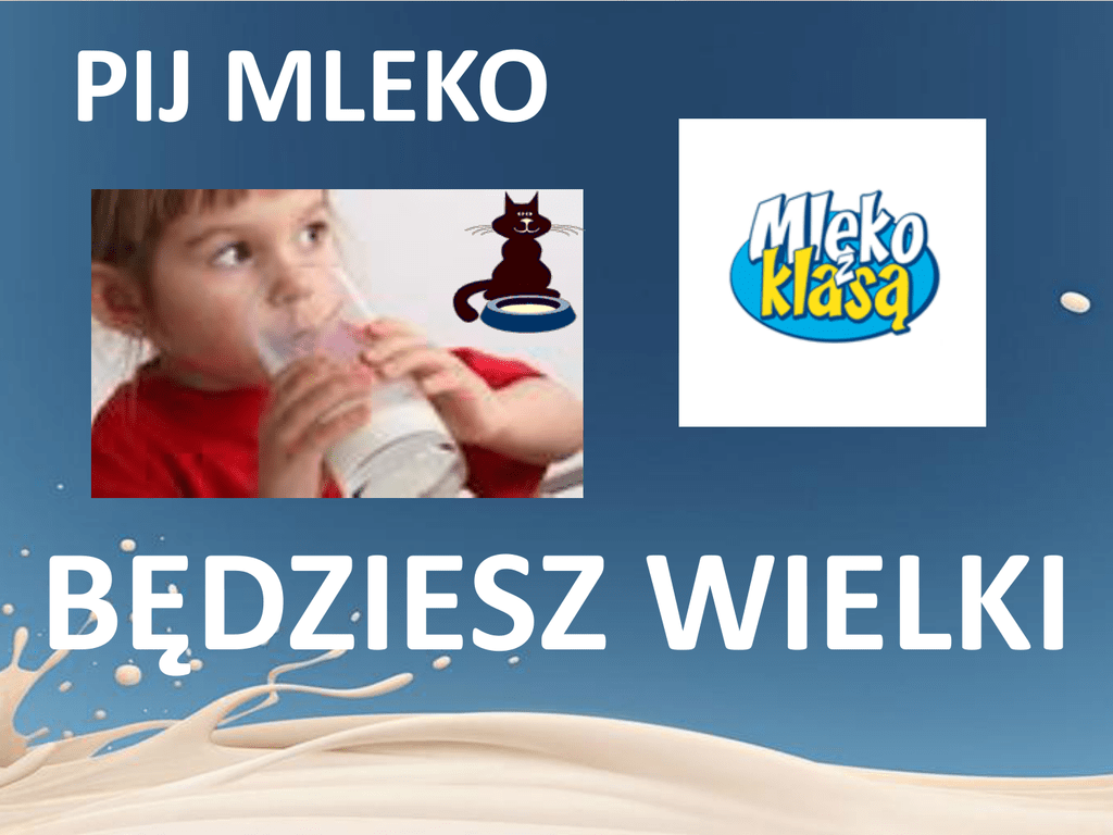PIJ MLEKO BĘDZIESZ WIELKI Na pewno często słyszycie, że trzeba pić mleko, bo jest zdrowe. I to prawda. Mleko zawiera wiele witamin niezbędnych do rozwoju kości, systemu nerwowego i wzroku. Od zarania dziejów mleko było jednym z najważniejszych składników jadłospisu ludzi. Zanim mleko trafi do kartoników jest pasteryzowane. Najpierw wydojone mleko wiezie się do mleczarni, gdzie się je filtruje i usuwa wszelkie nieczystości. Następnie - ponieważ mleko może się zepsuć, czyli "zsiąść" - jest konserwowane. Mleko, które rozlewane jest do kartoników jest pasteryzowane, czyli podgrzewane na kilka sekund do bardzo wysokiej temperatury. PROGRAM „SZKLANKA MLEKA” Celem programu „SZKLANKA MLEKA” jest kształtowanie wśród dzieci i młodzieży dobrych nawyków żywieniowych poprzez promowanie spożycia mleka i przetworów mlecznych PROGRAM „SZKLANKA MLEKA” FINANSOWANY JEST Z TRZECH ŻRÓDEŁ DOPŁATA UNIJNA OBEJMUJE DOSTARCZANIE MLEKA DO WSZYSTKICH RODZAJÓW UPRAWNIONYCH PLACÓWEK OŚWIATOWYCH DOPŁATA KRAJOWA OBEJMUJE DOSTARCZANIE MLEKA I JEGO PRZETWORÓW DO SZKÓŁ PODSTAWOWYCH DOFINANSOWANIE Z FUNDUSZU PROMOCJI MLEKA OBEJMUJE DOSTARCZANIE MLEKA I JEGO PRZETWORÓW DO PRZEDSZKOLI I GIMNAZJÓW Od roku szkolnego 2007/2008 Polska jest liderem wśród krajów UE w realizacji programu "Szklanka Mleka". Ilość mleka i przetworów mlecznych dostarczanych do placówek oświatowych i kwota środków finansowych pozyskiwanych z UE przez Polskę jest większa niż w krajach starej Unii, w których program jest realizowany od ponad 20 lat, takich jak Francja, Wielka Brytania, Niemcy, Szwecja i Finlandia. W ramach programu dzieci i uczniowie spożywają mleko białe i mleko smakowe o różnej zawartości tłuszczu, twarożki, sery i jogurty”. Od początku realizacji programu „Szklanka Mleka” dzieci uczęszczające do szkół i przedszkoli spożyły ponad 1 miliard szklanek mleka. PROGRAM „SZKLANKA MLEKA” W NASZEJ SZKOLE NASZA SZKOŁA UCZESTNICZY W PROGRAMIE OD 2008 r. PROGRAMEM SĄ OBJĘTE WSZYSTKIE DZIECI OD ODDZIAŁÓW PRZEDSZKOLNYCH DO KLAS VI. NASI UCZNIOWIE SPOŻYWAJĄ MLEKO BIAŁE 3 RAZY W TYGODNIU PO 0,25 ML 0D 1 PAŹDZIERNIKA DO 31 MAJA KAŻDEGO ROKU. ROK SZKOLNY LICZBA UCZNIÓW 2008/2009 311 2009/2010 306 2010/2011 235 2011/2012 360 2012/2013 353 Dlaczego nasi uczniowie piją mleko? Wypowiedzi uczniów: *,,Chcę mieć zdrowe zęby i kości” *,,Będę zdrowy jak rydz” *,,Będę się lepiej uczyć! ” WIĘC PAMIĘTAJ ! PIJ MLEKO – BĘDZIESZ WIELKI