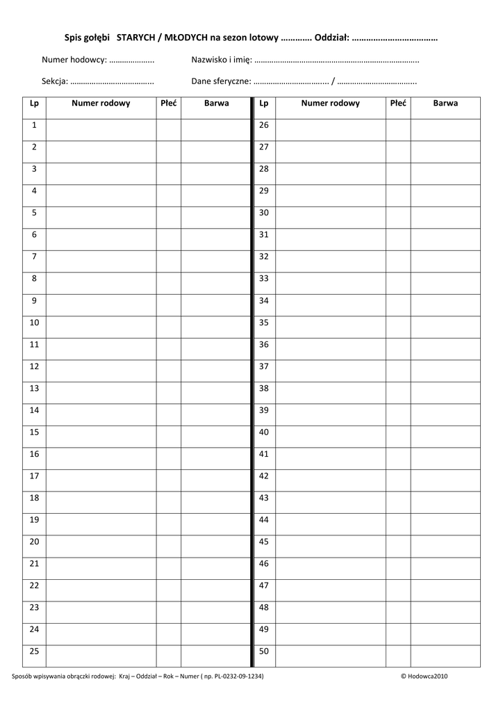 Spis gołębi STARYCH / MŁODYCH na sezon lotowy …………. Oddział: ……………………………… Lp Numer hodowcy: ………………... Nazwisko i imię: ………………………………………………………………….. Sekcja: ………………………………... Dane sferyczne: ……………………….….... / ………….…………………... Numer rodowy Płeć Barwa Lp 1 26 2 27 3 28 4 29 5 30 6 31 7 32 8 33 9 34 10 35 11 36 12 37 13 38 14 39 15 40 16 41 17 42 18 43 19 44 20 45 21 46 22 47 23 48 24 49 25 50 Sposób wpisywania obrączki rodowej: Kraj – Oddział – Rok – Numer ( np. PL-0232-09-1234) Numer rodowy Płeć Barwa © Hodowca2010 Lp Numer rodowy Płeć Barwa Lp 51 79 52 80 53 81 54 82 55 83 56 84 57 85 58 86 59 87 60 88 61 89 62 90 63 91 64 92 65 93 66 94 67 95 68 96 69 97 70 98 71 99 72 100 73 101 74 102 75 103 76 104 77 105 78 106 Sposób wpisywania obrączki rodowej: Kraj – Oddział – Rok – Numer ( np. PL-0232-09-1234) Numer rodowy Płeć Barwa © Hodowca2010 Lp Numer rodowy Płeć Barwa Lp 107 135 108 136 109 137 110 138 111 139 112 140 113 141 114 142 115 143 116 144 117 145 118 146 119 147 120 148 121 149 122 150 123 151 124 152 125 153 126 154 127 155 128 156 129 157 130 158 131 159 132 160 133 161 134 162 Sposób wpisywania obrączki rodowej: Kraj – Oddział – Rok – Numer ( np. PL-0232-09-1234) Numer rodowy Płeć Barwa © Hodowca2010