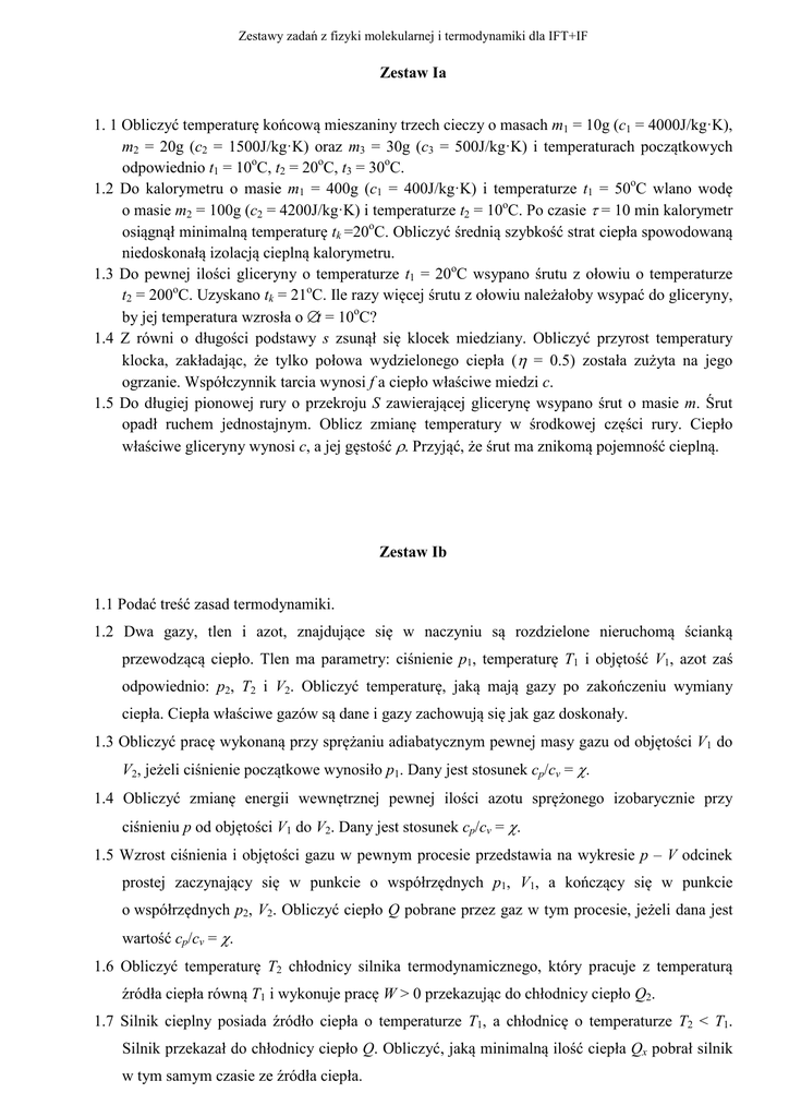 Zestawy zadań z fizyki molekularnej i termodynamiki dla IFT+IF Zestaw Ia 1. 1 Obliczyć temperaturę końcową mieszaniny trzech cieczy o masach m1 = 10g (c1 = 4000J/kg·K), m2 = 20g (c2 = 1500J/kg·K) oraz m3 = 30g (c3 = 500J/kg·K) i temperaturach początkowych odpowiednio t1 = 10oC, t2 = 20oC, t3 = 30oC. 1.2 Do kalorymetru o masie m1 = 400g (c1 = 400J/kg·K) i temperaturze t1 = 50oC wlano wodę o masie m2 = 100g (c2 = 4200J/kg·K) i temperaturze t2 = 10oC. Po czasie τ = 10 min kalorymetr osiągnął minimalną temperaturę tk =20oC. Obliczyć średnią szybkość strat ciepła spowodowaną niedoskonałą izolacją cieplną kalorymetru. 1.3 Do pewnej ilości gliceryny o temperaturze t1 = 20oC wsypano śrutu z ołowiu o temperaturze t2 = 200oC. Uzyskano tk = 21oC. Ile razy więcej śrutu z ołowiu należałoby wsypać do gliceryny, by jej temperatura wzrosła o ∆t = 10oC? 1.4 Z równi o długości podstawy s zsunął się klocek miedziany. Obliczyć przyrost temperatury klocka, zakładając, że tylko połowa wydzielonego ciepła (η = 0.5) została zużyta na jego ogrzanie. Współczynnik tarcia wynosi f a ciepło właściwe miedzi c. 1.5 Do długiej pionowej rury o przekroju S zawierającej glicerynę wsypano śrut o masie m. Śrut opadł ruchem jednostajnym. Oblicz zmianę temperatury w środkowej części rury. Ciepło właściwe gliceryny wynosi c, a jej gęstość ρ. Przyjąć, że śrut ma znikomą pojemność cieplną. Zestaw Ib 1.1 Podać treść zasad termodynamiki. 1.2 Dwa gazy, tlen i azot, znajdujące się w naczyniu są rozdzielone nieruchomą ścianką przewodzącą ciepło. Tlen ma parametry: ciśnienie p1, temperaturę T1 i objętość V1, azot zaś odpowiednio: p2, T2 i V2. Obliczyć temperaturę, jaką mają gazy po zakończeniu wymiany ciepła. Ciepła właściwe gazów są dane i gazy zachowują się jak gaz doskonały. 1.3 Obliczyć pracę wykonaną przy sprężaniu adiabatycznym pewnej masy gazu od objętości V1 do V2, jeżeli ciśnienie początkowe wynosiło p1. Dany jest stosunek cp/cv = χ. 1.4 Obliczyć zmianę energii wewnętrznej pewnej ilości azotu sprężonego izobarycznie przy ciśnieniu p od objętości V1 do V2. Dany jest stosunek cp/cv = χ. 1.5 Wzrost ciśnienia i objętości gazu w pewnym procesie przedstawia na wykresie p – V odcinek prostej zaczynający się w punkcie o współrzędnych p1, V1, a kończący się w punkcie o współrzędnych p2, V2. Obliczyć ciepło Q pobrane przez gaz w tym procesie, jeżeli dana jest wartość cp/cv = χ. 1.6 Obliczyć temperaturę T2 chłodnicy silnika termodynamicznego, który pracuje z temperaturą źródła ciepła równą T1 i wykonuje pracę W > 0 przekazując do chłodnicy ciepło Q2. 1.7 Silnik cieplny posiada źródło ciepła o temperaturze T1, a chłodnicę o temperaturze T2 < T1. Silnik przekazał do chłodnicy ciepło Q. Obliczyć, jaką minimalną ilość ciepła Qx pobrał silnik w tym samym czasie ze źródła ciepła. Zestaw Ic 1.1 W naczyniu o pojemności V=1 litr znajduje się m=0.2g wodoru. Obliczyć ciśnienie wodoru, jeżeli średnia energia cząsteczek wodoru wynosi Eśr = 4 ⋅ 10−21 J . 1.2 W naczyniu o pojemności V=4 dm3 znajduje się m=14g azotu pod ciśnieniem p = 105Pa. Obliczyć: a) temperaturę gazu; b) średnią prędkość v cząsteczek azotu. 1.3 Obliczyć ciśnienie p1 w oponie rowerowej o objętości V1, jeżeli do jej napompowania należy n razy wprowadzić powietrze z pompki o objętości V2; ciśnienie atmosferyczne wynosi p, a opona ostygła po napompowaniu. 1.4 Obliczyć ciśnienie p wywierane przez N=109 cząsteczek gazu o objętości V=1 mm3 i temperaturze T = 5000K. 1.5 W dwóch naczyniach o pojemnościach V1 i V2 znajdują się dwa różne gazy o masach m1 i m2 i masach cząsteczkowych µ1 i µ2. Obliczyć ciśnienie mieszaniny gazów powstałej po połączeniu obu naczyń przewodem, którego objętość można pominąć. Temperatura obu gazów jest stała i wynosi T. 1.6 Obliczyć stosunek χ ciepła właściwego przy stałym ciśnieniu do ciepła właściwego w stałej objętości pewnego gazu, którego ciśnienie w wyniku przemiany adiabatycznej zmalało n razy, a temperatura αn razy. 1.7 Probówka w kształcie walca o długości l i przekroju S została odwrócona otwartym końcem do dołu i wskutek obciążenia zasklepionego końca masą m zanurzona do wody na głębokość x+a. Obliczyć wysokość x słupka wody w probówce. Masę probówki zaniedbać. 1.8 Naczynie jest zamknięte ruchomym tłokiem o całkowitej masie M. Pole przekroju poprzecznego naczynia wynosi S. Pod tłokiem znajduje się masa m tlenu. Obliczyć, jaki powinien być przyrost temperatury ∆T gazu, aby tłok podniósł się na wysokość h, jeżeli ciśnienie atmosferyczne wynosi p.