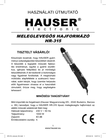 HASZNÁLATI ÚTMUTATÓ HAUSER ® e l e c t r o n i c MELEGLEVEGŐS HAJFORMÁZÓ HR-315 TISZTELT VÁSÁRLÓ! Köszönjük bizalmát, hogy HAUSER gyártmányú szépségápolási készüléket vásárolt. A készülék a legújabb műszaki fejlesztés eredménye, egyike a gyártó esztétikus, igényes felépítésű és jó minőségű készülékeinek.A tervezésnél a biztonságra nagy figyelmet fordítottak. A megbízható működés alapfeltétele a szakszerű használat, ezért kérjük, hogy üzembe helyezés előtt figyelmesen olvassa el a használati útmutatót, őrizze meg, hogy segítségére lehessen! MINŐSÉGI TANÚSÍTVÁNY Mint importáló és forgalmazó (Hauser Magyarország Kft., 2040 Budaörs, Baross u. 89.) tanúsítjuk, hogy a HAUSER HR-315 típusú meleglevegős hajformázó az alábbi műszaki adatoknak felel meg: Hálózati teljesítmény: 230 V ~ 50 Hz Teljesítmény: 1000 W Zajszint: 83 dB Érintésvédelmi osztály: II. 1 www.hauser.eu HR-315_manual_HU.indd 1 2013.04.12. 14:07:14 BIZTONSÁGI TUDNIVALÓK Általános figyelmeztetések A készülék használata előtt kérjük, figyelmesen olvassa el annak tájékoztatóját! A készülék nem rendeltetésszerű használata balesetveszélyes, ezért az alapvető biztonsági előírásokat a saját érdekében mindig tartsa be! A készülék csak háztartási használatra alkalmas! TILOS a készüléket a szabadban működtetni! Miután eltávolította a csomagolást, győződjön meg róla, hogy a készülék nem sérült! Amennyiben a készüléken sérülést lát, ne kezdje meg a készülék használatát, minél hamarabb vigye szakszervizbe! A csomagolóanyagok kisgyermekekre veszélyesek lehetnek, ezért tartsa megfelelő távolságra tőlük. Elektromos áramütés veszélyének elkerülése érdekében TILOS a készüléket fürdőkád, mosdó vagy mosogató közvetlen közelében használni, valamint – a készüléket vízbe vagy más folyadékba mártani, – sérült vezetékkel illetve – bárminemű mechanikai sérülés esetén használni! Használat előtt ellenőrizze, hogy a hálózati feszültség megegyezik-e a készülék címkéjén jelzettel, s hogy otthoni fali csatlakozója megfelelően földelt-e! A készülék csak felügyelet mellett használható! Ezt a készüléket csak akkor használhatják 8 éves korú vagy e feletti gyerekek, továbbá azon személyek, akik csökkent fizikai, érzékelési vagy szellemi képességekkel bírnak ideértve azon személyeket is akik nem rendelkeznek kellő tapasztalattal és tudással a készülék üzemeltetésére vonatkozóan, ha felügyelik őket vagy utasításokat kaptak a készülék biztonságos üzemeltetéséről és megértik a készülék üzemeltetésével kapcsolatos veszélyeket. Gyerekek nem játszhatnak a készülékkel. Gyermekek felügyelet nélkül nem végezhetnek tisztítást és karbantartást a készüléken! Használaton kívül és tisztítás előtt húzza ki a csatlakozót az elektromos hálózatból! Soha ne hagyja felügyelet nélkül a készüléket, ha áram alatt van! Használaton kívül mindig kapcsolja ki és áramtalanítsa a készüléket! A rövid vezeték megakadályozza a személyi sérüléseket, mint például a vezetékbe való belegabalyodást, illetve keresztül esést. Készülékéhez bármely szakkereskedésben kapható megfelelő hosszabbító használható. 2 www.hauser.eu HR-315_manual_HU.indd 2 2013.04.12. 14:07:49 Fontos információk a hosszabbító vezetékéről: - elektromos besorolás alá kell tartoznia, vagy AC230V jelölést kell tartalmaznia; - három eres földeltnek kell lennie; - el kell rendezni annak megfelelően, hogy ne fusson keresztül szőnyegen vagy asztalon, ahonnan a gyermekek könnyen magukra ránthatják, vagy véletlenül eleshetnek benne. Kérjük, vegye figyelembe, hogy a hosszabbítóhoz való csatlakozással a készülék automatikusan bekapcsolhat és működésbe léphet. A készülékhez csak a gyártó által mellékelt kiegészítők és a gyártó által biztosított alkatrészek használhatóak. Ha véletlenül leejtette a készüléket, következő használat előtt mindenképpen nézesse meg szakszervizben szakemberrel. Az elektromos csatlakozóvezetéket ne akassza tűzhely, munkalap fölé! A készülék vagy annak vezetéke ne érintkezzen forró felülettel, valamint ne helyezze gáz vagy elektromos sütő, tűzhely közelébe! Ne tegye a készüléket közvetlen napfényre vagy hőforrások közelébe! A készüléket ne rakja asztal vagy pult szélére, mert kisgyermek által így könnyen elérhető és leverhető. Figyeljen arra is, hogy a lelógó vezeték asztal vagy pult szélén balesetveszélyes! Biztonságos áramtalanításkor támassza meg a fali csatlakozó aljzatot egyik kezével, majd a csatlakozó dugónál fogva húzza ki a vezetéket! FONTOS: A gyártó, illetve forgalmazó nem vállal felelősséget a nem rendeltetésszerű használatból eredő károkért, illetve az illetéktelen személy általi javításért! A meghibásodott készüléket csak szakember javíthatja! A készülék belső sérülése áramütést okozhat! Ha a hálózati csatlakozóvezeték megsérül, akkor a veszélyek kiküszöbölése céljából a cserét csak a gyártóval, szervizével vagy más, hasonlóan szakképzett személlyel szabad elvégeztetni. A csatlakozózsinór sérülése áramütést okozhat! Ha a készülék működésében hibát észlelne, forduljon a szakszervizhez segítségért! Soha ne próbálja meg otthon megjavítani a készüléket, mert ez a jótállás érvényességének elvesztését jelenti. Soha ne szerelje szét a készüléket! Ez kiszámíthatatlan következményekkel járhat! Soha ne tekerje fel a hálózati vezetéket a készülékre, mert az a kábel sérüléséhez vezet. 3 www.hauser.eu HR-315_manual_HU.indd 3 2013.04.12. 14:07:49 Nedves kézzel soha ne próbálja a készüléket feszültségmentesíteni, a dugaljból a 