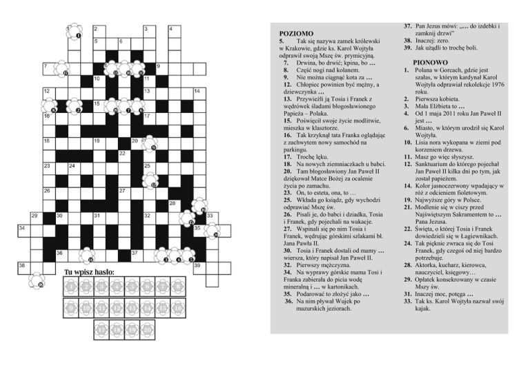 POZIOMO 5. Tak się nazywa zamek królewski w Krakowie, gdzie ks. Karol Wojtyła odprawił swoją Mszę św. prymicyjną. 7. Drwina, bo drwić; kpina, bo … 8. Część nogi nad kolanem. 9. Nie można ciągnąć kota za … 12. Chłopiec powinien być mężny, a dziewczynka … 13. Przywieźli ją Tosia i Franek z wędrówek śladami błogosławionego Papieża – Polaka. 15. Poświęcił swoje życie modlitwie, mieszka w klasztorze. 16. Tak krzyknął tata Franka oglądając z zachwytem nowy samochód na parkingu. 17. Trochę lęku. 18. Na nowych ziemniaczkach u babci. 20. Tam błogosławiony Jan Paweł II dziękował Matce Bożej za ocalenie życia po zamachu. 23. On, to esteta, ona, to … 25. Wkłada go ksiądz, gdy wychodzi odprawiać Mszę św. 26. Pisali je, do babci i dziadka, Tosia i Franek, gdy pojechali na wakacje. 27. Wspinali się po nim Tosia i Franek, wędrując górskimi szlakami bł. Jana Pawła II. 30. Tosia i Franek dostali od mamy … wiersza, który napisał Jan Paweł II. 32. Pierwszy mężczyzna. 34. Na wyprawy górskie mama Tosi i Franka zabierała do picia wodę mineralną i … w kartonikach. 35. Podarować to złożyć jako … 36. Na nim pływał Wujek po mazurskich jeziorach. 37. Pan Jezus mówi: „… do izdebki i zamknij drzwi” 38. Inaczej: zero. 39. Jak użądli to trochę boli. PIONOWO 1. Polana w Gorcach, gdzie jest szałas, w którym kardynał Karol Wojtyła odprawiał rekolekcje 1976 roku. 2. Pierwsza kobieta. 3. Mała Elżbieta to … 4. Od 1 maja 2011 roku Jan Paweł II jest … 6. Miasto, w którym urodził się Karol Wojtyła. 10. Lisia nora wykopana w ziemi pod korzeniem drzewa. 11. Masz go więc słyszysz. 12. Sanktuarium do którego pojechał Jan Paweł II kilka dni po tym, jak został papieżem. 14. Kolor jasnoczerwony wpadający w róż z odcieniem fioletowym. 19. Najwyższe góry w Polsce. 21. Modlenie się w ciszy przed Najświętszym Sakramentem to … Pana Jezusa. 22. Święta, o której Tosia i Franek dowiedzieli się w Łagiewnikach. 24. Tak pięknie zwraca się do Tosi Franek, gdy czegoś od niej bardzo potrzebuje. 28. Aktorka, kucharz, kierowca, nauczyciel, księgowy… 29. Opłatek konsekrowany w czasie Mszy św. 31. Inaczej moc, potęga … 33. Tak ks. Karol Wojtyła nazwał swój kajak.