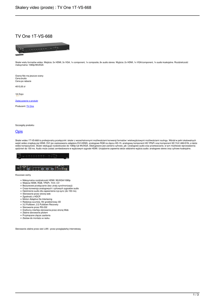 Skalery video (proste) : TV One 1T-VS-668 TV One 1T-VS-668 Skaler wielu formatów wideo. Wejścia: 3x HDMI, 3x VGA, 1x component, 1x composite, 8x audio stereo. Wyjścia: 2x HDMI, 1x VGA/component, 1x audio koaksjalne. Rozdzielczość maksymalna: 1080p/WUXGA Ocena Nie ma jeszcze oceny Cena brutto Cena po rabacie 4013,00 zł Zadaj pytanie o produkt Producent: TV One Szczegóły produktu Opis Skaler wideo 1T-VS-668 to profesjonalny przełącznik i skaler z wszechstronnymi możliwościami konwersji formatów i wielowyjściowymi możliwościami routingu. Wśród w pełni skalowalnych wejść wideo znajdują się HDMI, DVI (po zastosowaniu adaptera DVI-HDMI), analogowe RGB na złączu HD-15, analogowy komponent HD YPbPr oraz komponent SD YUV 480i/576i, a także wideo kompozytowe. Skaler obsługuje rozdzielczości do 1080p lub WUXGA. Obsługiwane jest zarówno cyfrowe, jak i analogowe audio oraz przetwarzanie, w tym możliwość wprowadzenia opóźnień do 150 ms. Audio może zostać zembedowane w wyjściowym sygnale HDMI. Urządzenie zapewnia także oddzielne wyjścia audio: analogowe stereo oraz cyfrowe koaksjalne. Kluczowe cechy Maksymalna rozdzielczość HDMI: WUXGA/1080p Wejścia HDMI, RGB, YPbPr, YUV, CV Bezszwowe przełączanie (bez utraty synchronizacji) Cross-konwersja analogowych i cyfrowych sygnałów audio Opóźnienie audio dla zapewnienia Lip-sync (do 150 ms). Sterowanie przez stronę web Zgodność z HDCP Motion Adaptive De-Interlacing Redukcja szumów, filtr grzebieniowy 3D 3:2 Pulldown, 2:2 Pulldown Recovery Sterowanie przez RS-232 Graficzny interfejs sterowania przez stronę Web Zdalne sterowanie pilotem Przykręcane złącze zasilania Zestaw do montażu w racku Sterowanie zdalne przez sieć LAN - przez przeglądarkę internetową: 1/3 Skalery video (proste) : TV One 1T-VS-668 Specyfikacja techniczna Wejścia wideo HDMI: 3x na złączu HDMI RGBHV: 3x na złączu HD-15 YPbPr/YUV: 1x na złączach RCA Composite: 1x PAL/NTSC na złączu RCA Wejścia audio Audio analogowe: 2x na złączach RCA, 6x na złączach 3,5 mm Wyjścia wideo HDMI: 2x na złączach HDMI RGBHV/YPBPr: 1x na złączu HD-15 Wyjścia audio Zembedowane HDMI: 2x na złączach HDMI Analogowe stereo: 1x na złączu 3,5 mm Cyfrowe audio (S/PDIF): 1x na złączu RCA Opóźnienie audio: wyłączone/40 ms/110 ms/150 ms Temperatura pracy: 0 - 40°C Temperatura przechowywania: -20 - +60°C Wilgotność: 20 – 90% bez kondensacji Gwarancja: 3 lata Wymiary: 47 x 432 x 183 mm Masa: 2,14 kg Zasilanie: zewnętrzny zasilacz 5 V DC 3A Dołączone akcesoria: Zasilacz, instrukcja, uszy rackowe, adapter HD15 na YUV, pilot, przedłużacz IR Przełączanie między kanałami wejściowymi (tylko przez czerń) trwa ok. 2-3 sekundy. Dostępne rozdzielczości wyjściowe: 640x480 60 800x600 60 1024x768 60 1280x768 60 1360x768 60 1280X720 60 1280x800 60 1280x1024 60 1440x900 60 1400x1050 60 1680x1050 60 1600x1200 60 1920X1080 60 2/3 Skalery video (proste) : TV One 1T-VS-668 1920x1200 60 720x480P 60 1280x720P 60 1920x1080I 60 1920x1080P 60 720x576P 50 1280x720P 50 1920x1080I 50 1920x1080P 50 Link do pełnej specyfikacji technicznej urządzenia Pliki do pobrania Karta katalogowa Instrukcja obsługi (wersja ang.) English 1T-VS-668 Video Scaler is a commercial switcher/scaler with versatile format conversion and multi-output routing capability. Fully scalable video inputs include HDMI, DVI (via DVI-to-HDMI adapter), analog RGB via HD-15 connectors, analog YPbPr or 480i/576i YUV Component via three RCA connectors and Composite Video. It handles I/O Resolutions up to 1080p and WUXGA. Both digital and analog audio processing are supported and audio delays of up to 150ms can be introduced to ensure lip sync. Eight analog stereo and inputs can be selected for embedding into the HDMI outputs. Separate coaxial digital and stereo audio outputs are also provided. Key Features of the 1T-VS-668 HDMI Max Res: WUXGA & 1080p HDMI, RGB, YPbPr, YUV, CV In Seamless switching (no sync loss) Cross Conversion of Analog & Digital Audio Audio Delay for Lip Sync Correction HDCP Compliant 3D Motion Adaptive De-Interlacing Noise Reduction, 3D Comb Filter 3:2 Pull-Down, 2:2 Pull-Down Recovery Web GUI Control Interface Infrared Remote Control Locking DC Power Supply Rack Mount Kit 3/3 Powered by TCPDF (www.tcpdf.org)
