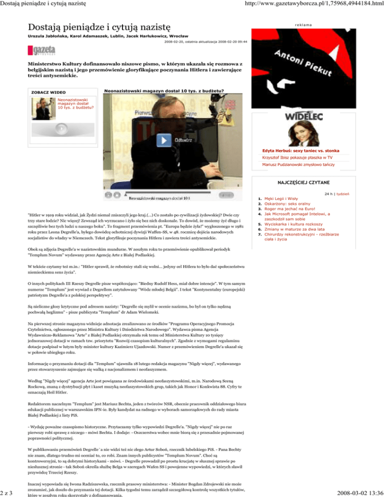 Dostaj pieni dze i cytuj nazist http://www.gazetawyborcza.pl/1,75968,4944184.html Dostaj( pieni(dze i cytuj( nazist% reklama Urszula Jab o ska, Karol Adamaszek, Lublin, Jacek Har ukowicz, Wroc aw 2008-02-20, ostatnia aktualizacja 2008-02-20 09:44 Ministerstwo Kultury dofinansowa o niszowe pismo, w którym ukaza a si rozmowa z belgijskim nazist i jego przemówienie gloryfikuj ce poczynania Hitlera i zawieraj ce tre ci antysemickie. ZOBACZ WIDEO Neonazistowski magazyn dosta 10 tys. z bud*etu? Neonazistowski magazyn dosta 10 tys. z bud!etu? Edyta Herbu : sexy taniec vs. stonka Krzysztof Ibisz pokazuje ptaszka w TV Mariusz Pudzianowski zmys owo ta czy NAJCZ CIEJ CZYTANE 24 h | tydzie% 1. M'ki Legii i Wis y 2. Oskar!ony: seks oralny 3. Roger ma jecha- na Euro! "Hitler w 1919 roku widzia , jak ydzi niemal zniszczyli jego kraj.(...) Co zosta o po cywilizacji !ydowskiej? Dwie czy trzy stare odzie? Nic wi%cej! Zewsz(d ich wyrzucano i !y o si% bez nich doskonale. To dowód, !e mo!emy !y- d ugo i szcz%.liwie bez tych ludzi u naszego boku". To fragment przemówienia pt. "Europa b%dzie !y a!" wyg oszonego w 1981 roku przez Leona Degrelle'a, by ego dowódc% ochotniczej dywizji Waffen-SS, w 48. rocznic% doj.cia narodowych socjalistów do w adzy w Niemczech. Tekst gloryfikuje poczynania Hitlera i zawiera tre.ci antysemickie. 4. Jak Microsoft pomaga Intelowi, a zaszkodzi sam sobie 5. Wyciskarka i kultura rozkoszy 6. Zmiany w maturze za dwa lata 7. Chirurdzy rekonstrukcyjni - rze6biarze cia a i !ycia Obok s( zdj%cia Degrelle'a w nazistowskim mundurze. W zesz ym roku to przemówienie opublikowa periodyk "Templum Novum" wydawany przez Agencj% Arte z Bia ej Podlaskiej. W tek.cie czytamy te! m.in.: "Hitler sprawi , !e robotnicy stali si% wolni... jedyny cel Hitlera to by o da- spo ecze>stwu niemieckiemu sens !ycia". O innych politykach III Rzeszy Degrelle pisze wspó czuj(co: "Biedny Rudolf Hess, mia dobre intencje". W tym samym numerze "Templum" jest wywiad z Degrellem zatytu owany "Wódz m odej Belgii". I tekst "Kontynentalny (europejski) patriotyzm Degrelle'a z polskiej perspektywy". S( nieliczne g osy krytyczne pod adresem nazisty: "Degrelle si% myli w ocenie nazizmu, bo by on tylko n%dzn( pochwa ( heglizmu" - pisze publicysta "Templum" dr Adam Wielomski. Na pierwszej stronie magazynu widnieje adnotacja zrealizowano ze .rodków "Programu Operacyjnego Promocja Czytelnictwa, og oszonego przez Ministra Kultury i Dziedzictwa Narodowego". Wydawca pisma Agencja Wydawniczo-Reklamowa "Arte" z Bia ej Podlaskiej otrzyma a rok temu od Ministerstwa Kultury 10 tysi%cy jednorazowej dotacji w ramach tzw. priorytetu "Rozwój czasopism kulturalnych". Zgodnie z wymogami regulaminu dotacje podpisa w lutym by y minister kultury Kazimierz Ujazdowski. Numer z przemówieniem Degrelle'a ukaza si% w po owie ubieg ego roku. Informacj% o przyznaniu dotacji dla "Templum" ujawni a 18 lutego redakcja magazynu "Nigdy wi%cej", wydawanego przez stowarzyszenie zajmuj(ce si% walk( z nacjonalizmem i neofaszyzmem. Wed ug "Nigdy wi%cej" agencja Arte jest powi(zana ze .rodowiskami neofaszystowskimi, m.in. Narodow( Scen( Rockow(, znan( z dystrybucji p yt i kaset muzyk( neofaszystowskich grup, takich jak Honor i Konkwista 88. Cyfry te oznaczaj( Heil Hitler. Redaktorem naczelnym "Templum" jest Mariusz Bechta, jeden z twórców NSR, obecnie pracownik oddzia owego biura edukacji publicznej w warszawskim IPN-ie. By y kandydat na radnego w wyborach samorz(dowych do rady miasta Bia ej Podlaskiej z listy PiS. - Wydaj% powa!ne czasopismo historyczne. Przytaczamy tylko wypowiedzi Degrelle'a. "Nigdy wi%cej" nie po raz pierwszy robi spraw% z niczego - mówi Bechta. I dodaje: - Oszczerstwa wobec mnie bior( si% z przesadnie pojmowanej poprawno.ci politycznej. W publikowaniu przemówie> Degrelle`a nie widzi te! nic z ego Artur Sobo>, rzecznik lubelskiego PiS. - Pana Bechty nie znam, dlatego trudno mi ocenia- to, co robi. Znam innych publicystów "Templum Novum". Cho- s( kontrowersyjni, to s( dobrymi historykami - mówi. - Degrelle prowadzi po prostu krucjat% w s usznej sprawie po nies usznej stronie - tak Sobo> okre.la s u!b% Belga w szeregach Wafen SS i powojenne wypowiedzi, w których s awi przywódc% Trzeciej Rzeszy. 2z3 Inaczej wypowiada si% Iwona Radziszewska, rzecznik prasowy ministerstwa: - Minister Bogdan Zdrojewski nie mo!e zrozumie-, jak dosz o do przyznania tej dotacji. Kilka tygodni temu zarz(dzi szczegó ow( kontrol% wszystkich tytu ów, 2008-03-02 13:36