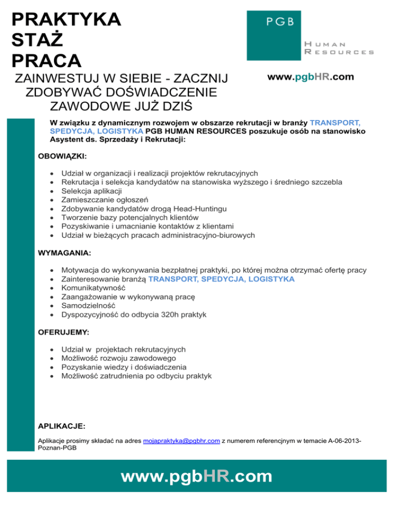 PRAKTYKA STAŻ PRACA ZAINWESTUJ W SIEBIE - ZACZNIJ ZDOBYWAĆ DOŚWIADCZENIE ZAWODOWE JUŻ DZIŚ www.pgbHR.com W związku z dynamicznym rozwojem w obszarze rekrutacji w branży TRANSPORT, SPEDYCJA, LOGISTYKA PGB HUMAN RESOURCES poszukuje osób na stanowisko Asystent ds. Sprzedaży i Rekrutacji: OBOWIĄZKI: Udział w organizacji i realizacji projektów rekrutacyjnych Rekrutacja i selekcja kandydatów na stanowiska wyższego i średniego szczebla Selekcja aplikacji Zamieszczanie ogłoszeń Zdobywanie kandydatów drogą Head-Huntingu Tworzenie bazy potencjalnych klientów Pozyskiwanie i umacnianie kontaktów z klientami Udział w bieżących pracach administracyjno-biurowych WYMAGANIA: Motywacja do wykonywania bezpłatnej praktyki, po której można otrzymać ofertę pracy Zainteresowanie branżą TRANSPORT, SPEDYCJA, LOGISTYKA Komunikatywność Zaangażowanie w wykonywaną pracę Samodzielność Dyspozycyjność do odbycia 320h praktyk OFERUJEMY: Udział w projektach rekrutacyjnych Możliwość rozwoju zawodowego Pozyskanie wiedzy i doświadczenia Możliwość zatrudnienia po odbyciu praktyk APLIKACJE: Aplikacje prosimy składać na adres [email protected] z numerem referencjnym w temacie A-06-2013Poznan-PGB www.pgbHR.com
