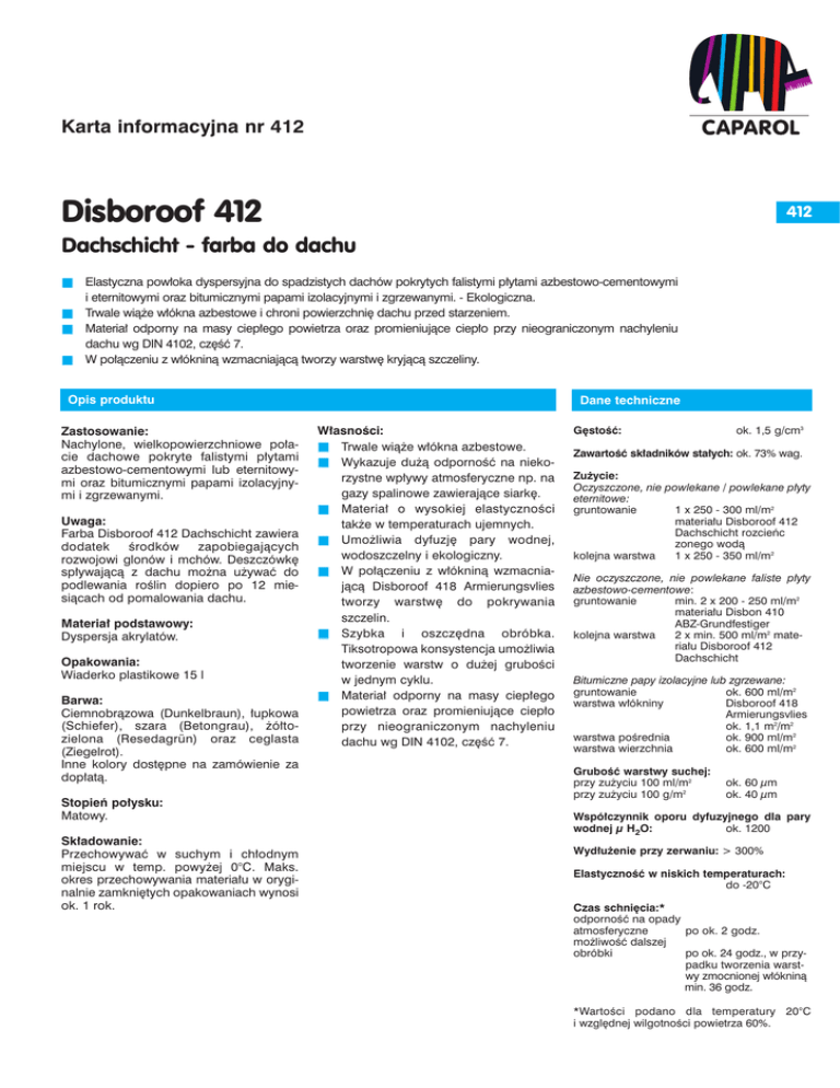 Karta informacyjna nr 412 Disboroof 412 412 Dachschicht - farba do dachu ■ ■ ■ ■ Elastyczna pow³oka dyspersyjna do spadzistych dachów pokrytych falistymi p³ytami azbestowo-cementowymi i eternitowymi oraz bitumicznymi papami izolacyjnymi i zgrzewanymi. - Ekologiczna. Trwale wi¹¿e w³ókna azbestowe i chroni powierzchniê dachu przed starzeniem. Materia³ odporny na masy ciep³ego powietrza oraz promieniuj¹ce ciep³o przy nieograniczonym nachyleniu dachu wg DIN 4102, czêœæ 7. W po³¹czeniu z w³óknin¹ wzmacniaj¹c¹ tworzy warstwê kryj¹c¹ szczeliny. Opis produktu Zastosowanie: Nachylone, wielkopowierzchniowe po³acie dachowe pokryte falistymi p³ytami azbestowo-cementowymi lub eternitowymi oraz bitumicznymi papami izolacyjnymi i zgrzewanymi. Uwaga: Farba Disboroof 412 Dachschicht zawiera dodatek œrodków zapobiegaj¹cych rozwojowi glonów i mchów. Deszczówkê sp³ywaj¹c¹ z dachu mo¿na u¿ywaæ do podlewania roœlin dopiero po 12 miesi¹cach od pomalowania dachu. Materia³ podstawowy: Dyspersja akrylatów. Opakowania: Wiaderko plastikowe 15 l Barwa: Ciemnobr¹zowa (Dunkelbraun), ³upkowa (Schiefer), szara (Betongrau), ¿ó³tozielona (Resedagrün) oraz ceglasta (Ziegelrot). Inne kolory dostêpne na zamówienie za dop³at¹. Stopieñ po³ysku: Matowy. Sk³adowanie: Przechowywaæ w suchym i ch³odnym miejscu w temp. powy¿ej 0°C. Maks. okres przechowywania materia³u w oryginalnie zamkniêtych opakowaniach wynosi ok. 1 rok. Dane techniczne W³asnoœci: ■ Trwale wi¹¿e w³ókna azbestowe. ■ Wykazuje du¿¹ odpornoœæ na niekorzystne wp³ywy atmosferyczne np. na gazy spalinowe zawieraj¹ce siarkê. ■ Materia³ o wysokiej elastycznoœci tak¿e w temperaturach ujemnych. ■ Umo¿liwia dyfuzjê pary wodnej, wodoszczelny i ekologiczny. ■ W po³¹czeniu z w³óknin¹ wzmacniaj¹c¹ Disboroof 418 Armierungsvlies tworzy warstwê do pokrywania szczelin. ■ Szybka i oszczêdna obróbka. Tiksotropowa konsystencja umo¿liwia tworzenie warstw o du¿ej gruboœci w jednym cyklu. ■ Materia³ odporny na masy ciep³ego powietrza oraz promieniuj¹ce ciep³o przy nieograniczonym nachyleniu dachu wg DIN 4102, czêœæ 7. Gêstoœæ: ok. 1,5 g/cm3 Zawartoœæ sk³adników sta³ych: ok. 73% wag. Zu¿ycie: Oczyszczone, nie powlekane / powlekane p³yty eternitowe: gruntowanie 1 x 250 - 300 ml/m2 materia³u Disboroof 412 Dachschicht rozcieñc zonego wod¹ kolejna warstwa 1 x 250 - 350 ml/m2 Nie oczyszczone, nie powlekane faliste p³yty azbestowo-cementowe: gruntowanie min. 2 x 200 - 250 ml/m2 materia³u Disbon 410 ABZ-Grundfestiger kolejna warstwa 2 x min. 500 ml/m2 materia³u Disboroof 412 Dachschicht Bitumiczne papy izolacyjne lub zgrzewane: gruntowanie ok. 600 ml/m2 warstwa w³ókniny Disboroof 418 Armierungsvlies ok. 1,1 m2/m2 warstwa poœrednia ok. 900 ml/m2 warstwa wierzchnia ok. 600 ml/m2 Gruboœæ warstwy suchej: przy zu¿yciu 100 ml/m2 przy zu¿yciu 100 g/m2 ok. 60 µm ok. 40 µm Wspó³czynnik oporu dyfuzyjnego dla pary wodnej µ H2O: ok. 1200 Wyd³u¿enie przy zerwaniu: > 300% Elastycznoœæ w niskich temperaturach: do -20°C Czas schniêcia:* odpornoœæ na opady atmosferyczne po ok. 2 godz. mo¿liwoœæ dalszej obróbki po ok. 24 godz., w przypadku tworzenia warstwy zmocnionej w³óknin¹ min. 36 godz. *Wartoœci podano dla temperatury 20°C i wzglêdnej wilgotnoœci powietrza 60%. Wykonawstwo Zabezpieczenia podczas wykonywania prac na dachu: Przestrzegaæ odpowiednich przepisów BHP. U¿ywaæ wy³¹cznie atestowanych lin, pasów, rusztowañ i innych elementów wspomagaj¹cych. Odpowiednie pod³o¿a: Faliste p³yty azbestowo-cementowe i eternitowe oraz bitumiczne papy izolacyjne i zgrzewane przynajmniej po roku u¿ytkowania. Pod³o¿e musi byæ zwarte, czyste, noœne, pozbawione substancji zmniejszaj¹cych przyczepnoœæ i suche lub matowo-wilgotne w przypadku p³yt nie powlekanych. Przygotowanie pod³o¿a: 1 Nie oczyszczone i nie powlekane faliste p³yty azbestowo-cementowe. Wczeœniejsze oczyszczenie pod³o¿a nie jest konieczne w przypadku wykonywania warstwy gruntuj¹cej materia³em Disbon 410 ABZ-Grundfestiger. Przed na³o¿eniem pierwszej warstwy wystarczy usun¹æ ewentualny mech porastaj¹cy dach (p³aty mchu) oraz luŸne cz¹stki. 2. P³yty eternitowe. Strumieniem wody pod ciœnieniem kierowanym zgodnie ze spadkiem dachu oczyœciæ mech, glony, luŸne cz¹stki zwietrza³ego materia³u i inne zanieczyszczenia. Oczyszczon¹ i such¹ powierzchniê mo¿na w razie koniecznoœci pomalowaæ glono- i grzybobójczym preparatem Capatox. Pozostawiæ do wyschniêcia. 3. Bitumiczne papy izolacyjne i zgrzewane. Strumieniem wody pod ciœnieniem kierowanym zgodnie ze spadkiem dachu oczyœciæ mech, glony, luŸne cz¹stki zwietrza³ego materia³u i inne zanieczyszczenia. Ewentualne pêcherze naci¹æ na krzy¿, wysuszyæ i ca³kowicie pokryæ materia³em Disboroof 412 Dachschicht. Nale¿y siê upewniæ, ¿e pomiêdzy warstwê uszczelniaj¹c¹, materia³ pokrywaj¹cy dach oraz konstrukcjê dachu (pokrycie dachu, docieplenie itp.) nie wniknê³a wilgoæ. Spoiny i szczeliny dylatacyjne wykszta³ciæ zgodnie z kart¹ informacyjn¹ nr 417. Przygotowanie materia³u: Farba Disboroof 412 Dachschicht jest gotowa do obróbki. Przed przyst¹pieniem do prac dok³adnie zamieszaæ. W przypadku gruntowania nie powlekanych / powlekanych p³yt azbestowo-cementowych lub eternitowych materia³ mo¿na rozcieñczyæ maks. 15% wody w zale¿noœci od ch³onnoœci pod³o¿a. Materia³ przeznaczony do natryskiwania rozcieñczyæ maks. 2% wody. Sposób nak³adania: Farbê Disboroof 412 Dachschicht mo¿na nanosiæ pêdzlem, wa³kiem lub natryskiwaæ (airless, maks. ciœnienie 150 bar, dysza 0,025 - 0,028 cala). Budowa pow³ok: 1. Oczyszczone, nie powlekane i powlekane p³yty eternitowe. Przygotowane pod³o¿e zwil¿yæ. Matowo-wilgotn¹ powierzchniê zagruntowaæ farb¹ Disboroof 412 Dachschicht. W zale¿noœci od ch³onnoœci pod³o¿a materia³ rozcieñczyæ maks. 15% wody. Po up³ywie 24 godz. n