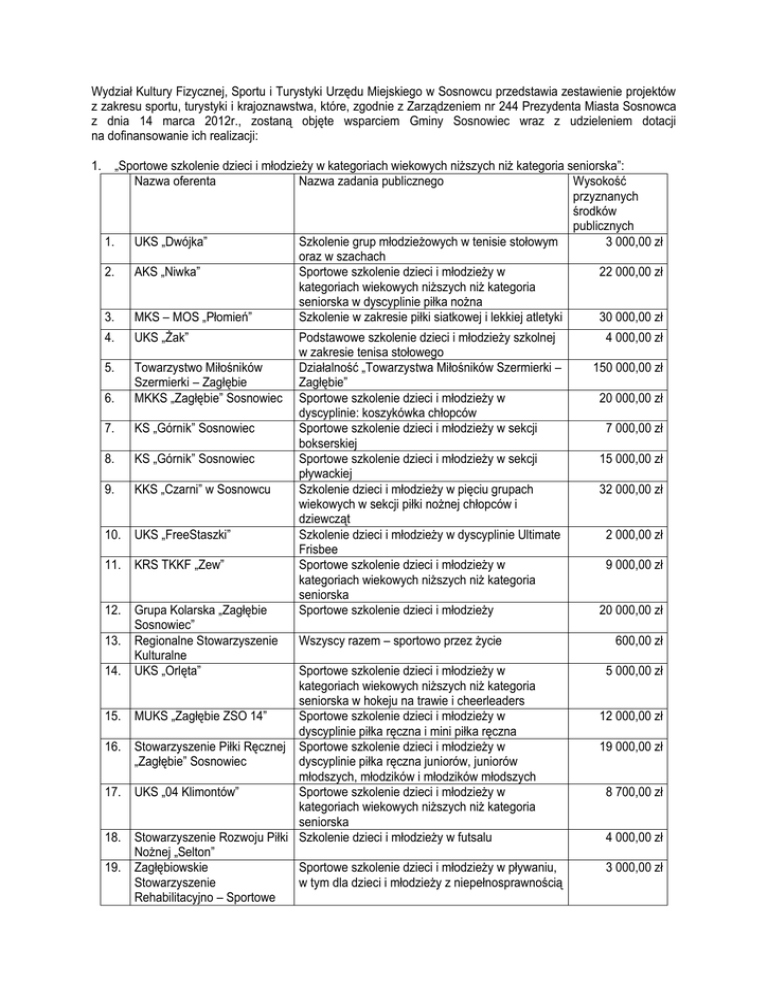 Wydział Kultury Fizycznej, Sportu i Turystyki Urzędu Miejskiego w Sosnowcu przedstawia zestawienie projektów z zakresu sportu, turystyki i krajoznawstwa, które, zgodnie z Zarządzeniem nr 244 Prezydenta Miasta Sosnowca z dnia 14 marca 2012r., zostaną objęte wsparciem Gminy Sosnowiec wraz z udzieleniem dotacji na dofinansowanie ich realizacji: 1. „Sportowe szkolenie dzieci i młodzieży w kategoriach wiekowych niższych niż kategoria seniorska”: Nazwa oferenta Nazwa zadania publicznego Wysokość przyznanych środków publicznych 1. UKS „Dwójka” Szkolenie grup młodzieżowych w tenisie stołowym 3 000,00 zł oraz w szachach 2. AKS „Niwka” Sportowe szkolenie dzieci i młodzieży w 22 000,00 zł kategoriach wiekowych niższych niż kategoria seniorska w dyscyplinie piłka nożna 3. MKS – MOS „Płomień” Szkolenie w zakresie piłki siatkowej i lekkiej atletyki 30 000,00 zł 4. UKS „Żak” 5. 6. Towarzystwo Miłośników Szermierki – Zagłębie MKKS „Zagłębie” Sosnowiec 7. KS „Górnik” Sosnowiec 8. KS „Górnik” Sosnowiec 9. KKS „Czarni” w Sosnowcu 10. UKS „FreeStaszki” 11. KRS TKKF „Zew” 12. Grupa Kolarska „Zagłębie Sosnowiec” 13. Regionalne Stowarzyszenie Kulturalne 14. UKS „Orlęta” 15. 16. 17. 18. 19. Podstawowe szkolenie dzieci i młodzieży szkolnej w zakresie tenisa stołowego Działalność „Towarzystwa Miłośników Szermierki – Zagłębie” Sportowe szkolenie dzieci i młodzieży w dyscyplinie: koszykówka chłopców Sportowe szkolenie dzieci i młodzieży w sekcji bokserskiej Sportowe szkolenie dzieci i młodzieży w sekcji pływackiej Szkolenie dzieci i młodzieży w pięciu grupach wiekowych w sekcji piłki nożnej chłopców i dziewcząt Szkolenie dzieci i młodzieży w dyscyplinie Ultimate Frisbee Sportowe szkolenie dzieci i młodzieży w kategoriach wiekowych niższych niż kategoria seniorska Sportowe szkolenie dzieci i młodzieży Wszyscy razem – sportowo przez życie Sportowe szkolenie dzieci i młodzieży w kategoriach wiekowych niższych niż kategoria seniorska w hokeju na trawie i cheerleaders MUKS „Zagłębie ZSO 14” Sportowe szkolenie dzieci i młodzieży w dyscyplinie piłka ręczna i mini piłka ręczna Stowarzyszenie Piłki Ręcznej Sportowe szkolenie dzieci i młodzieży w „Zagłębie” Sosnowiec dyscyplinie piłka ręczna juniorów, juniorów młodszych, młodzików i młodzików młodszych UKS „04 Klimontów” Sportowe szkolenie dzieci i młodzieży w kategoriach wiekowych niższych niż kategoria seniorska Stowarzyszenie Rozwoju Piłki Szkolenie dzieci i młodzieży w futsalu Nożnej „Selton” Zagłębiowskie Sportowe szkolenie dzieci i młodzieży w pływaniu, Stowarzyszenie w tym dla dzieci i młodzieży z niepełnosprawnością Rehabilitacyjno – Sportowe 4 000,00 zł 150 000,00 zł 20 000,00 zł 7 000,00 zł 15 000,00 zł 32 000,00 zł 2 000,00 zł 9 000,00 zł 20 000,00 zł 600,00 zł 5 000,00 zł 12 000,00 zł 19 000,00 zł 8 700,00 zł 4 000,00 zł 3 000,00 zł „Wulkan” 20. Rugby Klub Sportowy „Koliber” Sportowe szkolenie dzieci i młodzieży w 10 000,00 zł kategoriach wiekowych niższych niż kategoria seniorska – rugby 21. Zagłębie Sosnowiec S.A. Sportowe szkolenie dzieci i młodzieży w 200 680,00 zł kategoriach wiekowych niższych niż kategoria seniorska 22. UKS „Huragan” Dyscypliny sportowe: pływanie, tenis stołowy, tenis 24 000,00 zł ziemny, piłka nożna, brydż sportowy 23. KS „JAS – FBG” Udział w rozgrywkach i turniejach w koszykówce i 50 000,00 zł mini koszykówce dziewcząt 24. KS „Budowlani” Sportowe szkolenie dzieci i młodzieży w 30 000,00 zł dyscyplinie judo i ju – jitsu w kategoriach wiekowych niższych niż kategoria seniorska Razem 680 980,00 zł 2. „Przygotowanie do współzawodnictwa sportowego w kategorii seniorskiej oraz udział w tym współzawodnictwie”: Nazwa oferenta Nazwa zadania publicznego Wysokość przyznanych środków publicznych 1. UKS „Dwójka” III liga kobiet w tenisie stołowym – przygotowanie 2 000,00 zł oraz udział 2. AKS „Niwka” Przygotowanie do współzawodnictwa sportowego 12 000,00 zł w kategorii seniorskiej oraz udział w tym współzawodnictwie w dyscyplinie piłka nożna 3. MKS – MOS „Płomień” Ekstraklasa w LA 9 000,00 zł 4. Towarzystwo Miłośników Szermierki – Zagłębie MKKS „Zagłębie” Sosnowiec Działalność „Towarzystwa Miłośników Szermierki – Zagłębie” 5. Przygotowanie do współzawodnictwa sportowego w kategorii seniorskiej oraz udział w tym współzawodnictwie w dyscyplinie koszykówka męska 6. KKS „Czarni” w Sosnowcu Przygotowanie do współzawodnictwa sportowego w kategorii seniorskiej oraz udział w tym współzawodnictwie w dziedzinie kobiecej piłki nożnej na poziomie rozgrywek I ligi 7. KRS TKKF „Zew” Przygotowanie do współzawodnictwa sportowego w kategorii seniorskiej oraz udział w tym współzawodnictwie 8. KKS „Czarni” w Sosnowcu Przygotowanie do współzawodnictwa sportowego w kategorii seniorskiej oraz udział w tym współzawodnictwie w dziedzinie piłki nożnej męskiej na poziomie rozgrywek IV ligi 9. Stowarzyszenie Piłki Ręcznej Przygotowanie oraz udział we współzawodnictwie „Zagłębie” Sosnowiec w kategorii seniorskiej o Mistrzostwo II ligi piłki ręcznej mężczyzn 10. Zagłębiowskie Sportowe szkolenie w unihokeju na wózkach Stowarzyszenie inwalidzkich Rehabilitacyjno – Sportowe „Wulkan” 11. Rugby Klub Sportowy Przygotowanie do współzawodnictwa sportowego „Koliber” w kategorii seniorskiej oraz udział w tym 7 000,00 zł 4 000,00 zł 38 000,00 zł 3 000,00 zł 8 000,00 zł 12 000,00 zł 7 000,00 zł 4 000,00 zł współzawodnictwie – rugby 12. UKS „Huragan” 13. KS „JAS – FBG” Uczestnictwo w rozgrywkach III ligi mężczyzn tenisa stołowego drużyny UKS „Huragan” Sosnowiec oraz zawodach seniorskich przygotowanie drużyny do baraży o II ligę ŚlZTS Udział w