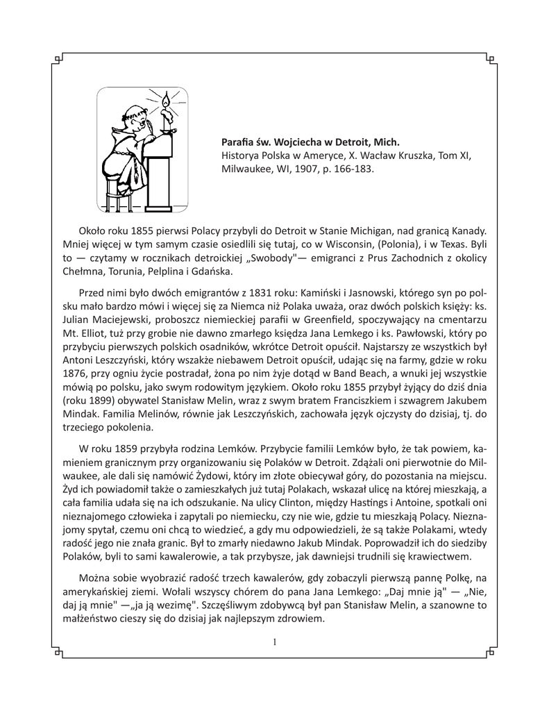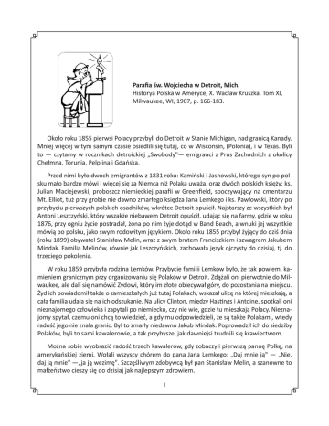 Parafia św. Wojciecha w Detroit, Mich. Historya Polska w Ameryce, X. Wacław Kruszka, Tom XI, Milwaukee, WI, 1907, p. 166-183. Około roku 1855 pierwsi Polacy przybyli do Detroit w Stanie Michigan, nad granicą Kanady. Mniej więcej w tym samym czasie osiedlili się tutaj, co w Wisconsin, (Polonia), i w Texas. Byli to — czytamy w rocznikach detroickiej „Swobody"— emigranci z Prus Zachodnich z okolicy Chełmna, Torunia, Pelplina i Gdańska. Przed nimi było dwóch emigrantów z 1831 roku: Kamiński i Jasnowski, którego syn po polsku mało bardzo mówi i więcej się za Niemca niż Polaka uważa, oraz dwóch polskich księży: ks. Julian Maciejewski, proboszcz niemieckiej parafii w Greenfield, spoczywający na cmentarzu Mt. Elliot, tuż przy grobie nie dawno zmarłego księdza Jana Lemkego i ks. Pawłowski, który po przybyciu pierwszych polskich osadników, wkrótce Detroit opuścił. Najstarszy ze wszystkich był Antoni Leszczyński, który wszakże niebawem Detroit opuścił, udając się na farmy, gdzie w roku 1876, przy ogniu życie postradał, żona po nim żyje dotąd w Band Beach, a wnuki jej wszystkie mówią po polsku, jako swym rodowitym językiem. Około roku 1855 przybył żyjący do dziś dnia (roku 1899) obywatel Stanisław Melin, wraz z swym bratem Franciszkiem i szwagrem Jakubem Mindak. Familia Melinów, równie jak Leszczyńskich, zachowała język ojczysty do dzisiaj, tj. do trzeciego pokolenia. W roku 1859 przybyła rodzina Lemków. Przybycie familii Lemków było, że tak powiem, kamieniem granicznym przy organizowaniu się Polaków w Detroit. Zdążali oni pierwotnie do Milwaukee, ale dali się namówić Żydowi, który im złote obiecywał góry, do pozostania na miejscu. Żyd ich powiadomił także o zamieszkałych już tutaj Polakach, wskazał ulicę na której mieszkają, a cała familia udała się na ich odszukanie. Na ulicy Clinton, między Hastings i Antoine, spotkali oni nieznajomego człowieka i zapytali po niemiecku, czy nie wie, gdzie tu mieszkają Polacy. Nieznajomy spytał, czemu oni chcą to wiedzieć, a gdy mu odpowiedzieli, że są także Polakami, wtedy radość jego nie znała granic. Był to zmarły niedawno Jakub Mindak. Poprowadził ich do siedziby Polaków, byli to sami kawalerowie, a tak przybysze, jak dawniejsi trudnili się krawiectwem. Można sobie wyobrazić radość trzech kawalerów, gdy zobaczyli pierwszą pannę Polkę, na amerykańskiej ziemi. Wołali wszyscy chórem do pana Jana Lemkego: „Daj mnie ją" — „Nie, daj ją mnie" —„ja ją wezimę". Szczęśliwym zdobywcą był pan Stanisław Melin, a szanowne to małżeństwo cieszy się do dzisiaj jak najlepszym zdrowiem. 1 Tymczasem Polacy ściągali zwolna do Detroit, nie znając się prawie wzajemnie. Wszyscy jednak chodzili do kościoła św. Józefa. Otóż idąc do kościoła, usłyszeli pionierzy polską rozmowę. Dwóch obcych mówiło ze sobą: „dobrze nam tu w Ameryce, ale cóż, kiedy nie mamy swego kościoła, nie mamy księdza, który by nas w naszym wyspowiadał języku, nie mamy kaznodziei, który by przemówił do serca." Był to żyjący do dziś dnia pan Wojciech Lorkowski i szwagier jego śp. Stanisław Świątek. Wtedy zbliżyli się do nich, zapoznali ze sobą i zaczęli się liczyć. Była ich dość już spora liczba, aby pomyśleć o założeniu bractwa kościelnego. Byli Karol i Franciszek Rohr, Jan i Marcin Kulwiccy, Stanisław Zientarski, Maks Ziętek, Leon Wolański, Jan Góra, Antoni Komis, familia Szpiglów, Tomasz Żółtowski, Jan Laza, Fr. Strzyżewski i jego trzech braci Jan, Józef i Antoni, Jan i Franciszek Szafran, Marcin, Antoni Jakub Ostrowscy. Dalej Jakub Richard, Józef Hildebrandt, Jakub Szymański, Antoni Żuchowiski, Jakub Jabłoński, Józef, Antoni i Jan Białk, Jan Rojewski, A. i Jakub Lorkowski, Michał Jeżewski, Marcin i Antoni Trepa, Fr. Góra, Maciej Kopydłowski, Fr. Ellwart. Największa część tych pierwszych osadników złączyła się w bractwo św. Stanisława Kostki, które do dziś dnia istnieje licząc kilkaset członków. Około roku 1871 było już Polaków (przeszło 300 familii, a w tym czasie rozpoczęli Niemcy katolicy budowanie nowego, wspaniałego kościoła św. Józefa. Polacy chcieli w składkach i budowie wziąć czynny udział, ale odpowiedziano im, że chociaż ich do parafii przyjmą, jednakowoż w nowym kościele ławki ich muszą stać oddzielnie. Wtedy dopiero pomyśleli o własnej świątyni. Raz po raz przyjeżdżał już tutaj ks. Wieczorek, C. R. z Parisville, Mich., spowiadał i kazał po polsku, zachęcając do odłączenia się od Niemców i założenia własnej parafii. Przed ks. Wieczorkiem C. R. zgłaszali się do Detroit księża, ale ich biskup Borghess odprawiał: „Było w Detroit — pisze ks. Wieczorek C. R. z Parisville 25 stycznia 1871 — już 4 kapłanów polskich starających się o miejsce, ale że byli dubae famae i tylko polski język posiadali, dlatego nie chciał ich Biskup przyjąć, chociaż w Detroit i innych miastach mojej diecezji jest mnóstwo Polaków i starają się o kapłanów polskich. Do Detroit dojeżdżam tylko letnią porą, jest tylko 6 godzin drogi ode mnie — innych zaś dopiero po jednym razie odwiedziłem." Tenże 16 lutego 1871 do Generała: „W Michigan jest bardzo wielu Polaków, i tu dom nasz może być bardzo trwały i pomocny innym domom, tylko aby nie zależał od niemieckiego" (domu w Kanadzie!) A ks. Bakanowski C. R. z Chicago 5 sierpnia 1871 do Generała: „Ks. Wieczorek pisze, że w Detroit bardzo wiele Polaków, więcej nawet niż u niego (w Parisville, Mich.), że chcą mieć OO. Zmartwychwstańców, sami od siebie posłali do niego petycję, fuit, vidit, a decyzję zostawił do wizyty tam drogiego Ojca. Byłoby to oczywiście dla nas lepszym niż Paryż, Mich. Gdyby się udało mieć polskie dwa domy w Chicago i w Detroit, moglibyśmy całej północnej stronie Stanów Zjednoczonych zadośćuczynić. I znowu pokusa opuszczenia T