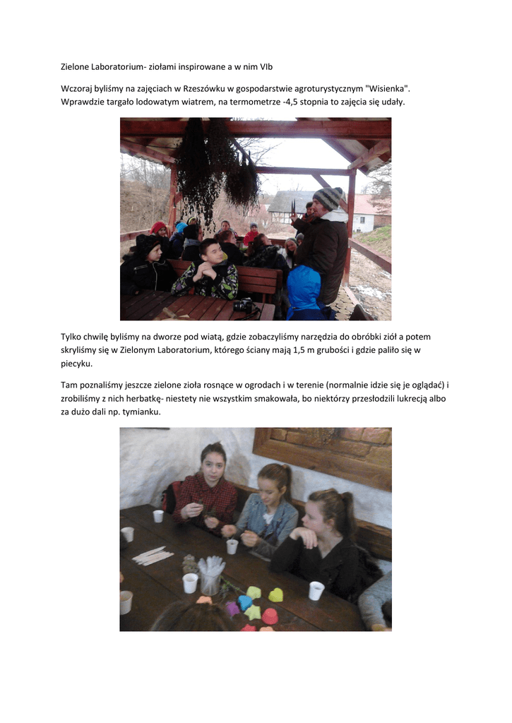 Zielone Laboratorium- ziołami inspirowane a w nim VIb Wczoraj byliśmy na zajęciach w Rzeszówku w gospodarstwie agroturystycznym "Wisienka". Wprawdzie targało lodowatym wiatrem, na termometrze -4,5 stopnia to zajęcia się udały. Tylko chwilę byliśmy na dworze pod wiatą, gdzie zobaczyliśmy narzędzia do obróbki ziół a potem skryliśmy się w Zielonym Laboratorium, którego ściany mają 1,5 m grubości i gdzie paliło się w piecyku. Tam poznaliśmy jeszcze zielone zioła rosnące w ogrodach i w terenie (normalnie idzie się je oglądać) i zrobiliśmy z nich herbatkę- niestety nie wszystkim smakowała, bo niektórzy przesłodzili lukrecją albo za dużo dali np. tymianku. W międzyczasie hulała destylatornia, w której produkowaliśmy olejek pomarańczowy. Gwoździem programu była produkcja własnego mydła- z uwagi na zbliżające się święta BN przeważały mydła cynamonowe z aromatem pomarańczowym. Na koniec usmażyliśmy kiełbaski i uciekliśmy do szkoły, bo na dworze była lodownia :( Polecam gorąco