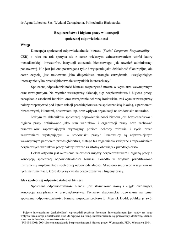 dr Agata Lulewicz-Sas, Wydział Zarządzania, Politechnika Białostocka Bezpieczeństwo i higiena pracy w koncepcji społecznej odpowiedzialności Wstęp Koncepcja społecznej odpowiedzialności biznesu (Social Corporate Responsibility – CSR) z roku na rok spotyka się z coraz większym zainteresowaniem wśród kadry menedŜerskiej, inwestorów, instytucji otoczenia biznesowego, jak równieŜ administracji państwowej. Nie jest juŜ ona postrzegana tylko i wyłącznie jako działalność filantropijna, ale coraz częściej jest traktowana jako długofalowa strategia zarządzania, uwzględniająca interesy nie tylko przedsiębiorstw ale wszystkich interesariuszy.1 Społeczną odpowiedzialność biznesu rozpatrywać moŜna w wymiarze wewnętrznym oraz zewnętrznym. Na wymiar wewnętrzny składają się: bezpieczeństwo i higiena pracy, zarządzanie zasobami ludzkimi oraz zarządzanie ochroną środowiska, zaś wymiar zewnętrzny naleŜy rozpatrywać pod kątem relacji przedsiębiorstwa ze społecznością lokalną, z partnerami biznesowymi, klientami, dostawcami itp. oraz wpływu organizacji na środowisko naturalne. Jednym ze składników społecznej odpowiedzialności biznesu jest bezpieczeństwo i higiena pracy definiowane jako stan warunków i organizacji pracy oraz zachowań pracowników zapewniających wymagany poziom ochrony zdrowia i Ŝycia przed zagroŜeniami występującymi w środowisku pracy.2 Pracownicy są najwaŜniejszym wewnętrznym partnerem przedsiębiorstwa, dlatego teŜ zagadnienia związane z zapewnieniem bezpiecznych warunków pracy naleŜy uwaŜać za istotny obowiązek przedsiębiorstw. Celem artykułu jest określenie zaleŜności między bezpieczeństwem i higieną pracy a koncepcją społecznej odpowiedzialności biznesu. Ponadto w artykule przedstawiono instrumenty implementacji społecznej odpowiedzialności. Skupiono się przede wszystkim na tych instrumentach, które dotyczą kwestii bezpieczeństwa i higieny pracy. Często wyróŜnia się następujące trzy aspekty Idea społecznej odpowiedzialności biznesu Społeczna odpowiedzialność biznesu jest stosunkowo nową i ciągle ewoluującą koncepcją zarządzania w przedsiębiorstwie. Pierwsze akademickie rozwaŜania na temat społecznej odpowiedzialności biznesu rozpoczął profesor E. Merrick Dodd, publikując swój 1 Pojęcie interesariuszy (stakeholders) wprowadził profesor Freeman. Interesariuszem jest kaŜdy na kogo wpływa firma swoją działalnością oraz kto wpływa na firmę. Interesariuszami są: pracownicy, dostawcy, klienci, społeczność lokalna, środowisko naturalne. 2 PN-N-18001: 2004 System zarządzania bezpieczeństwem i higieną pracy. Wymagania. PKN, Warszawa 2004. artykuł w The Harvard Law Review.3 Dodd podkreślił, Ŝe działania społecznie odpowiedzialne przynoszą korzyści całemu społeczeństwu, a nie tylko właścicielom firm. W latach 50 i 60 XX obserwowany był wzrost zainteresowania społeczną odpowiedzialnością biznesu4 szczególnie w Stanach Zjednoczonych. Od początku lat 90 XX wieku społeczna odpowiedzialność biznesu zaczęła zdobywać coraz większą popularność wśród teoretyków i praktyków z zakresu zarządzania. 5. W literaturze przedmiotu spotkać się moŜna z róŜnymi definicjami terminu społeczna odpowiedzialność biznesu. W wielu publikacjach przytacza się definicję Komisji Europejskiej opublikowaną w 2001 roku w Zielonej Księdze. Zgodnie z tą Księgą społeczna odpowiedzialność to koncepcja, zgodnie z którą przedsiębiorstwa dobrowolnie uwzględniają kwestie społeczne i ekologiczne w swojej działalności operacyjnej oraz w kontaktach z interesariuszami.6 Społeczna odpowiedzialność sprowadza się nie tylko do przestrzegania obowiązujących przepisów prawnych, ale takŜe wychodzi naprzeciw oczekiwaniom etycznym społeczeństwa.7 Koncepcja ta uwzględnia aspekty ekonomiczne, społeczne i ekologiczne.8 Precyzyjna definicja społecznej odpowiedzialności znalazła się w opublikowanej 1 listopada 2010 roku przez Międzynarodową Organizację Normalizacji normie ISO 26000. Społeczną odpowiedzialność zdefiniowano jako odpowiedzialność organizacji za wpływ jej decyzji i działań na społeczeństwo i środowisko, poprzez przejrzyste i etyczne zachowania, które: • przyczyniają się do zrównowaŜonego rozwoju, włączając zdrowie i dobrobyt społeczeństwa; • uwzględniają oczekiwania interesariuszy; • są zgodne z obowiązującym prawem i spójne z międzynarodowymi normami zachowania; 3 Dodd E. M., For whom are corporate manager trustees? Harvard Law Review 45 (7), 1932, 1145-1163. Carroll, A. B., Corporate social responsibility. Evolution of a definitional construct. Business and Society, 38, 1999, 268–295. 5 De Bakker, F. G. A., Groenewegen, P., & den Hond, F., A bibliometric analysis of 30 years of research and theory on corporate social responsibility and corporate social performance. Business and Society Review, 44, 2005, 283–317. 6 Green Paper, Promoting a European Framework for Corporate Social Responsibility, COM 366, Brussels 2001. 7 Carroll A. B., A three-dimensional conceptual model of corporate performance, Academy of Management Review 4 (4), 1979, 497-505. 8 Mikkila M., Toppinen A., Corporate responsibility reporting by large pulp and paper companies, Forest Policy and Economics 10, 2008, 500-506. 4 • są wprowadzone w całej organizacji i praktykowane w jej działaniach w obrębie jej strefy wpływów.9 Zagadnienia bezpieczeństwa i higieny pracy w koncepcji społecznej odpowiedzialności biznesu. Przegląd badań. W literaturze przedmiotu znaleźć moŜna nieliczne opracowania dotyczące analizy społecznej odpowiedzialności biznesu ze szczególnym uwzględnieniem aspektów bezpieczeństwa i higieny pracy. Dotychczasowe badania prowadzone były w następującym zakresie: • analiza związku między społeczną odpowiedzialnością a bezpieczeństwem pracy na poziomie przedsiębiorstwa, jak