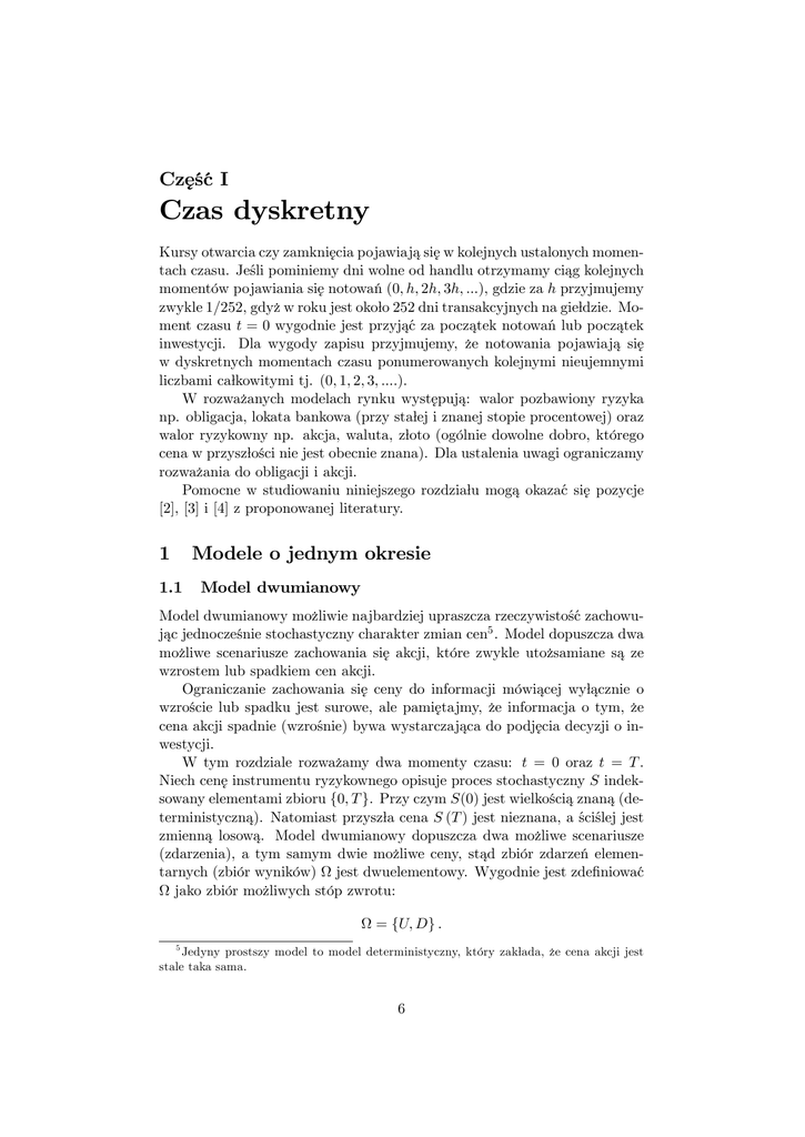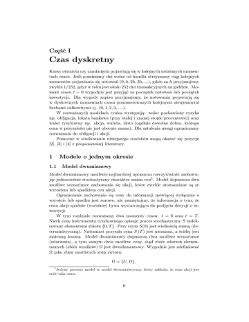 Cześć ¾ I Czas dyskretny Kursy otwarcia czy zamkniecia ¾ pojawiaja¾sie¾ w kolejnych ustalonych momentach czasu. Jeśli pominiemy dni wolne od handlu otrzymamy ciag ¾ kolejnych momentów pojawiania sie¾ notowań (0; h; 2h; 3h; :::), gdzie za h przyjmujemy zwykle 1=252, gdyz· w roku jest oko÷o 252 dni transakcyjnych na gie÷dzie. Moment czasu t = 0 wygodnie jest przyjać ¾ za poczatek ¾ notowań lub poczatek ¾ inwestycji. Dla wygody zapisu przyjmujemy, z·e notowania pojawiaja¾ sie¾ w dyskretnych momentach czasu ponumerowanych kolejnymi nieujemnymi liczbami ca÷ kowitymi tj. (0; 1; 2; 3; ::::). W rozwaz·anych modelach rynku wystepuj ¾ a: ¾ walor pozbawiony ryzyka np. obligacja, lokata bankowa (przy sta÷ej i znanej stopie procentowej) oraz walor ryzykowny np. akcja, waluta, z÷oto (ogólnie dowolne dobro, którego cena w przysz÷ ości nie jest obecnie znana). Dla ustalenia uwagi ograniczamy rozwaz·ania do obligacji i akcji. Pomocne w studiowaniu niniejszego rozdzia÷u moga¾ okazać sie¾ pozycje [2], [3] i [4] z proponowanej literatury. 1 Modele o jednym okresie 1.1 Model dwumianowy Model dwumianowy moz·liwie najbardziej upraszcza rzeczywistość zachowujac ¾ jednocześnie stochastyczny charakter zmian cen5 . Model dopuszcza dwa moz·liwe scenariusze zachowania sie¾ akcji, które zwykle utoz·samiane sa¾ ze wzrostem lub spadkiem cen akcji. Ograniczanie zachowania sie¾ ceny do informacji mówiacej ¾ wy÷acznie ¾ o wzroście lub spadku jest surowe, ale pamietajmy, ¾ z·e informacja o tym, z·e cena akcji spadnie (wzrośnie) bywa wystarczajaca ¾ do podjecia ¾ decyzji o inwestycji. W tym rozdziale rozwaz·amy dwa momenty czasu: t = 0 oraz t = T . Niech cene¾ instrumentu ryzykownego opisuje proces stochastyczny S indeksowany elementami zbioru f0; T g. Przy czym S(0) jest wielkościa¾znana¾(deterministyczna). ¾ Natomiast przysz÷a cena S (T ) jest nieznana, a ściślej jest zmienna¾ losowa. ¾ Model dwumianowy dopuszcza dwa moz·liwe scenariusze (zdarzenia), a tym samym dwie moz·liwe ceny, stad ¾ zbiór zdarzeń elementarnych (zbiór wyników) jest dwuelementowy. Wygodnie jest zde…niować jako zbiór moz·liwych stóp zwrotu: = fU; Dg . 5 Jedyny prostszy model to model deterministyczny, który zak÷ada, z·e cena akcji jest stale taka sama. 6 Wówczas gdzie S (T ) : fU; Dg ! S U (T ) ; S D (T ) , S D (T ) = S (0) (1 + D) S U (T ) = S (0) (1 + U ) przy czym 1 + U zwyk÷ o sie¾ interpretować jako wspó÷czynnik wzrostu (ang. up), a 1 + D jako wspó÷ czynnik spadku (ang. down). Cena akcji rośnie lub spada z odpowiednim prawdopodobieństwem P . Przyjmijmy, z·e: P (fU g) = p; P (fDg) = 1 p, gdzie 0 < p < 1. Sytuacja, w której p = 0 lub p = 1 oznacza model z jedna¾ cena, ¾ który nie jest dla nas interesujacy ¾ (nie jest modelem dwumianowym). Dla wygody bedziemy ¾ zapisywać P (f!g) jako P (!). Formalnie P jest odwzorowaniem, którego dziedzina¾ jest rodzina podzbiorów : F = f;; fU g ; fDg ; g ; przy czym P (;) = 0, P ( ) = 1. Zauwaz·my, z·e F jest cia÷ em (formalna de…nicja znajduje sie¾ w kursie Metody Matematyczne). Liczba p, określajaca ¾ prawdopodobieństwo zajścia zdarzenia ! = U , jednoznacznie wyznacza prawdopodobieństwo P . Moz·na zatem utoz·samiać p z P i na odwrót. Niech K bedzie ¾ zmienna¾ losowa¾ oznaczajac ¾ a¾ stope¾ zwrotu z inwestycji w instrument ryzykowny, zatem K= U z prawdopodobieństwem p D z prawdopodobieństwem 1 p Dla ustalenia porzadku ¾ zak÷adamy, z·e: D < U. Poniewaz· cena nie moz·e przyjmować wartości ujemnej, zatem 1 < D. Ostatecznie przyjmuje sie: ¾ 1 < D < U. Zilustrujmy na diagramie dynamik¾ e ceny akcji: S (0) (1 + U ) S (0) % & S (0) (1 + D) 7 Przyk÷ ad 3 Niech S (0) = 100; U = 0; 1; D = 0; 2 100 (1 + 0; 1) = 110 100 % & 100 (1 + ( 0; 2)) = 80 Uwaga 1 U oraz D kojarzone sa¾zwykle ze wzrostem (U > 0) oraz spadkiem ceny (D < 0) w porównaniu z poczatkow ¾ a¾ cena¾ akcji S (0), ale w ogólnej sytuacji tak by´c nie musi. Poni·zszy przyk÷ad ilustruje taka¾ sytuacje. ¾ Przyk÷ ad 4 S (0) = 100; U = 0; 1; D = 0; 2; T = 1 S D (1) = 100 (1 + ( 0; 2)) = 80 S U (1) = 100 (1 + ( 0; 1)) = 90 1.1.1 Strategie inwestycyjne Za÷ óz·my, z·e na rynku handluje sie¾ akcja¾ S. Dostepna ¾ jest równiez· inwestycja w pozbawiony ryzyka instrument A z rynku pienie¾z·nego - jest to tzw. rachunek rynku pienie¾z·nego (ang. money market account) realizowany przez obligacje. ¾ Przez A (0) i A (T ) bedziemy ¾ rozumieć wartość jednostki instrumentu A odpowiednio w chwilach t = 0 i t = T . Przyjmijmy, z·e A (T ) = A (0) (1 + R), gdzie R jest wolna¾ od ryzyka stopa¾ procentowa. ¾ Dla ustalenia uwagi zak÷adamy, z·e A (0) = 1. Liczbe¾ posiadanych w portfelu akcji oznaczać bedziemy ¾ przez x, a liczbe¾ jednostek rynku pienie¾z·nego przez y. Portfel inwestycyjny bedziemy ¾ utoz·samiać z para¾ liczb (x; y). Wartość portfela oznaczymy przez Vx;y . Wielkość ta zalez·y od wartości akcji i jednostki rynku pienie¾z·nego, stad: ¾ Vx;y = xS + yA. W danym momencie czasu trwania inwestycji wartość portfela wynosi Vx;y (0) = xS (0) + yA (0) oraz Vx;y (T ) = xS (T ) + yA (T ) . Poniewaz· cena akcji w chwili t = T jest losowa, stad ¾ wartość portfela w chwili t = T jest zmienna¾ losowa¾ przyjmujac ¾ a¾ wartość: ! Vx;y (T ) = xS ! (T ) + yA (T ) 8 z prawdopodobieństwem P (!), a konkretnie: Vx;y (T ) = xS U (T ) + yA (T ) . xS D (T ) + yA (T ) Zak÷ adamy, z·e ceny walorów w dowolnej chwili czasu sa¾ liczbami dodatnimi: S (0) > 0; S (T ) > 0; A (0) > 0; A (T ) > 0. Dla wygody prowadzenia rachunków zak÷adamy, z·e liczby posiadanych walorów moga¾ być dowolnymi liczbami rzeczywistymi tzn.: x 2 R i y 2 R. Zauwaz·my, z·e liczba posiadanych akcji czy obligacji moz·e być np. u÷amkiem. Innymi s÷ owy za÷ oz·yliśmy tzw. (doskona÷a) ¾ podzielność walorów. Powyz·sze za÷ oz·enie wymaga dodatkowego komentarza. Podzielność walorów próbuje sie¾ uzasadniać t÷ um