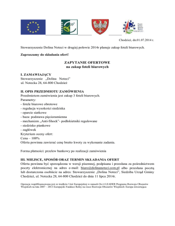 Chodzież, dn.01.07.2014 r. Stowarzyszenie Dolina Noteci w drugiej połowie 2014r planuje zakup foteli biurowych. Zapraszamy do składania ofert! ZAPYTANIE OFERTOWE na zakup foteli biurowych I. ZAMAWIAJĄCY Stowarzyszenie „Dolina Noteci” ul. Notecka 28, 64-800 Chodzież II. OPIS PRZEDMIOTU ZAMÓWIENIA Przedmiotem zamówienia jest zakup 3 foteli biurowych. Parametry: - fotele biurowe obrotowe - regulacja wysokości siedziska - oparcie siatkowe - baza: podstawa pięcioramienna - mechanizm „Anti-Shock”- podłokietniki regulowane - siedzisko piankowe - zagłówek Kryterium oceny ofert: Cena – 100% Oferta powinna zawierać cenę brutto kwoty za wykonanie zadania. Forma płatności: przelew bankowy po realizacji zamówienia III. MIEJSCE, SPOSÓB ORAZ TERMIN SKŁADANIA OFERT Oferta powinna być sporządzona w wersji pisemnej, podpisana i przesłana za pośrednictwem poczty elektronicznej na adres e-mail: [email protected] albo przesłana pocztą lub dostarczona osobiście na adres: Stowarzyszenie „Dolina Noteci”, Siedziba Urząd Gminy Chodzież, ul. Notecka 28, 64-800 Chodzież do dnia 11 lipca 2014r. Operacja współfinansowana jest ze środków Unii Europejskiej w ramach Osi 4 LEADER Programu Rozwoju Obszarów Wiejskich na lata 2007 – 2013 Europejski Fundusz Rolny na rzecz Rozwoju Obszarów Wiejskich: Europa inwestująca