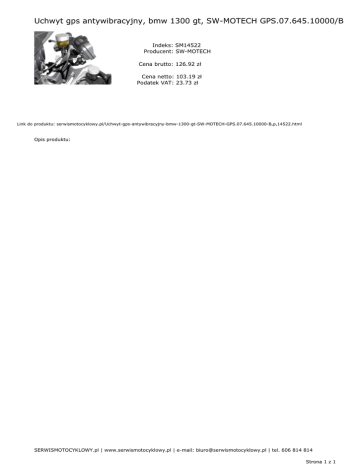 Uchwyt gps antywibracyjny, bmw 1300 gt, SW-MOTECH GPS.07.645.10000/B Indeks: SM14522 Producent: SW-MOTECH Cena brutto: 126.92 zł Cena netto: 103.19 zł Podatek VAT: 23.73 zł Link do produktu: serwismotocyklowy.pl/Uchwyt-gps-antywibracyjny-bmw-1300-gt-SW-MOTECH-GPS.07.645.10000-B,p,14522.html Opis produktu: SERWISMOTOCYKLOWY.pl | www.serwismotocyklowy.pl | e-mail: [email protected] | tel. 606 814 814 Strona 1 z 1