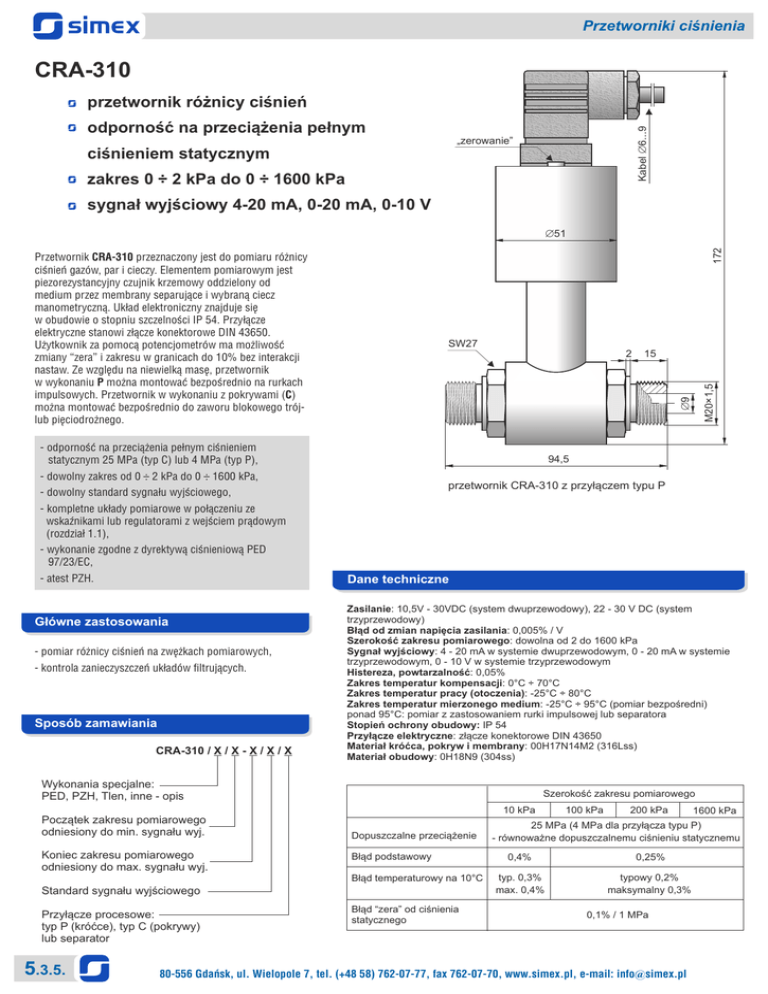 Przetworniki ciśnienia CRA-310 przetwornik różnicy ciśnień Kabel Ć 6...9 odporność na przeciążenia pełnym „zerowanie” ciśnieniem statycznym zakres 0 ÷ 2 kPa do 0 ÷ 1600 kPa sygnał wyjściowy 4-20 mA, 0-20 mA, 0-10 V 172 Ć 51 Przetwornik CRA-310 przeznaczony jest do pomiaru różnicy ciśnień gazów, par i cieczy. Elementem pomiarowym jest piezorezystancyjny czujnik krzemowy oddzielony od medium przez membrany separujące i wybraną ciecz manometryczną. Układ elektroniczny znajduje się w obudowie o stopniu szczelności IP 54. Przyłącze elektryczne stanowi złącze konektorowe DIN 43650. Użytkownik za pomocą potencjometrów ma możliwość zmiany “zera” i zakresu w granicach do 10% bez interakcji nastaw. Ze względu na niewielką masę, przetwornik w wykonaniu P można montować bezpośrednio na rurkach impulsowych. Przetwornik w wykonaniu z pokrywami (C) można montować bezpośrednio do zaworu blokowego trójlub pięciodrożnego. SW27 M20×1,5 15 Ć9 2 - odporność na przeciążenia pełnym ciśnieniem statycznym 25 MPa (typ C) lub 4 MPa (typ P), 94,5 - dowolny zakres od 0 ÷ 2 kPa do 0 ÷ 1600 kPa, przetwornik CRA-310 z przyłączem typu P - dowolny standard sygnału wyjściowego, - kompletne układy pomiarowe w połączeniu ze wskaźnikami lub regulatorami z wejściem prądowym (rozdział 1.1), - wykonanie zgodne z dyrektywą ciśnieniową PED 97/23/EC, - atest PZH. Dane techniczne Główne zastosowania - pomiar różnicy ciśnień na zwężkach pomiarowych, - kontrola zanieczyszczeń układów filtrujących. Sposób zamawiania CRA-310 / X / X - X / X / X Zasilanie: 10,5V - 30VDC (system dwuprzewodowy), 22 - 30 V DC (system trzyprzewodowy) Błąd od zmian napięcia zasilania: 0,005% / V Szerokość zakresu pomiarowego: dowolna od 2 do 1600 kPa Sygnał wyjściowy: 4 - 20 mA w systemie dwuprzewodowym, 0 - 20 mA w systemie trzyprzewodowym, 0 - 10 V w systemie trzyprzewodowym Histereza, powtarzalność: 0,05% Zakres temperatur kompensacji: 0°C ÷ 70°C Zakres temperatur pracy (otoczenia): -25°C ÷ 80°C Zakres temperatur mierzonego medium: -25°C ÷ 95°C (pomiar bezpośredni) ponad 95°C: pomiar z zastosowaniem rurki impulsowej lub separatora Stopień ochrony obudowy: IP 54 Przyłącze elektryczne: złącze konektorowe DIN 43650 Materiał króćca, pokryw i membrany: 00H17N14M2 (316Lss) Materiał obudowy: 0H18N9 (304ss) Wykonania specjalne: PED, PZH, Tlen, inne - opis Szerokość zakresu pomiarowego 10 kPa Początek zakresu pomiarowego odniesiony do min. sygnału wyj. Koniec zakresu pomiarowego odniesiony do max. sygnału wyj. Dopuszczalne przeciążenie Błąd podstawowy Błąd temperaturowy na 10°C Standard sygnału wyjściowego Przyłącze procesowe: typ P (króćce), typ C (pokrywy) lub separator 5.3.5. Błąd “zera” od ciśnienia statycznego 100 kPa 200 kPa 1600 kPa 25 MPa (4 MPa dla przyłącza typu P) - równoważne dopuszczalnemu ciśnieniu statycznemu 0,4% 0,25% typ. 0,3% max. 0,4% typowy 0,2% maksymalny 0,3% 0,1% / 1 MPa 80-556 Gdańsk, ul. Wielopole 7, tel. (+48 58) 762-07-77, fax 762-07-70, www.simex.pl, e-mail: [email protected]