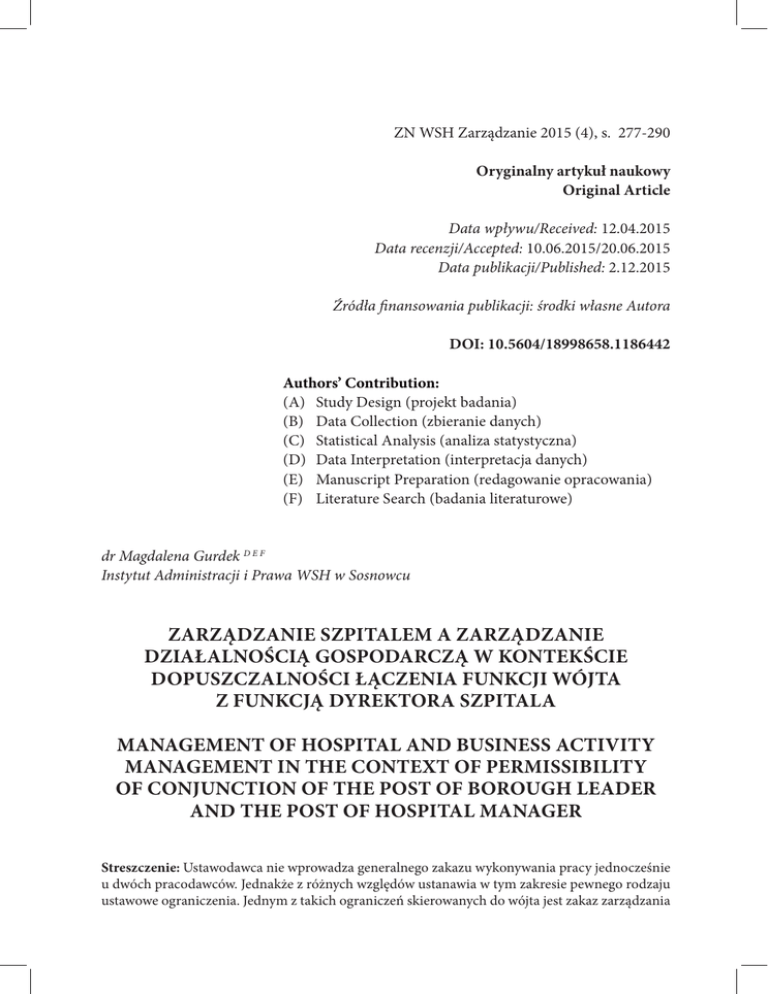 ZN WSH Zarządzanie 2015 (4), s. 277-290 Oryginalny artykuł naukowy Original Article Data wpływu/Received: 12.04.2015 Data recenzji/Accepted: 10.06.2015/20.06.2015 Data publikacji/Published: 2.12.2015 Źródła finansowania publikacji: środki własne Autora DOI: 10.5604/18998658.1186442 Authors’ Contribution: (A) Study Design (projekt badania) (B) Data Collection (zbieranie danych) (C) Statistical Analysis (analiza statystyczna) (D) Data Interpretation (interpretacja danych) (E) Manuscript Preparation (redagowanie opracowania) (F) Literature Search (badania literaturowe) dr Magdalena Gurdek D E F Instytut Administracji i Prawa WSH w Sosnowcu ZARZĄDZANIE SZPITALEM A ZARZĄDZANIE DZIAŁALNOŚCIĄ GOSPODARCZĄ W KONTEKŚCIE DOPUSZCZALNOŚCI ŁĄCZENIA FUNKCJI WÓJTA Z FUNKCJĄ DYREKTORA SZPITALA MANAGEMENT OF HOSPITAL AND BUSINESS ACTIVITY MANAGEMENT IN THE CONTEXT OF PERMISSIBILITY OF CONJUNCTION OF THE POST OF BOROUGH LEADER AND THE POST OF HOSPITAL MANAGER Streszczenie: Ustawodawca nie wprowadza generalnego zakazu wykonywania pracy jednocześnie u dwóch pracodawców. Jednakże z różnych względów ustanawia w tym zakresie pewnego rodzaju ustawowe ograniczenia. Jednym z takich ograniczeń skierowanych do wójta jest zakaz zarządzania 278 Zeszyty Naukowe Wyższej Szkoły Humanitas. Zarządzanie działalnością gospodarczą. Celem niniejszego opracowania jest dogłębna analiza przepisów ograniczających wójta w podejmowaniu dodatkowych zajęć i próba odpowiedzi, czy na kanwie tych przepisów dopuszczalne jest łączenie funkcji wójta z funkcją dyrektora szpitala. Jak się bowiem okazuje, nie zawsze pełnienie funkcji dyrektora szpitala stanowi zakazane zarządzanie cudzą działalnością gospodarczą. To, czy w danym przypadku mamy do czynienia z takim właśnie zarządzaniem, zależy od statusu prawnego podmiotu leczniczego, którego przedsiębiorstwo stanowi szpital. Status ten z kolei zależy od tego, kto jest jego tzw. organem założycielskim oraz od tego, w jakiej formie prowadzony jest dany podmiot leczniczy. Słowa kluczowe: zarządzanie szpitalem, zarządzanie działalnością gospodarczą, podmiot leczniczy, szpital jako przedsiębiorstwo, wójt, dyrektor szpitala, ograniczenia antykorupcyjne wójta Abstract: The legislator does not enforce a general interdiction of working for two employers simultaneously. However, some kind of legal restraint is established in this area due to various reasons. One of such restraints directed at a borough leader is the interdiction of business activity management. The aim of this study is a thorough analysis of the regulations restraining a borough leader from undertaking additional activities and an attempt to answer the question whether the conjunction of the post of borough leader and the post of hospital manager is permitted according to these regulations. As it turns out, it is not always the case that performing the post of a hospital manager is tantamount to the interdicted management of someone else’s business activity. Whether we are to do with such kind of management in a given case depends on the legal status of the medical entity whose enterprise is constituted by the hospital. On the other hand, this status depends on who is its so-called founding body and depends on the form in which a given medical entity is run. Keywords: management of hospital, business activity management, medical entity, hospital as an enterprise, borough leader, hospital manager, anti-corruption restrictions of a borough leader Wstęp W myśl art. 65 Konstytucji Rzeczypospolitej Polskiej1 każdemu zapewnia się wolność wyboru i wykonywania zawodu oraz wyboru miejsca pracy. Każdy ma zatem prawo decydowania o tym, gdzie, na jakim stanowisku i w jakim wymiarze czasu pracuje, w tym również czy zatrudniony zostaje u jednego, czy też może więcej pracodawców. Oczywiście, jak zawsze, ustawodawca przewidział pewne wyjątki od powyższej zasady, muszą one jednak zostać określone ustawą. Sposób nawiązania stosunku pracy, obowiązujące przy tym zasady, czas pracy w ramach tzw. etatu, prawa i obowiązki pracownika i pracodawcy itp. kwestie określone zostały w Kodeksie pracy2, przy czym ustawa ta nie wprowadza żadnych ograniczeń w zakresie dopuszczalności nawiązania równocześnie dwóch lub nawet więcej stosunków pracy przez tę samą osobę. Tak więc, co do zasady, każdy może nawiązać tyle stosunków pracy, ile uważa za stosowne, z wyjątkiem – jak już wspomniałam – przypadków, w których ustawy szczególne wprowadzają pewnego rodzaju ograniczenia. Konstytucja Rzeczypospolitej Polskiej z dnia 2 kwietnia 1997 roku, Dz.U. nr 78, poz. 483, ze zm. Ustawa z dnia 26 czerwca 1974 roku Kodeks pracy, Dz.U. z 2014 r., poz. 1502, ze zm.; dalej zwana k.p. 1 2 Zarządzanie szpitalem a zarządzanie działalnością gospodarczą w kontekście... 279 Dodatkowo pamiętać należy, iż wiele czynności zawodowych można wykonywać również na podstawie umów cywilnoprawnych. Kodeks cywilny3 natomiast nie ogranicza stron co do ilości zawieranych umów czy też możliwości zawierania ich w razie pozostawania już przez daną stronę w stosunku pracy. W świetle powyższego, przedmiotem niniejszych rozważań chciałabym uczynić kwestię dopuszczalności łączenia zatrudnienia na stanowisku wójta z pełnieniem funkcji dyrektora szpitala. O ile bowiem prawodawca nie przewiduje generalnego zakazu łączenia stanowiska wójta z innym zatrudnieniem, o tyle, z uwagi na funkcje, jakie on pełni i możliwość powstawania różnego rodzaju konfliktu „interesów” czy niepożądanych zależności w razie sprawowania przez niego równocześnie innych funkcji, przewidział w tym zakresie pewne wyjątki. Są to właśnie te wyjątki, o których wspominałam na wstępie, a do których odsyła art. 65 Konstytucji. 1. Zakazane wójtowi prowadzenie działalności gospodarczej Najważniejsze ograniczenia wójta w zakresie możliwości pode