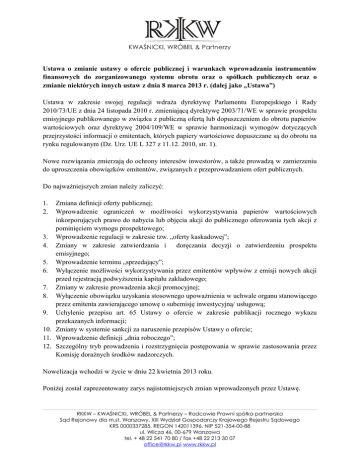 Ustawa o zmianie ustawy o ofercie publicznej i warunkach wprowadzania instrumentów finansowych do zorganizowanego systemu obrotu oraz o spółkach publicznych oraz o zmianie niektórych innych ustaw z dnia 8 marca 2013 r. (dalej jako „Ustawa”) Ustawa w zakresie swojej regulacji wdraża dyrektywę Parlamentu Europejskiego i Rady 2010/73/UE z dnia 24 listopada 2010 r. zmieniającą dyrektywę 2003/71/WE w sprawie prospektu emisyjnego publikowanego w związku z publiczną ofertą lub dopuszczeniem do obrotu papierów wartościowych oraz dyrektywę 2004/109/WE w sprawie harmonizacji wymogów dotyczących przejrzystości informacji o emitentach, których papiery wartościowe dopuszczane są do obrotu na rynku regulowanym (Dz. Urz. UE L 327 z 11.12. 2010, str. 1). Nowe rozwiązania zmierzają do ochrony interesów inwestorów, a także prowadzą w zamierzeniu do uproszczenia obowiązków emitentów, związanych z przeprowadzaniem ofert publicznych. Do najważniejszych zmian należy zaliczyć: 1. 2. Zmiana definicji oferty publicznej; Wprowadzenie ograniczeń w możliwości wykorzystywania papierów wartościowych inkorporujących prawo do nabycia lub objęcia akcji do publicznego oferowania tych akcji z pominięciem wymogu prospektowego; 3. Wprowadzenie regulacji w zakresie tzw. „oferty kaskadowej”; 4. Zmiany w zakresie zatwierdzania i doręczania decyzji o zatwierdzeniu prospektu emisyjnego; 5. Wprowadzenie terminu „sprzedający”; 6. Wyłączenie możliwości wykorzystywania przez emitentów wpływów z emisji nowych akcji przed rejestracją podwyższenia kapitału zakładowego; 7. Zmiany w zakresie prowadzenia akcji promocyjnej; 8. Wyłączenie obowiązku uzyskania stosownego upoważnienia w uchwale organu stanowiącego przez emitenta zawierającego umowę o subemisję inwestycyjną/ usługową; 9. Uchylenie przepisu art. 65 Ustawy o ofercie w zakresie publikacji rocznego wykazu przekazanych informacji; 10. Zmiany w systemie sankcji za naruszenie przepisów Ustawy o ofercie; 11. Wprowadzenie definicji „dnia roboczego”; 12. Szczególny tryb prowadzenia i rozstrzygnięcia postępowania w sprawie zastosowania przez Komisję doraźnych środków nadzorczych. Nowelizacja wchodzi w życie w dniu 22 kwietnia 2013 roku. Poniżej został zaprezentowany zarys najistotniejszych zmian wprowadzonych przez Ustawę. RKKW – KWAŚNICKI, WRÓBEL & Partnerzy – Radcowie Prawni spółka partnerska Sąd Rejonowy dla m.st. Warszawy, XIII Wydział Gospodarczy Krajowego Rejestru Sądowego KRS 0000337285, REGON 142011396, NIP 521-354-00-88 ul. Wilcza 46, 00-679 Warszawa tel. + 48 22 541 70 80 / fax +48 22 213 30 07 [email protected] www.rkkw.pl 1. Zmiana definicji oferty publicznej Nowela z dnia 8 marca 2013 r. redefiniuje pojęcie oferty publicznej. Zgodnie z nowym brzmieniem art. 3 Ustawy o ofercie, ofertą publiczną jest udostępnianie co najmniej 150 osobom lub nieoznaczonemu adresatowi, w dowolnej formie i w dowolny sposób, informacji o papierach wartościowych i warunkach ich nabycia, stanowiących wystarczającą podstawę do podjęcia przez nich decyzji w sprawie nabycia tych papierów wartościowych. Ustawodawca zrezygnował ponadto z przesłanki odpłatności nabycia papierów wartościowych jako elementu definicji oferty publicznej. Usunięte zostały również przepisy dotyczące „publicznego proponowania nabycia instrumentów finansowych”, ze względu na brak takiej definicji w Dyrektywie 2003/71/WE. 2. Wprowadzenie ograniczeń w możliwości wykorzystywania papierów wartościowych inkorporujących prawo do nabycia lub objęcia akcji do publicznego oferowania tych akcji z pominięciem wymogu prospektowego; W związku z istniejącą praktyką wykorzystywania konstrukcji papierów wartościowych inkorporujących prawo do nabycia lub objęcia akcji (np. warrantów subskrypcyjnych) do de facto publicznego oferowania tych akcji z pominięciem wymogu prospektowego, Ustawa wprowadziła doprecyzowanie przepisów Ustawy o ofercie tak, by wyeliminować sztuczne konstruowanie oferty akcji poprzez ofertę tego rodzaju papierów wartościowych. 3. Wprowadzenie regulacji w zakresie tzw. „oferty kaskadowej” Na podstawie brzmienia nowego art. 15a Ustawy o ofercie, emitent papierów objętych lub nabytych albo tych, które mają być objęte lub nabyte przez bank, instytucję kredytową, firmę inwestycyjną, zagraniczną firmę inwestycyjną lub konsorcjum tych podmiotów, może udzielić pisemnej zgody na ich sprzedaż przez te podmioty, w ich imieniu i na ich rachunek, w drodze oferty publicznej, na podstawie prospektu emisyjnego sporządzonego przez tego emitenta. Konstrukcja pozwala emitentowi pozyskać potrzebne środki finansowe w stosunkowo krótkim czasie. Dokonuje on transakcji tylko z wyspecjalizowanymi w tym zakresie podmiotami, którymi są instytucje finansowe pełniące rolę subemitenta. Te natomiast sprzedają papiery wartościowe następnym instytucjom. Zbycie papierów pomiędzy poszczególnymi poziomami odbywa się najczęściej w trybie oferty niepublicznej, natomiast ostatni etap stanowi zazwyczaj ofertę publiczną skierowaną ku inwestorom detalicznym. W celu zabezpieczenia obrotu akcjami, a także wzmocnienia nadzoru Komisji Nadzoru Finansowego, ustawodawca zdecydował ograniczyć „ofertę kaskadową” jedynie do papierów o charakterze nieudziałowym, tj. z wyłączeniem akcji. 2 KWAŚNICKI, WRÓBEL & Partnerzy ul. Wilcza 46, 00-679 Warszawa [email protected] www.rkkw.pl 4. Zmiany w zakresie zatwierdzania i emisyjnego doręczania decyzji o zatwierdzeniu prospektu Ustawodawca przewidział nowy sposób doręczenia decyzji (w całości uwzględniających żądanie strony), które od tej pory możliwe jest przez publikację na stronie internetowej Komisji Nadzoru Finansowego. Wprowadzono obowiązek po stronie emitenta lub sprzedającego do przekazania Komisji Nadzoru Finansowego, prospektu emisyjnego w formie papierowej i elektronicznej niezwłocznie po jego zatwie