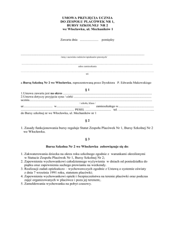 UMOWA PRZYJĘCIA UCZNIA DO ZESPOŁU PLACÓWEK NR 1, BURSY SZKOLNEJ NR 2 we Włocławku, ul. Mechaników 1 Zawarta dnia ....................... pomiędzy ......................................................................................................................................................... /imię i nazwisko rodziców/opiekunów prawnych/ ………………………………………………………………………………………………….………. adres zamieszkania …………………………………………………………………………………………………………………………………………………….. tel. a Bursą Szkolną Nr 2 we Włocławku, reprezentowaną przez Dyrektora P. Edwarda Makowskiego §1 1.Umowa zawarta jest na okres .............................................................................................................. 2.Umowa dotyczy przyjęcia syna / córki ................................................................................................ ucznia........................................................................................................................................................ / szkoła, klasa / ur.................................... w......................................... zamieszkałego w............................................ .................................................................. PESEL ................................ tel. ………………………….... do Bursy szkolnej nr we Włocławku, ul. Mechaników nr 1 §2 1. Zasady funkcjonowania bursy reguluje Statut Zespołu Placówek Nr 1, Bursy Szkolnej Nr 2 we Włocławku. §3 Bursa Szkolna Nr 2 we Włocławku zobowiązuje się do: 1. Zakwaterowania dziecka na okres roku szkolnego zgodnie z warunkami określonymi w Statucie Zespołu Placówek Nr 1, Bursy Szkolnej Nr 2; 2. Zapewnienia wychowankowi całodziennego wyżywienia w dniach od poniedziałku do piątku oraz zapewnienia suchego prowiantu na weekendy. 3. Realizacji zadań opiekuńczo – wychowawczych zgodnie z Ustawą o systemie oświaty z dnia 7 września 1991 roku, statutem placówki; 4. Zapewnienia wychowankowi opieki i bezpieczeństwa na terenie placówki oraz podczas zajęć organizowanych w placówce i poza jej terenem;. 5. Zameldowania wychowanka na pobyt czasowy. §4 Rodzice/opiekunowie prawni zobowiązują się do: 1. Regularnego wnoszenia opłaty za pobyt Dziecka w Bursie Szkolnej Nr 2 : a/ za zakwaterowanie – 60 zł. (miesiąc) b/ za wyżywienie – 10 zł. (dzień) c/ kaucja zwrotna – 50 zł. (roczna) 2. Respektowania zasad pobytu Dziecka w bursie określonych w Statucie Zespołu Placówek , Bursy Szkolnej Nr 2 we Włocławku; 3. Przestrzegania obowiązujących praw i obowiązków mieszkańca określonych w Statucie Zespołu Placówek Nr 1, Bursy Szkolnej Nr 2 we Włocławku ; 4. Współdziałania z wychowawcą w zakresie opieki i wychowania, a w przypadku choroby odebrania dziecka z bursy; 5. Pokrycia kosztów zniszczenia lub uszkodzenia mienia Bursy spowodowanych przez dziecko (z kaucji 50 zł) §5 1. Bursa Szkolna Nr 2 zastrzega sobie prawo do zmiany wysokości opłaty za zakwaterowanie i wyżywienie w ciągu roku szkolnego bez zmiany niniejszej umowy. 2. O zmianie wysokości dziennej stawki żywieniowej i zmianie opłaty za zakwaterowanie rodzic/opiekun prawny będzie powiadomiony. 3. Prowiantowanie się na wszystkie posiłki jest obowiązkowe. §6 1. Rodzic/opiekun prawny zobowiązuje się do płacenia należności o których mowa w § 4 ust. 1 pkt. 1 litera a i b najpóźniej w terminie do dnia 15 – tego każdego miesiąca za dany miesiąc na konto lub w kasie bursy. 2. Za zwłokę w uiszczaniu opłat za zakwaterowanie i wyżywienie będą naliczane odsetki karne w wysokości odsetek ustawowych. 4. W przypadku nie uiszczenia przez rodzica/opiekuna prawnego opłat za zakwaterowanie i wyżywienie za okres do dwóch m-cy wychowanek będzie skreślony z listy mieszkańców, a bursa wystąpi do Sądu z powództwem o zwrot należności powiększonej o odsetki, a także może wystąpić o umieszczenia dłużnika w Krajowym Rejestrze Dłużników. §7 1.Dyrektor Bursy Szkolnej Nr 2 może obniżyć wysokość opłat za wyżywienie do wysokości proporcjonalnej do liczby dni nieobecności dziecka w bursie. 2. Obniżenie opłaty za wyżywienie uwzględnia się od następnego dnia po zgłoszeniu przez rodzica/opiekuna prawnego (osobistym lub telefonicznie) nieobecności dziecka w bursie 3.Obniżenia w/w płatności nalicza się tylko w przypadku zwrócenia kart żywieniowych za każdy niewykorzystany pełen dzień żywieniowy. §8 1.Dyrektor Bursy Szkolnej Nr 2 może obniżyć wysokość opłat za pobyt Dziecka w bursie do wysokości – 30 zł. jeżeli pobyt Dziecka liczy się przez okres połowy miesiąca tj. do 15-go lub od 15-go danego miesiąca. §9 1.Rodzice/opiekunowie prawni wyrażają zgodę na samodzielny powrót dziecka z bursy do domu i biorą za nie w tym czasie pełną odpowiedzialność. Wychowankowie zobowiązani są do wpisywania się do „Ewidencji wyjazdów i powrotów”, w których potwierdzają wyjazdy z bursy i przyjazdy do bursy. 2.Rodzice zobowiązani są do poinformowania wychowawcy o stanie zdrowia dziecka będącego pod stałą opieką lekarza specjalisty oraz do dostarczenia stosownego zaświadczenia lekarskiego o braku przeciwwskazań do zamieszkania w bursie. 3.Rodzice/opiekunowie prawni zaopatrują dzieci w lekarstwa i inne środki medyczne. W przypadku choroby wychowanka, wychowawca powiadamia jego rodziców/opiekunów prawnych, którzy niezwłocznie powinni odebrać dziecko z bursy. 4.W uzasadnionych przypadkach do chorego dziecka może zostać wezwane pogotowie ratunkowe. 5.W sytuacji spożycia przez wychowanka alkoholu lub zażycia środków odurzających, rodzice/opiekunowie prawni powiadamiani są niezwłocznie o zaistniałej sytuacji telefonicznie oraz zobowiązani są do przyjazdu po dziecko. 