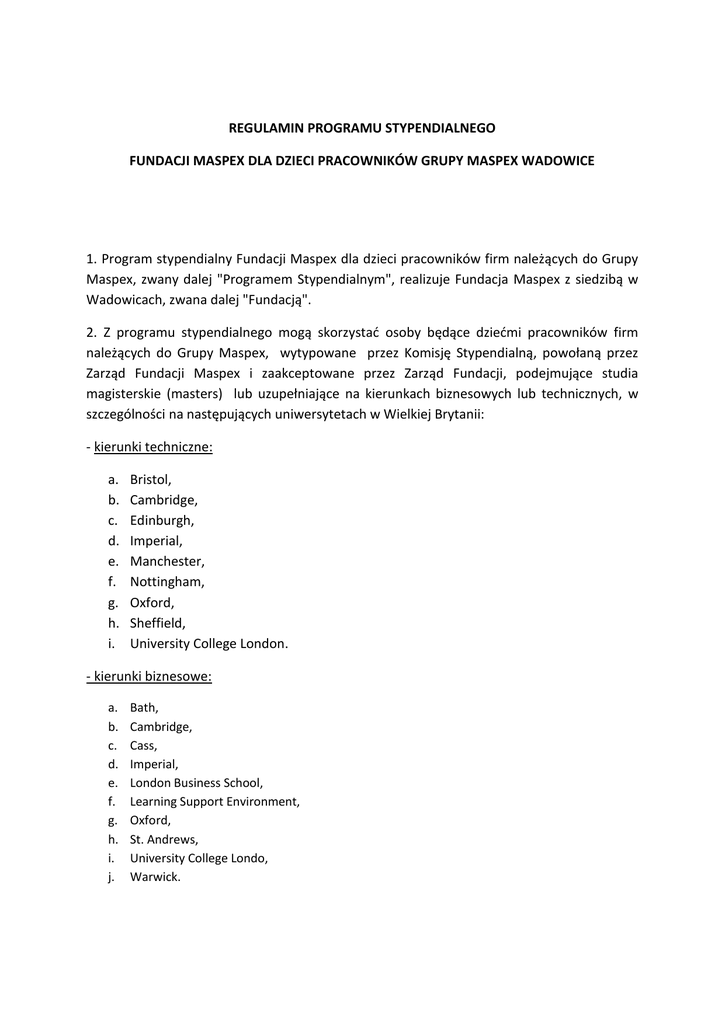 REGULAMIN PROGRAMU STYPENDIALNEGO FUNDACJI MASPEX DLA DZIECI PRACOWNIKÓW GRUPY MASPEX WADOWICE 1. Program stypendialny Fundacji Maspex dla dzieci pracowników firm należących do Grupy Maspex, zwany dalej "Programem Stypendialnym", realizuje Fundacja Maspex z siedzibą w Wadowicach, zwana dalej "Fundacją". 2. Z programu stypendialnego mogą skorzystad osoby będące dziedmi pracowników firm należących do Grupy Maspex, wytypowane przez Komisję Stypendialną, powołaną przez Zarząd Fundacji Maspex i zaakceptowane przez Zarząd Fundacji, podejmujące studia magisterskie (masters) lub uzupełniające na kierunkach biznesowych lub technicznych, w szczególności na następujących uniwersytetach w Wielkiej Brytanii: - kierunki techniczne: a. b. c. d. e. f. g. h. i. Bristol, Cambridge, Edinburgh, Imperial, Manchester, Nottingham, Oxford, Sheffield, University College London. - kierunki biznesowe: a. b. c. d. e. f. g. h. i. j. Bath, Cambridge, Cass, Imperial, London Business School, Learning Support Environment, Oxford, St. Andrews, University College Londo, Warwick. Z programu stypendialnego mogą również skorzystad osoby podejmujące magisterskie studia na kierunkach biznesowych lub technicznych w wyższych szkołach za granicą innych niż wymienione powyżej, pod warunkiem wcześniejszego uzyskania pozytywnej opinii Zarządu Fundacji. 3. Wsparcie finansowe corocznie może otrzymad do 6 studentów, chyba, że Zarząd Fundacji po zapoznaniu się z opinią Komisji Stypendialnej uzna inaczej. 4. Warunkiem ubiegania się o stypendium jest udokumentowanie ukooczenia studiów licencjackich lub magisterskich na dowolnych kierunkach lub statusu studenta dowolnych studiów magisterskich w chwili składania wniosku. 5. Warunkiem wypłaty stypendium będzie przedstawienie przez kandydata dokumentów potwierdzających przyjęcie na studia zagraniczne o profilu biznesowym lub technicznym i dowodów potwierdzających rzeczywistą wysokośd ponoszonych przez niego opłat za studia, względnie także innych kosztów związanych ze studiami za granicą, z uwzględnieniem przyznanej z innych źródeł pomocy, a w szczególności stypendium przyznanego przez uniwersytet. 6. Kandydat pragnący skorzystad z Programu Stypendialnego powinien przesład na adres [email protected] dokumenty, o których wspomina punkt 5 Regulaminu. 7. Fundacja może uzależnid zawarcie umowy stypendialnej od przedstawienia przez kandydata dodatkowych informacji, dotyczących w szczególności jego sytuacji osobistej, zawodowej lub majątkowej. 8. Wybrani kandydaci otrzymają propozycję zawarcia umowy stypendialnej z Fundacją, która przewidywad będzie częściowe lub całkowite pokrycie opłaty za studia. Umowa może przewidywad również częściowe lub całkowite pokrycie innych kosztów związanych ze studiami za granicą, także w formie zryczałtowanej. Kwoty stypendium będą wypłacone przez Fundację zgodnie z obowiązującymi przepisami prawa podatkowego. 9. Umowa stypendialna określad może zasady całkowitego lub częściowego zwrotu pomocy materialnej otrzymanej przez studenta od Fundacji, w przypadku przedterminowego rozwiązania umowy, z powodu przerwania nauki, nie uzyskania absolutorium i tytułu naukowego magistra, względnie innego naruszenia przez osobę zawierającą umowę jej warunków. 10. W ramach programu stypendialnego Fundacji Maspex prowadzony jest program Helpline. 11. Kandydat, który chce skorzystad z Programu Helpline powinien przesład na adres [email protected] informację o woli przystąpienia do programu. 12. Program Helpline jest prowadzony w oparciu o poniższe działania: 1) Wstępną konsultację przeprowadzoną za pomocą poczty e-mail mającą na celu odpowiednie ukierunkowanie kandydata: a) asysta przy wyborze uczelni i programów pasujących do kandydata. b) omówienie procesu rekrutacji na wybranych uczelniach. c) Konsultacje esejów oraz szkicu CV. d) Pomoc przy wyborze osób rekomendujących. e) dostęp do rozbudowanego dokumentu pytao i odpowiedzi zarówno odnośnie samej rekrutacji, jak i życia w Wielkiej Brytanii (zakwaterowanie, życie studenckie, konferencje, itp.). 2) Finalną konsultację przygotowanej przez kandydata aplikacji (skype / telefon), obejmującą: a) ocenę i analizę przesłanych esejów oraz CV uzupełnioną ewaluacją poprzez e-mail na temat obszarów, które wymagają poprawy, bądź uzupełnienia. b) ocenę przydatności i wybór referencji. c) odpowiedź na pytania związane z dalszym procesem aplikacji, jak i z późniejszymi studiami w Wielkiej Brytanii. 13. Wszelkie zmiany niniejszego regulaminu, przyjęte przez Zarząd Fundacji, obowiązywad będą od chwili opublikowania nowej wersji regulaminu na stronie internetowej Fundacji, chyba, że uchwała Zarządu o zmianie regulaminu wprowadzi inny termin wejścia w życie zmiany.